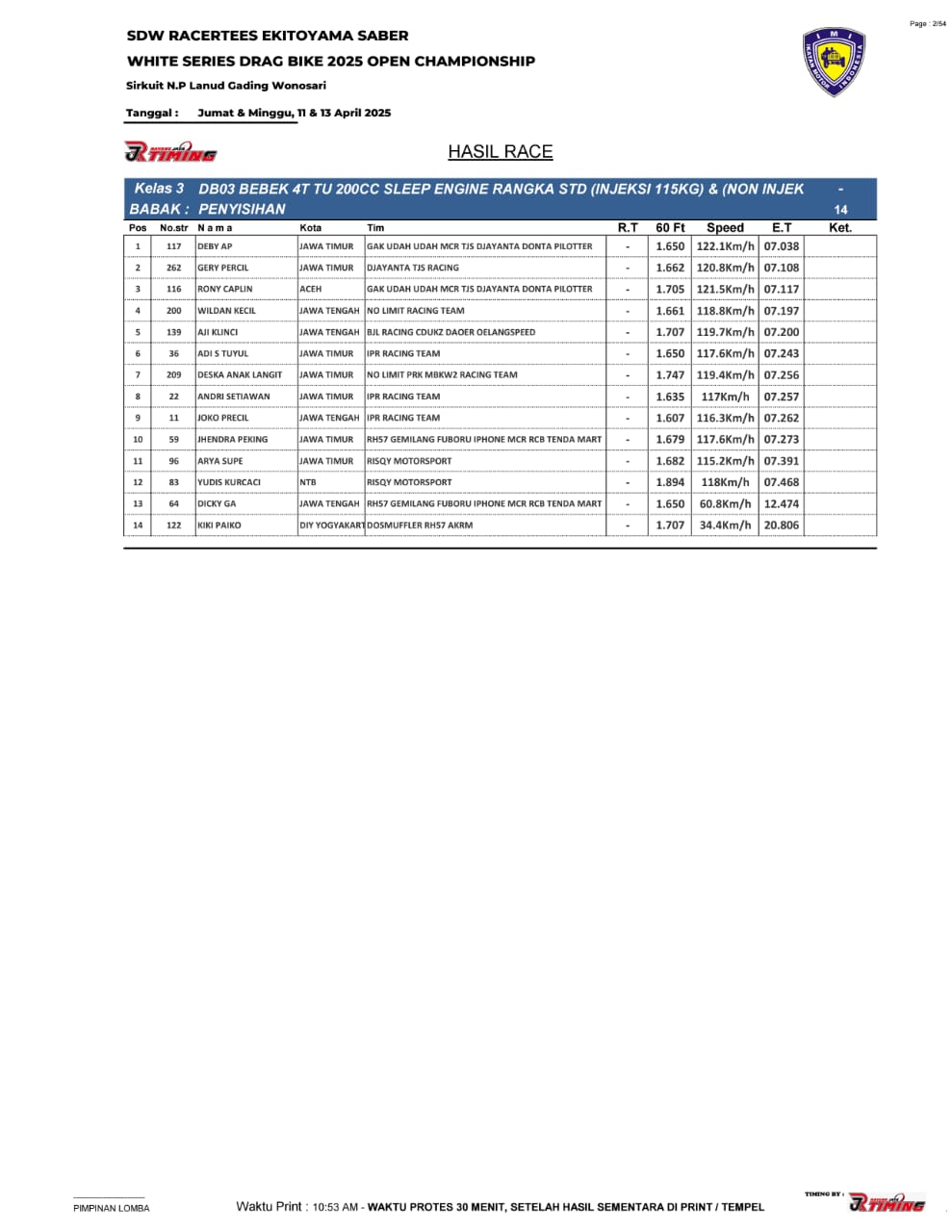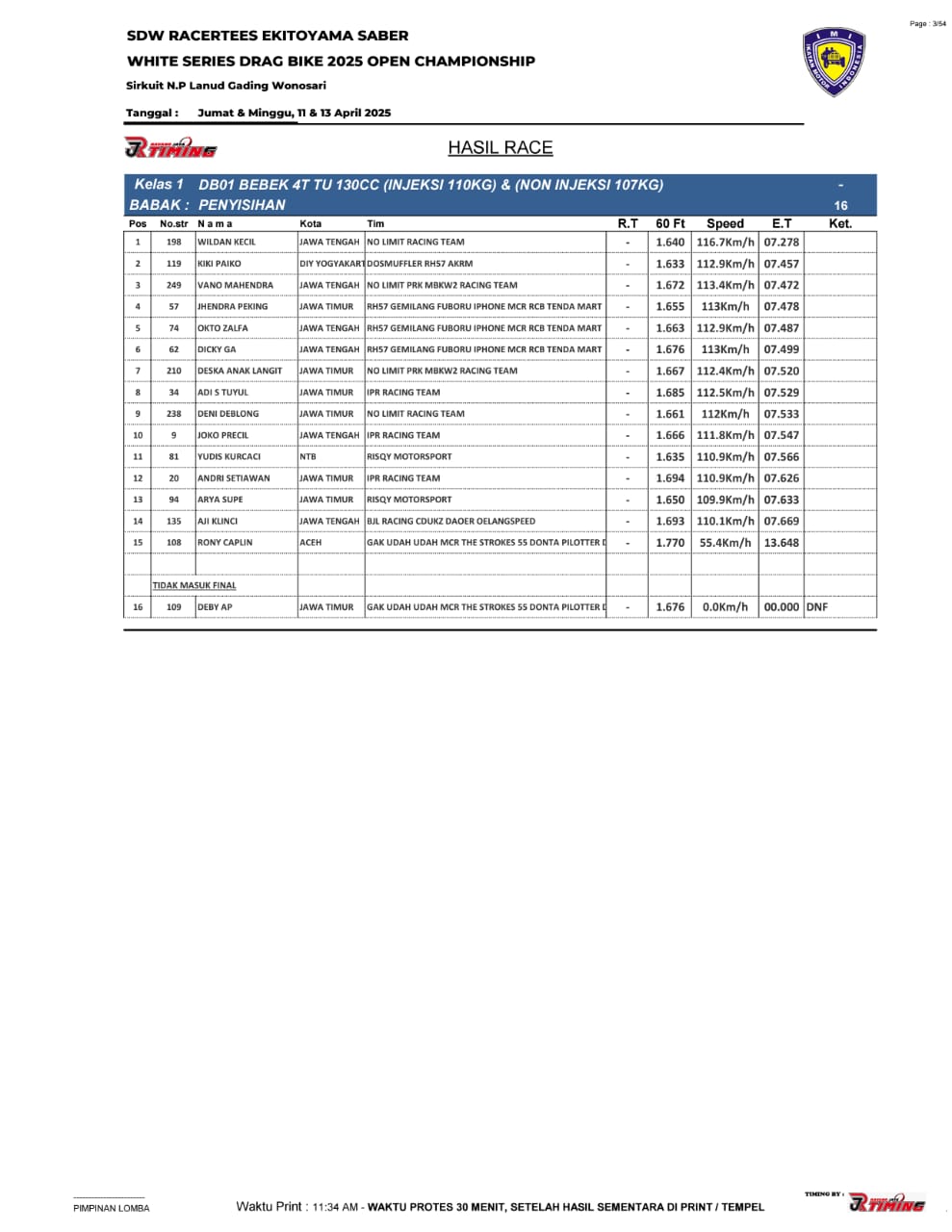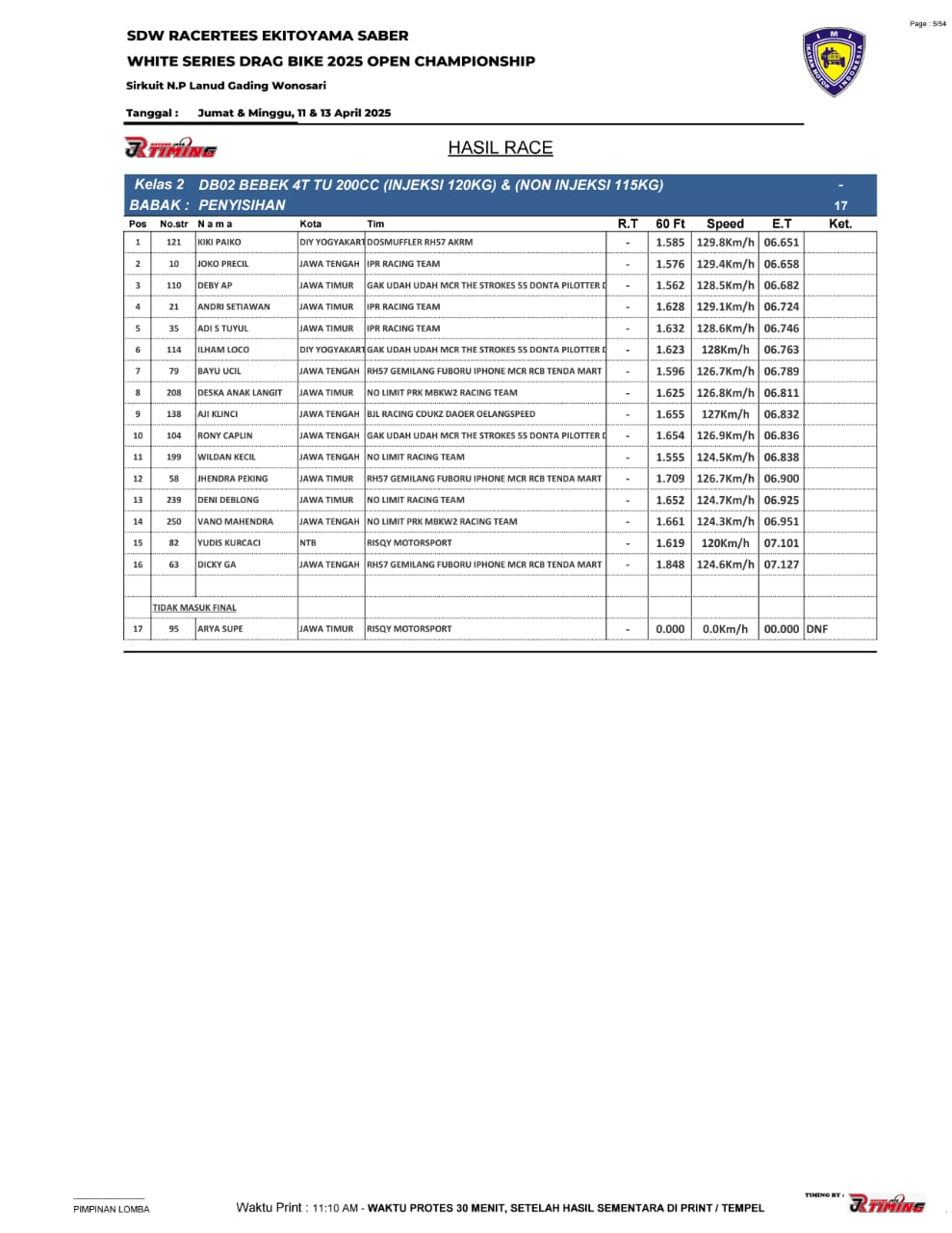 Saking ramainya yang menampilkan begitu sengit balapan, hingga membuat panitia memutuskan untuk pihak timing, RJ Timing memasang 4 alat sekaligus alias 2 line.