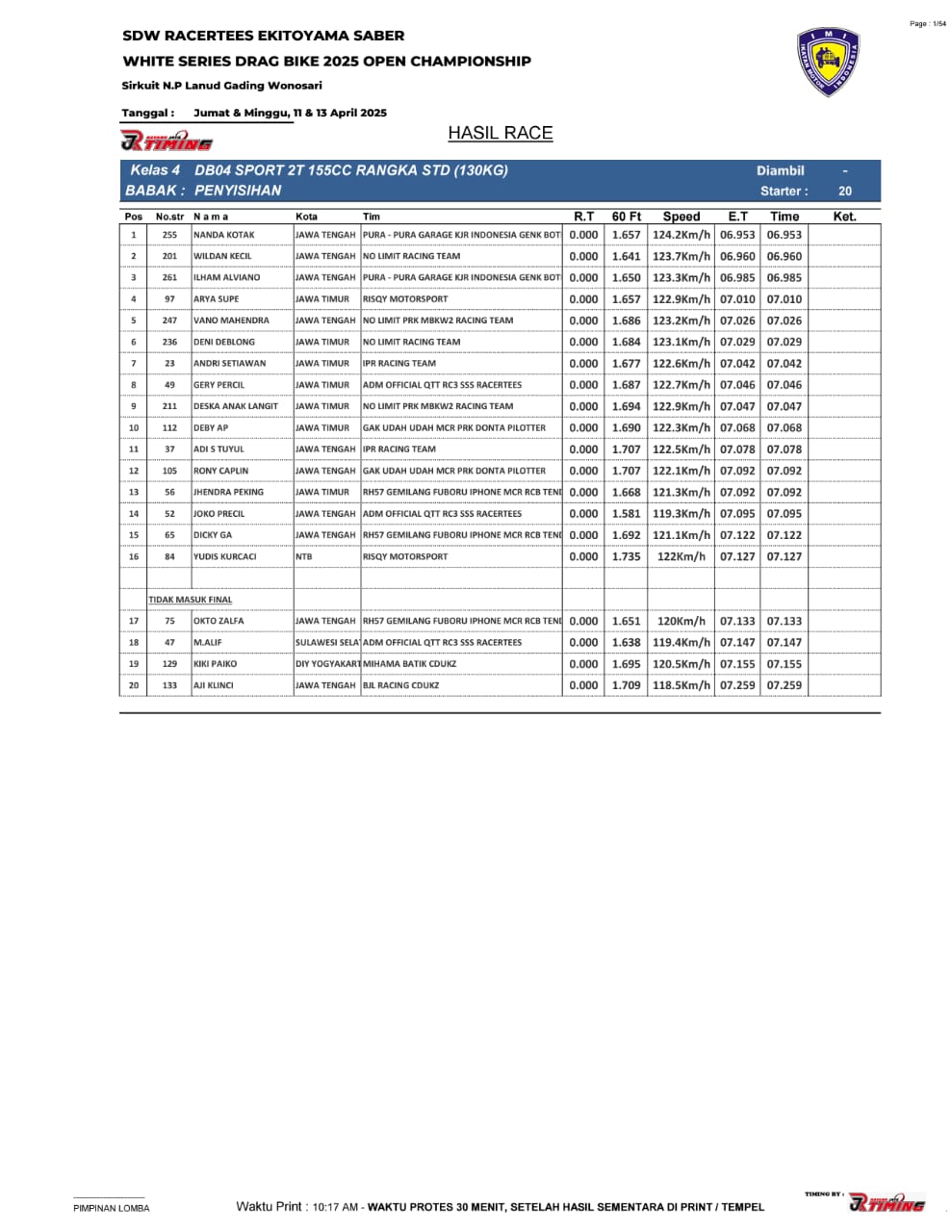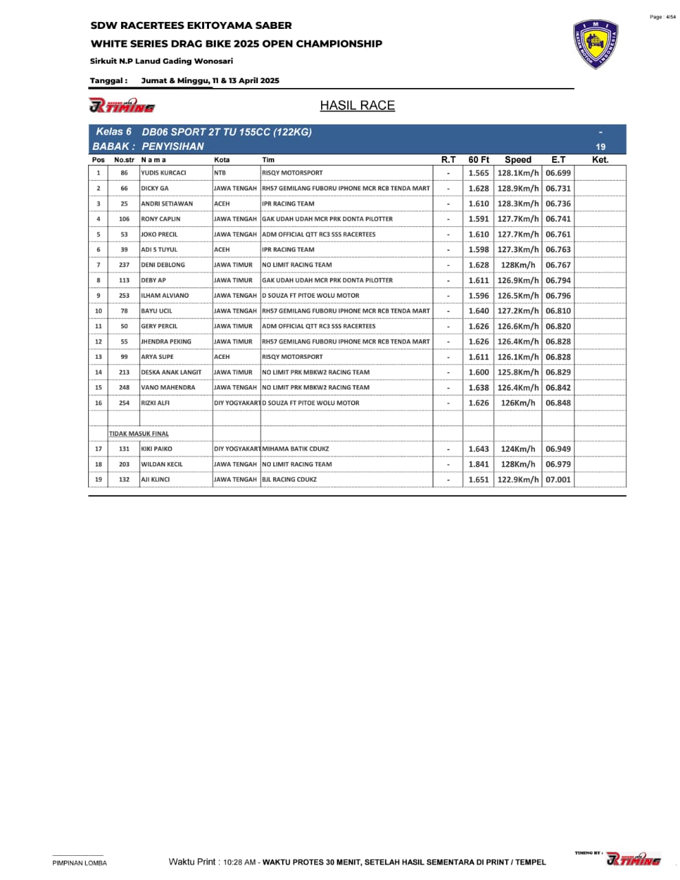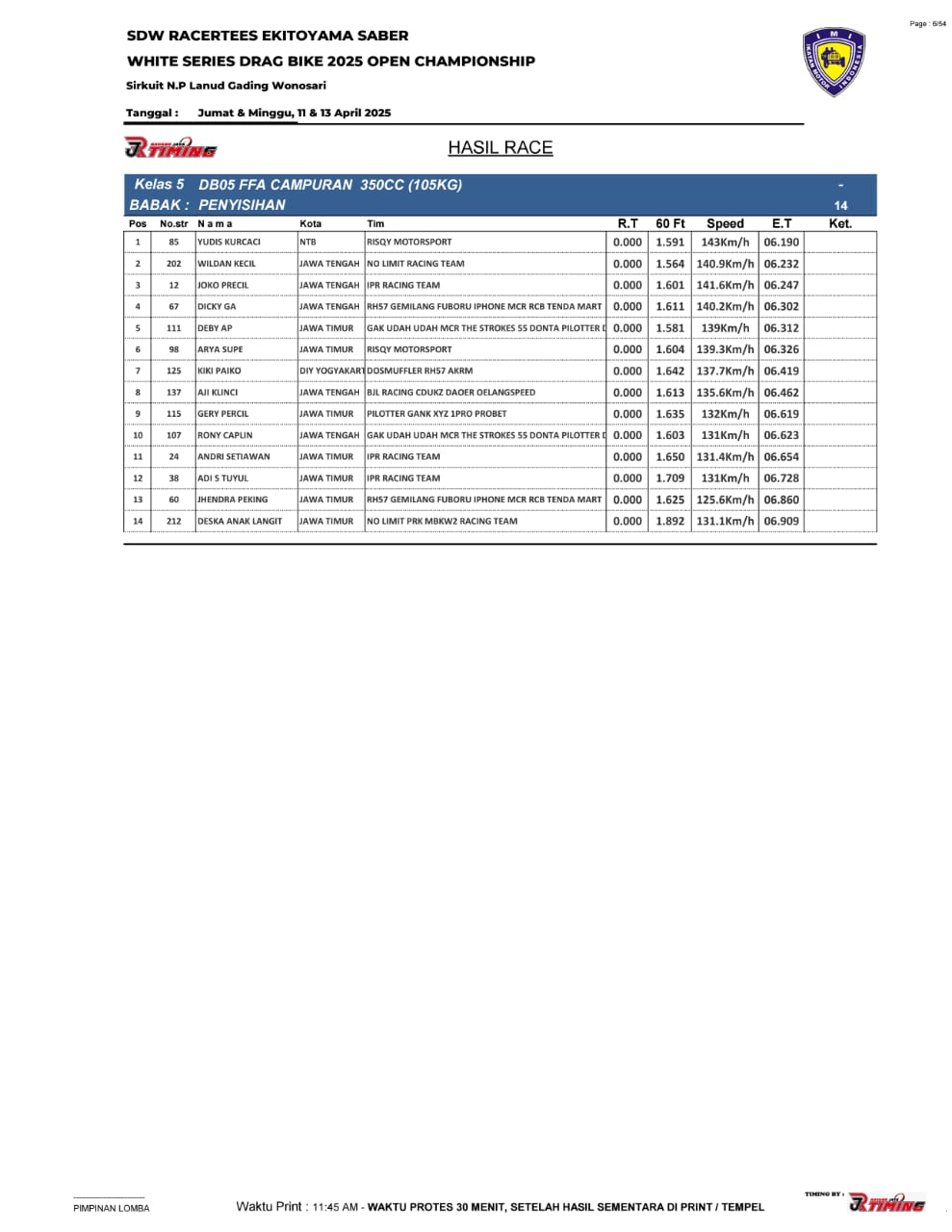 Saking ramainya yang menampilkan begitu sengit balapan, hingga membuat panitia memutuskan untuk pihak timing, RJ Timing memasang 4 alat sekaligus alias 2 line.