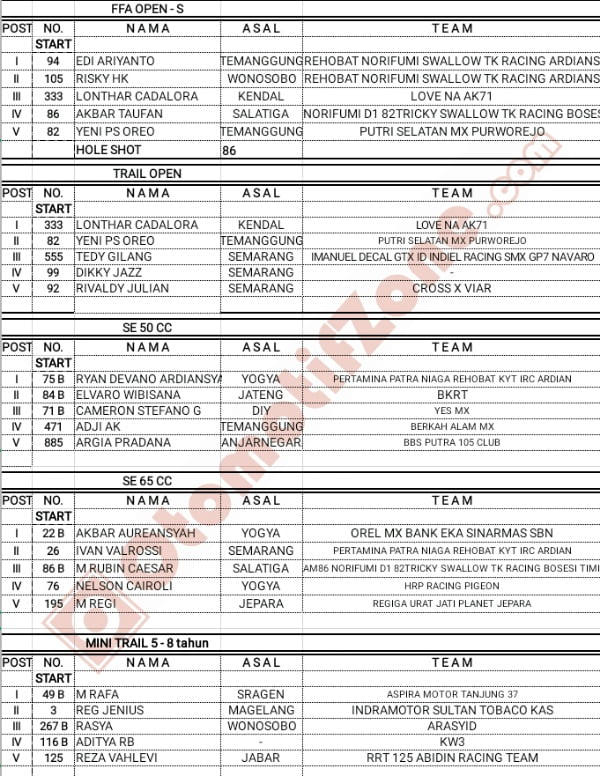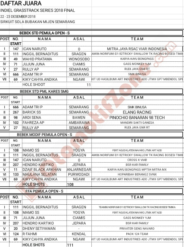 Racing Roda 2GrasstrackMotocrossRace Results Hasil Final Indiel Series Sirkuit Sola, Mijen, Semarang 2018 Penulis Hafid Hapid - 23 Desember 2018 0 2897 FacebookXPinterestWhatsApp OtomotifZone.com-Semarang. Berikut hasil keseluruhan race Final Swallow Indiel Grasstrack sirkuit Sola, Bubakan, Mijen, Semarang 22-23 Desember 2018. Penulis : Hafid | Foto : Hafid
