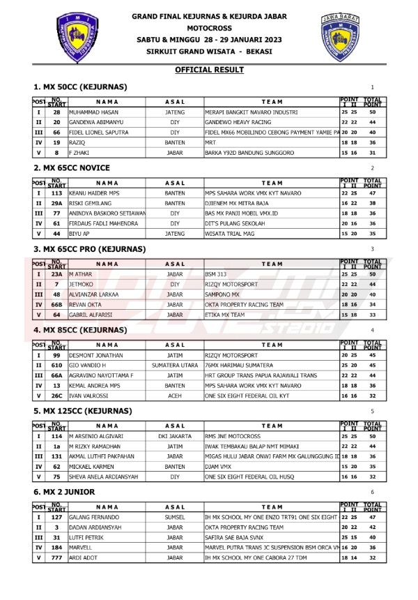 OtomotifZone.com-Bekasi. Perjalanan Kejurnas Motocross 2022 akhirnya ada titik selesainya juga. Final Kejurnas sirkuit Grand Wisata Bekasi 28-29 Januari 2023 terselenggara berkat kerjasama pemerhati balap yang nekat membuat event nasional ini terselesaikan dengan baik meski hanya tiga. Berikut kita lihat hasil racenya yang sudah terselesaikan dengan baik pada hari kedua.