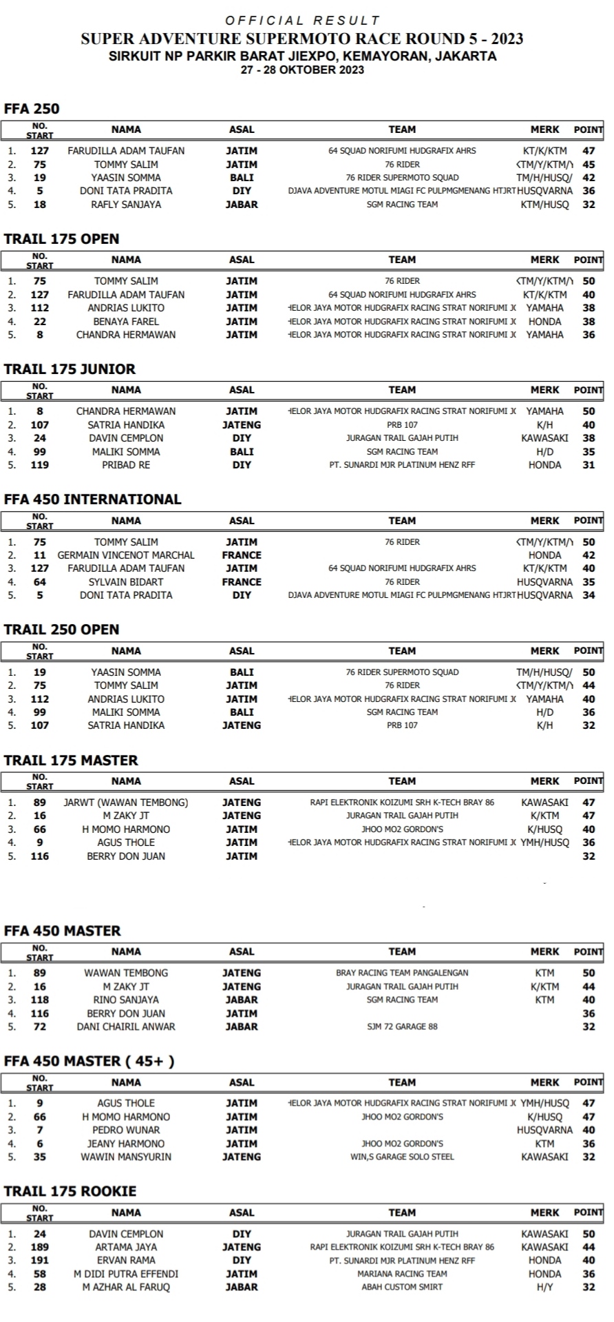 OtomotifZone.com-Kemayoran. Final Superadventure Kejurnas Supermoto di sirkuit Kemayoran 27-28 November 2023 akhirnya selesai dengan tepat waktu. Dan disini akhirnya keluar jawara-jawara beberapa kelas penutu. Berikut hasil racenya.