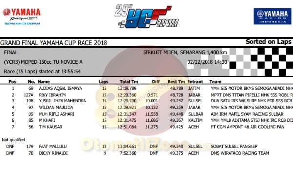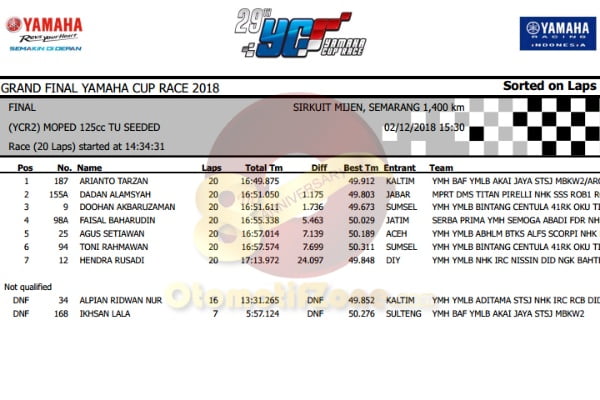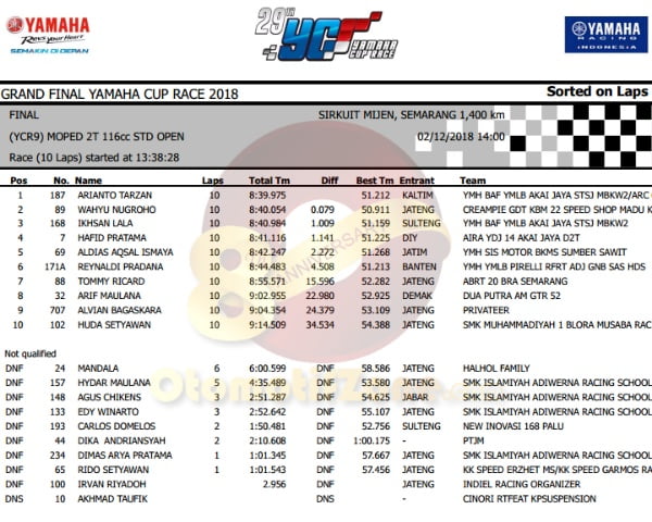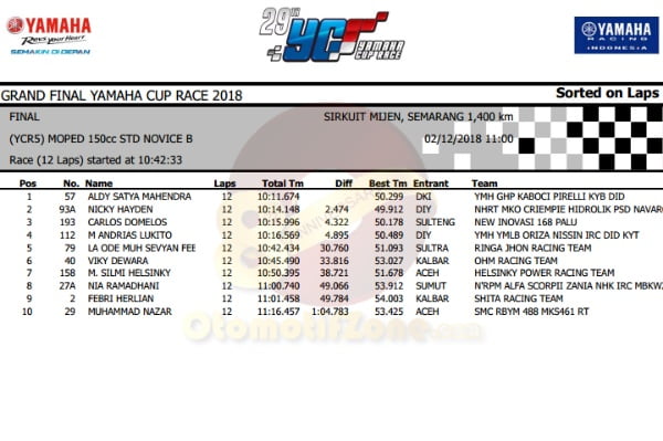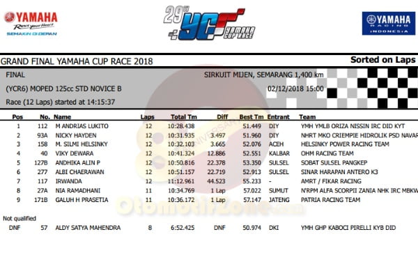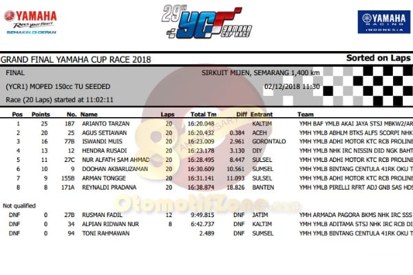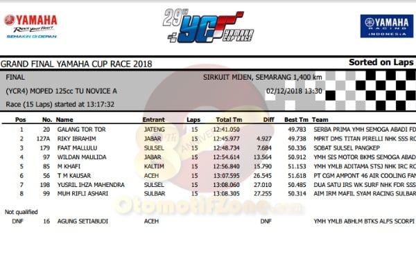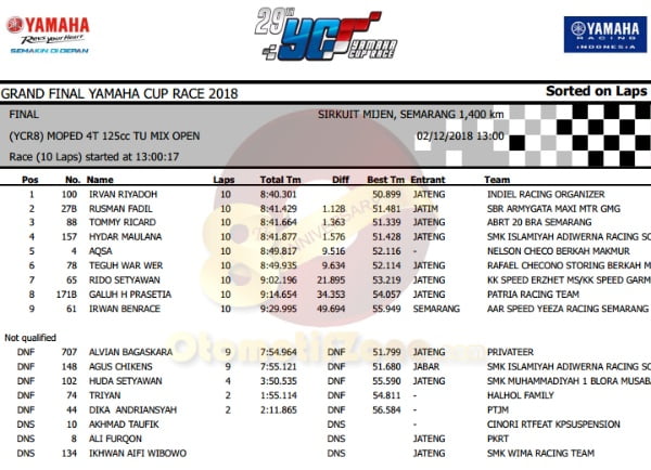 Race ResultsRacing Roda 2Road Race Hasil Final YCR Mijen, Semarang 2018 Penulis Hafid Hapid - 3 Desember 2018 0 1355 FacebookXPinterestWhatsApp OtomotifZone.com-Semarang. Berikut hasil keseluruhan race final Yamaha Cup Race sirkuit Mijen, Semarang 2 Desember 2018. Penulis : Hafid | Foto : Hafid
