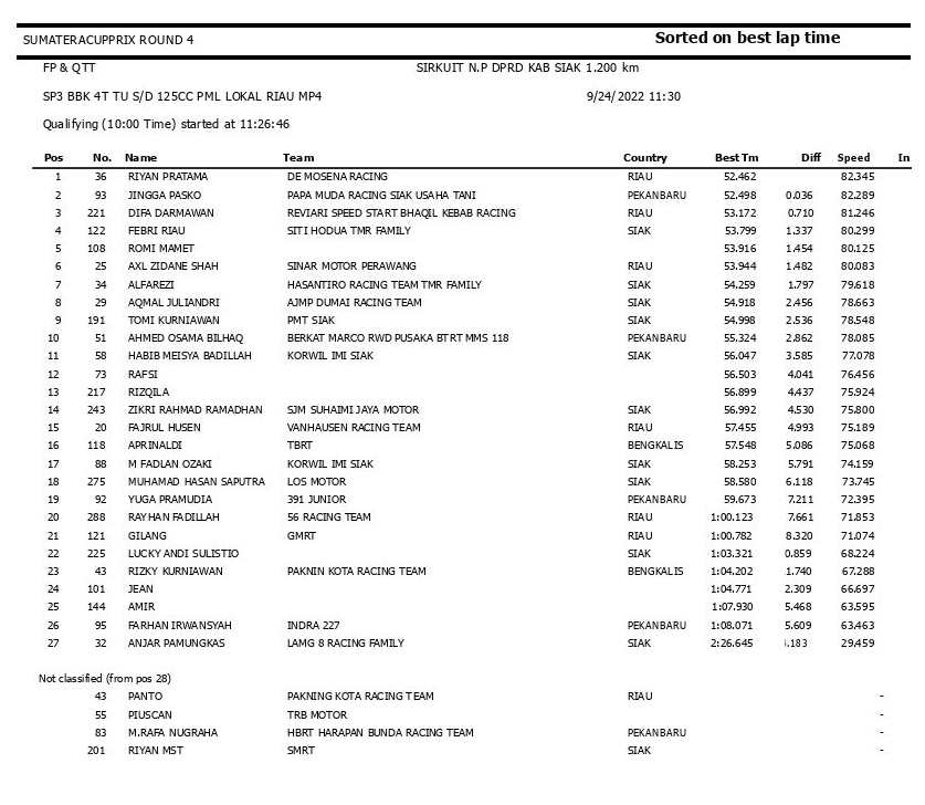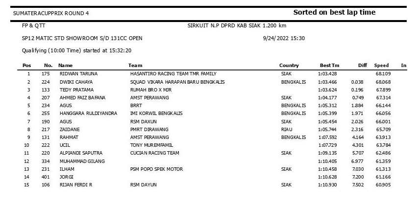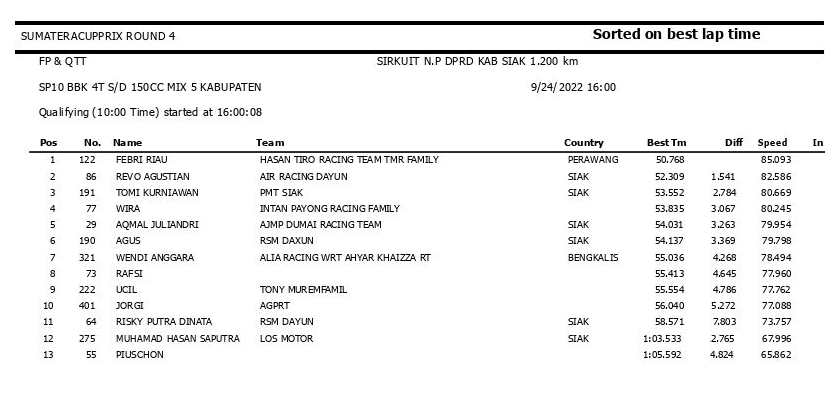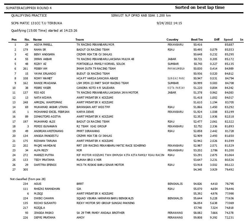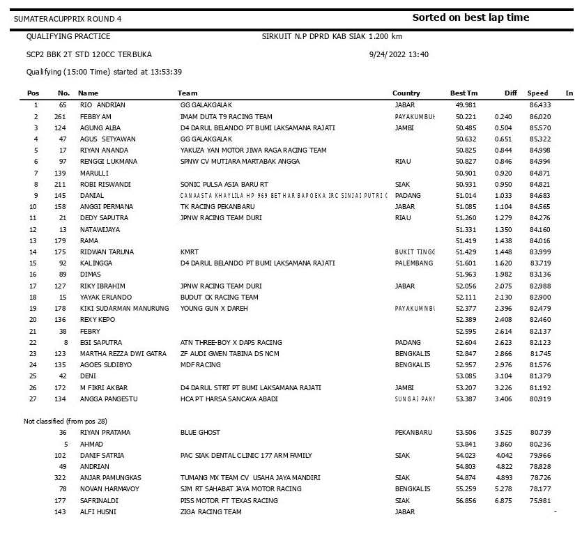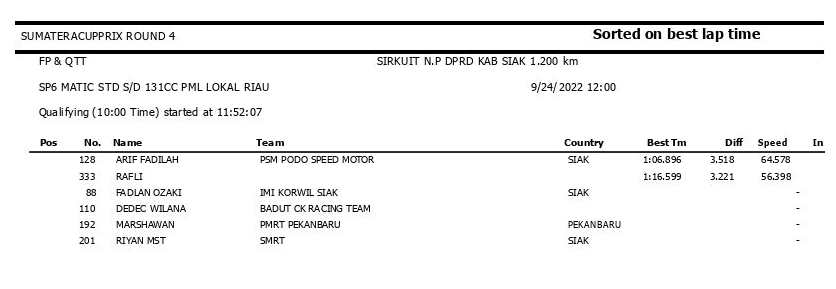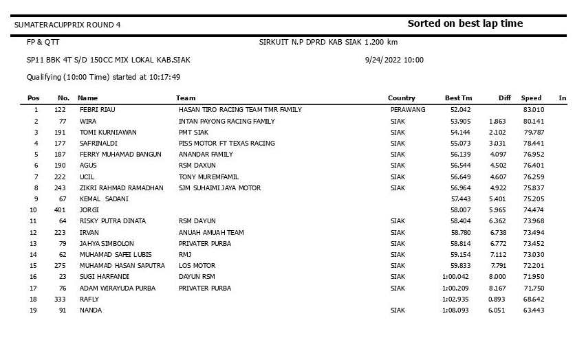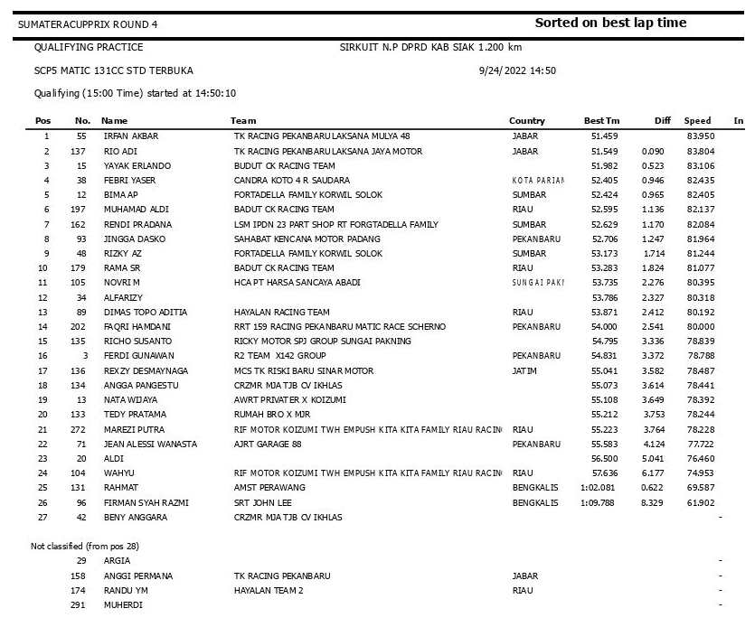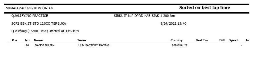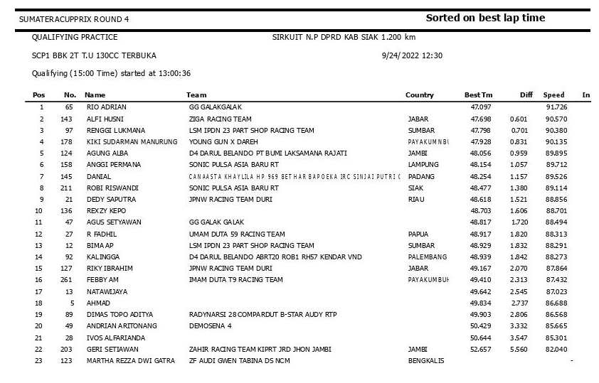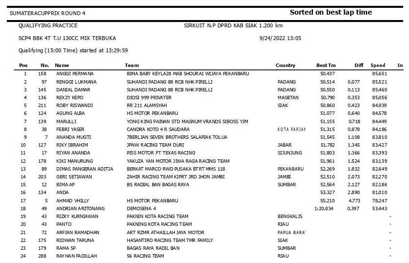OtomotifZone.com – Siak. Hasil lengkap Free Practice dan Qualifying Time Trial Sumatera Cup Prix Seri 4 2022, sirkuit NP. DPRD Kabupaten Siak, Riau.
