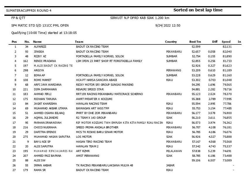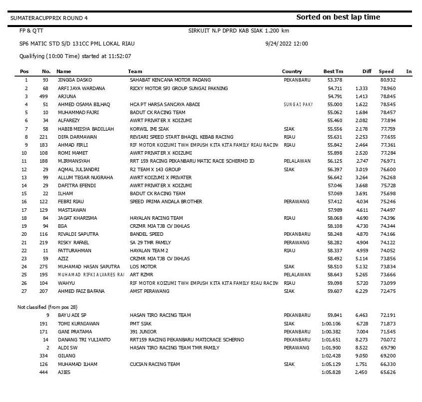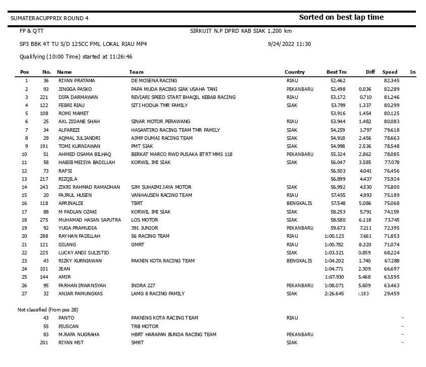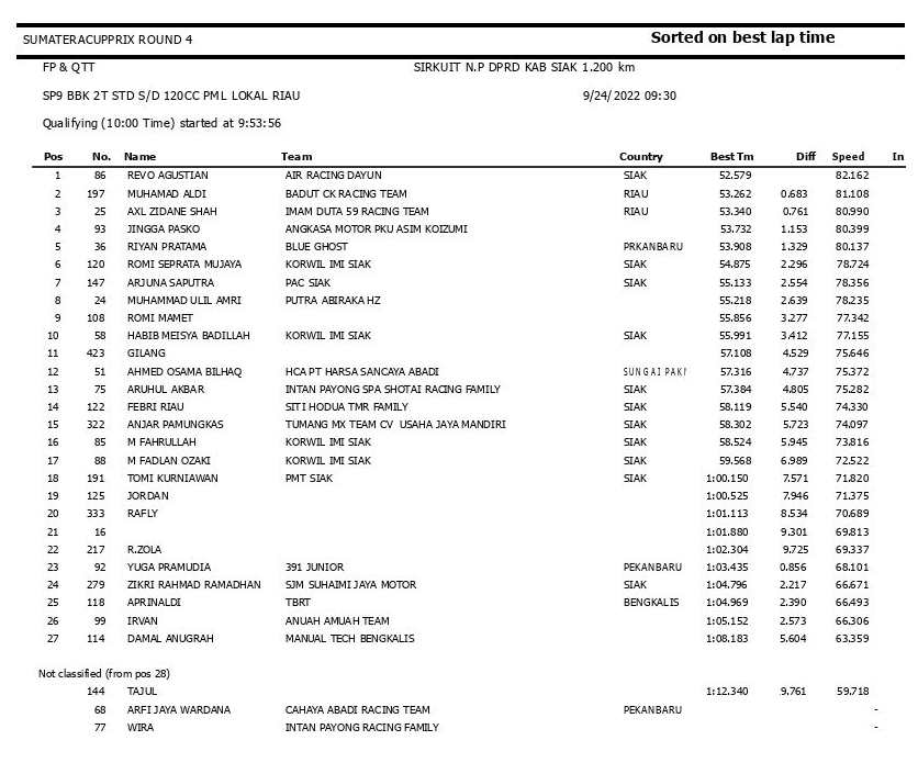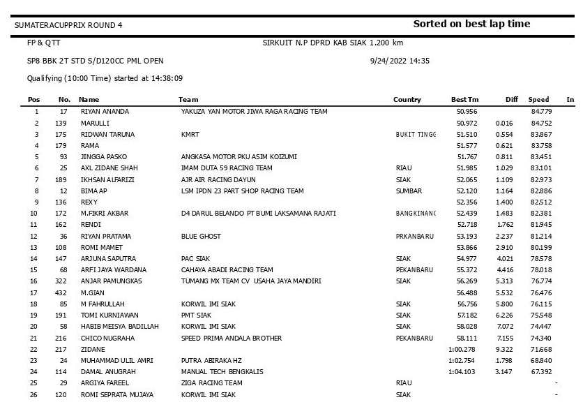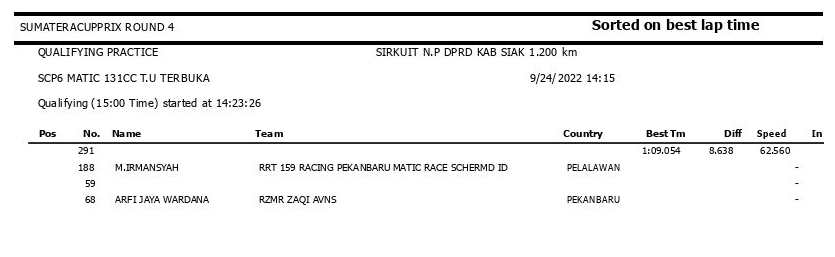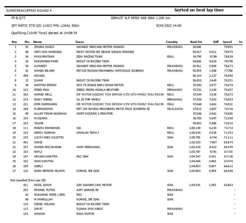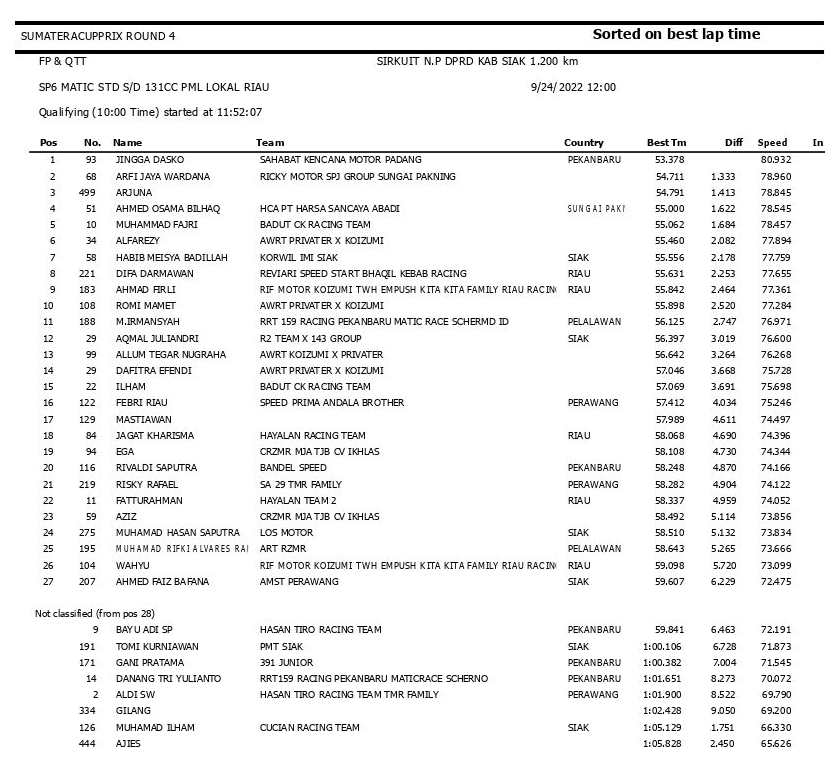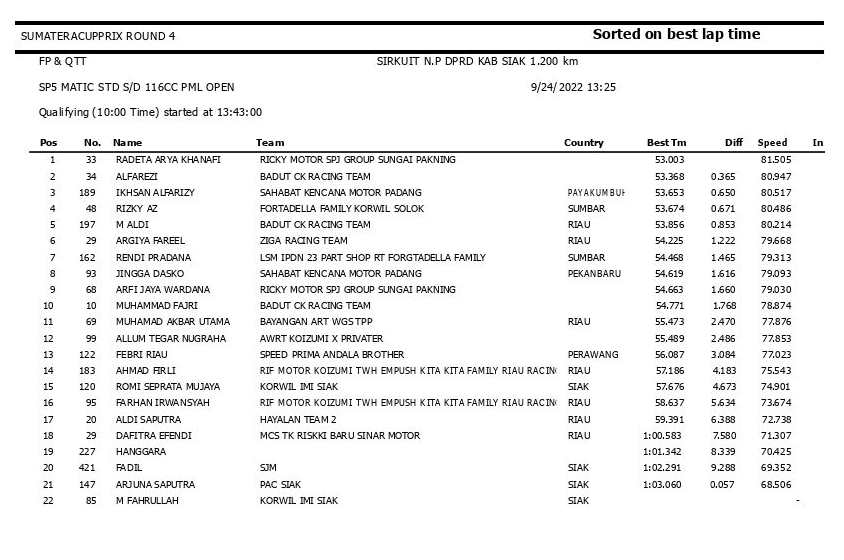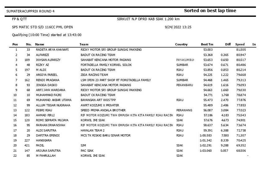 OtomotifZone.com – Siak. Hasil lengkap Free Practice dan Qualifying Time Trial Sumatera Cup Prix Seri 4 2022, sirkuit NP. DPRD Kabupaten Siak, Riau.