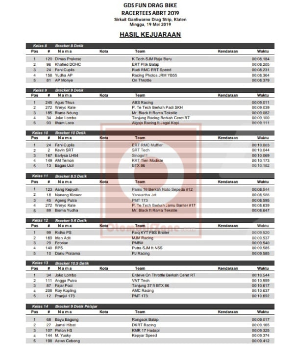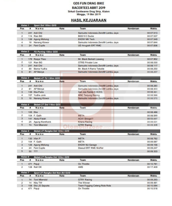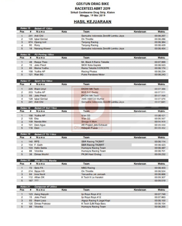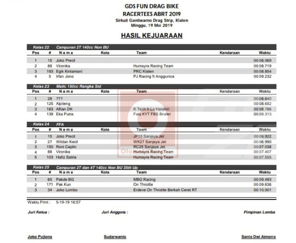 Racing Roda 2Drag BikeRace Results Hasil GDS Gantiwarno Fun Drag Bike Bulan Mei 2019 Penulis Hafid Hapid - 19 Mei 2019 0 421 FacebookXPinterestWhatsApp OtomotifZone.com-Klaten. Berikut hasil GDS Gantiwarno Fun Drag Bike Bulan Mei 2019 yang di adakan hari ini. Penulis : Hafid | Foto: Hafid