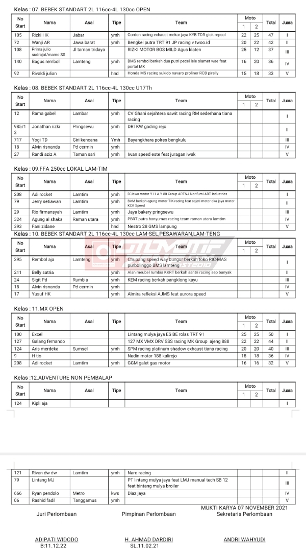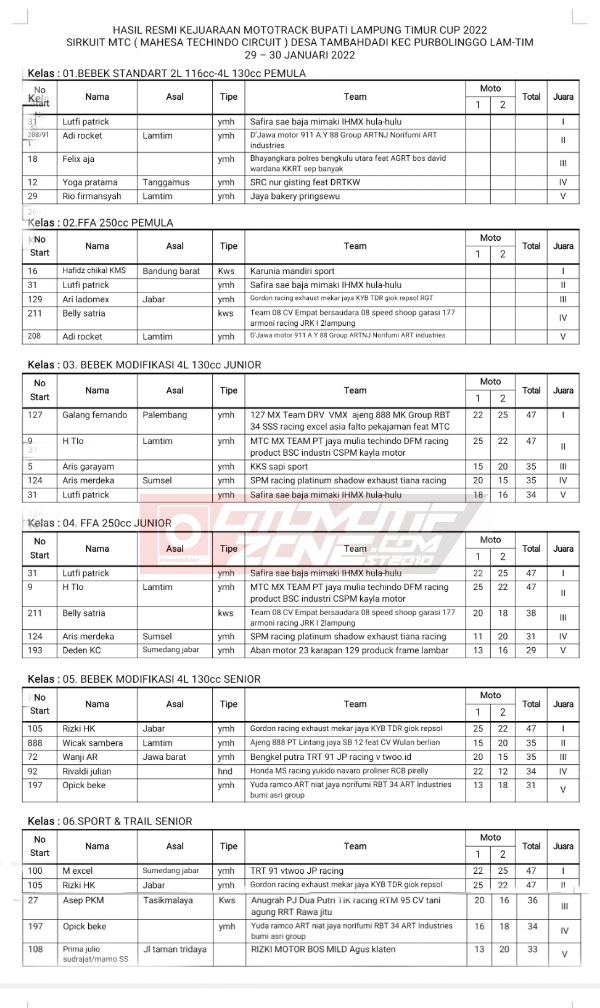 OtomotifZone.com-Lampung Timur. Berikut hasil resmi Kejuaraan Mototrack Bupati Lampung Timur Cup 2022 di Sirkuit MTC (Mahesa Techindo Circuit ) Desa Tambahdadi, Kecamatan Purbolinggo Lampung Timur tanggal 29-30 Januari 2022. Beberapa pembalap Jawa turut hadir menyemarakkan event akbar tersebut.