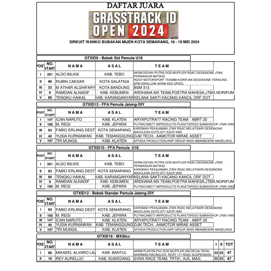 Racing Roda 2GrasstrackMotocross Hasil Grasstrack ID Open 2024 Semarang Penulis Hafid Hapid - 20 Mei 2024 0 974 FacebookXPinterestWhatsApp OtomotifZone.com – Semarang. Berikut hasil Grasstrack ID Open sirkuit Wanko, Bubakan, Mijen, Semarang 18-19 Mei 2024.