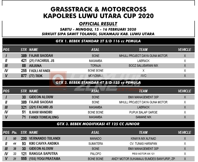 OtomotifZone.com – Jakarta. Usai sudah gelaran Grasstrack & Motocross Kapolres Luwu Utara Cup 2020 yang berlangsung (15-16/2) di Sirkuit Sipa Sawit Tolangi, Sukamaju, Kab. Luwu Utara. Seru dan sengit persaingan yang terjadi dalam pagelaran tersebut. Dan pebalap terbaik keluar sebagai juaranya. Berikut daftar juaranya:
