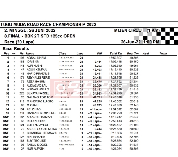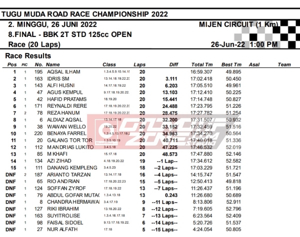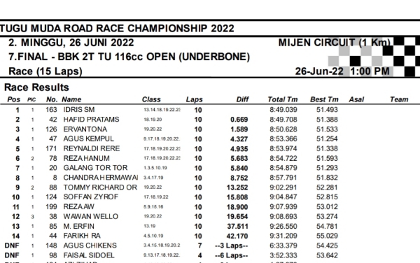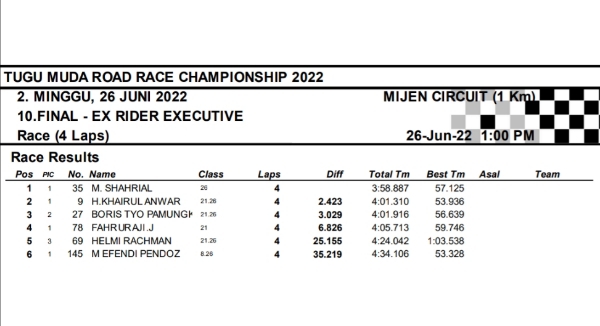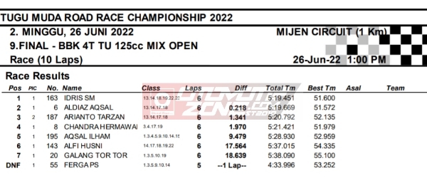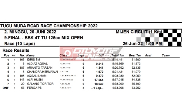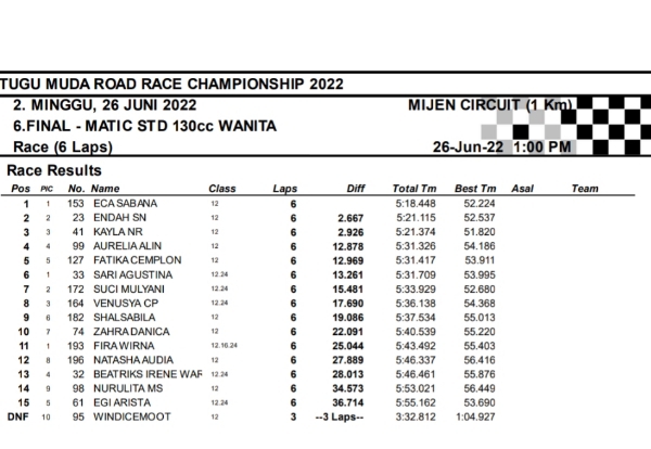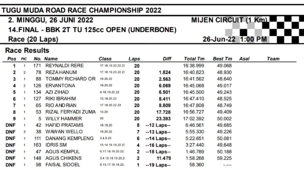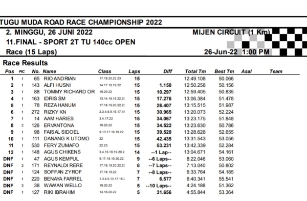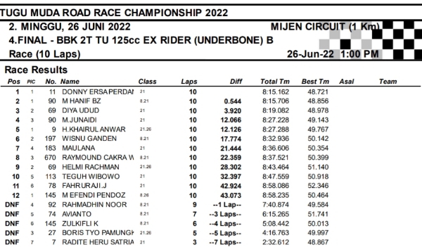 OtomotifZone.com-Semarang. Berikut hasil race hari kedua seri 2 Tugu Muda Road Race Championship sirkuit Mijen Semarang, Jawa Tengah 26 Juni 2022. Empat belas kelas selesai di hari ini walau di guyur hujan pada pertengahan perlombaan.