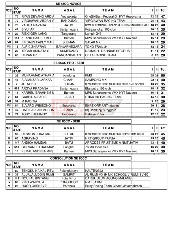 Sebanyak delapan kelas sudah selesai baik seri Kejurnas maupun seri Indiel. Berikut hasilnya.