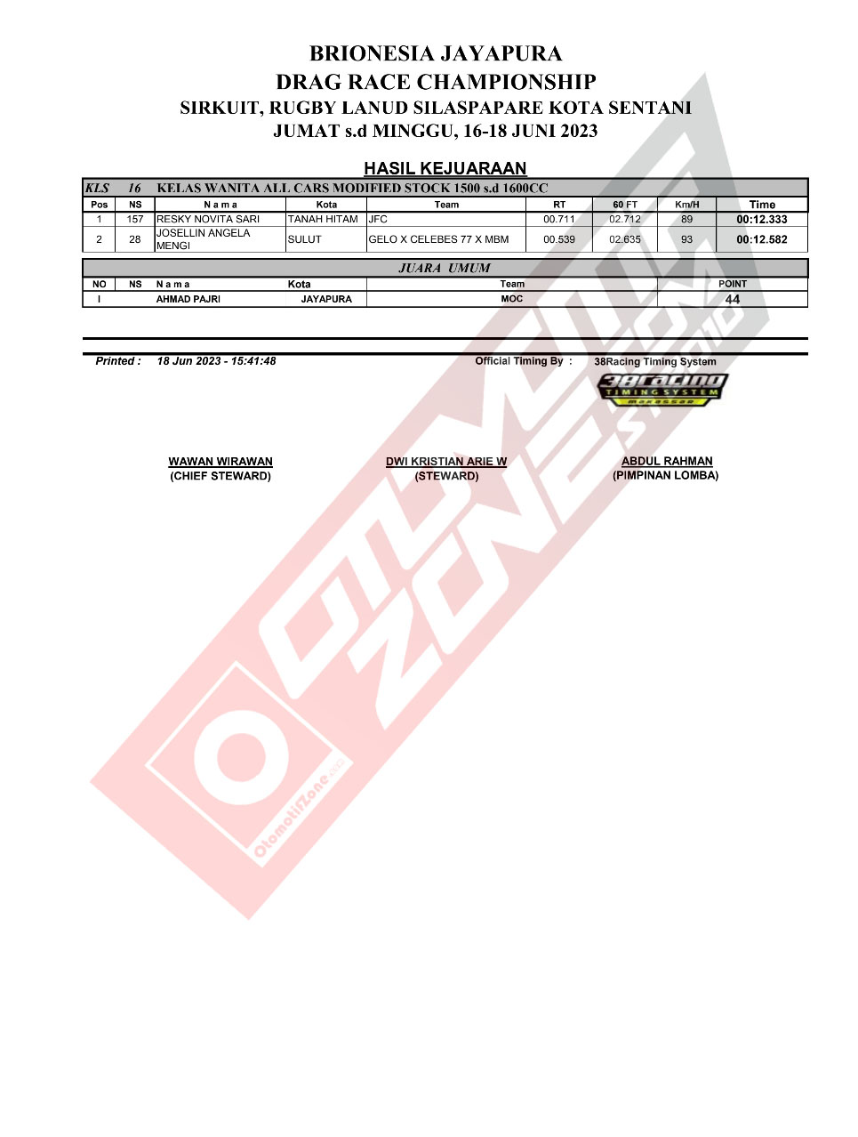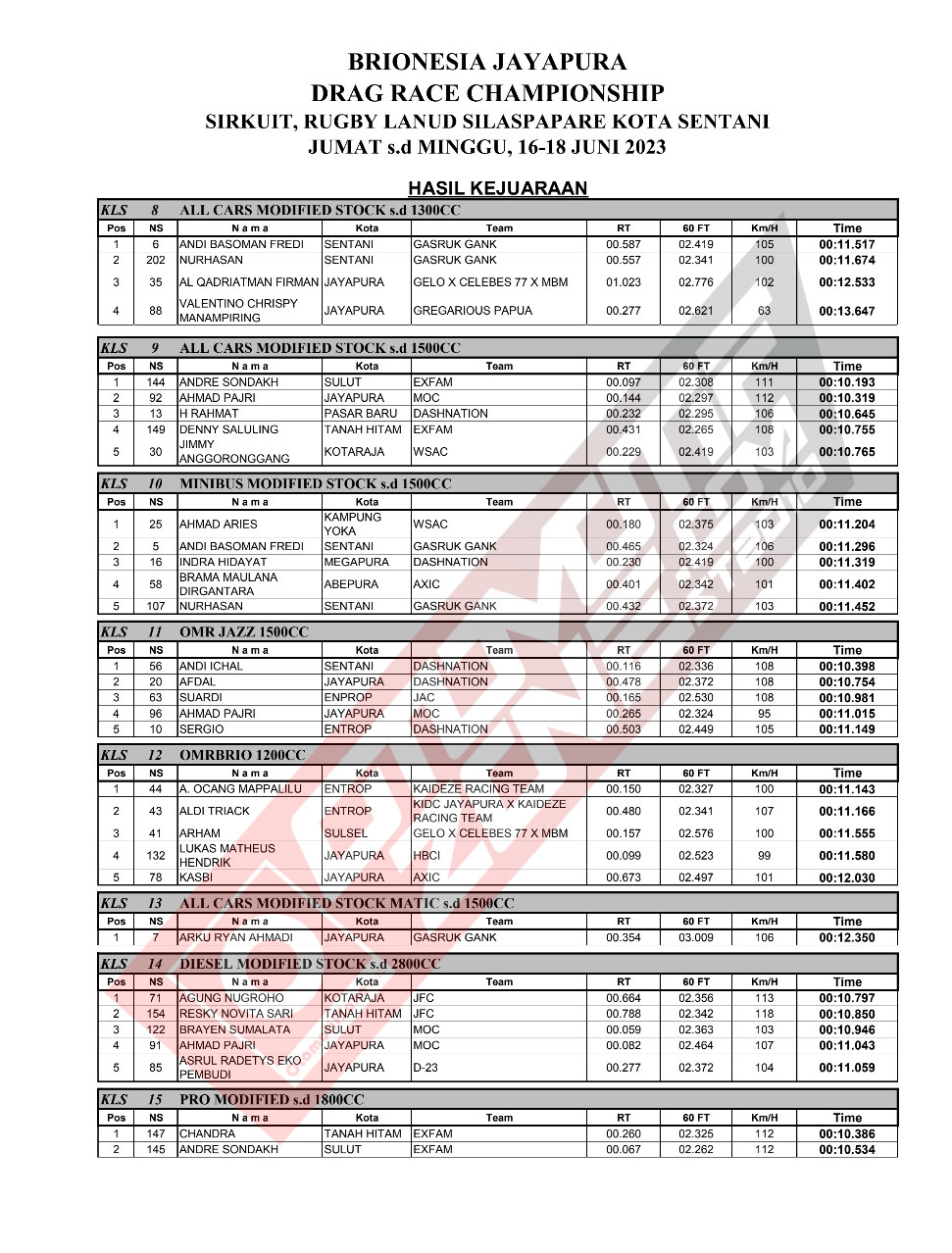 Ini merupakan Event perdana yang di laksanakan Brionesia Jayapura di Provinsi Papua sepanjang tahun yang ada. Dalam pagelaran ini tercatat 60 peserta dari 160 starter yang mengambil bagian turun mengikuti balap trek lurus roda empat. Ada beberapa nama nama pebalap ternama dan tim wilayah Timur ternama yang ikut serta dalam pagelaran ini. Dalam pertarungan ini, persaingan panas terjadi antar peserta. Pembalap terbaik keluar sebagai juaranya. Berikut daftar juara disetiap kelasnya: