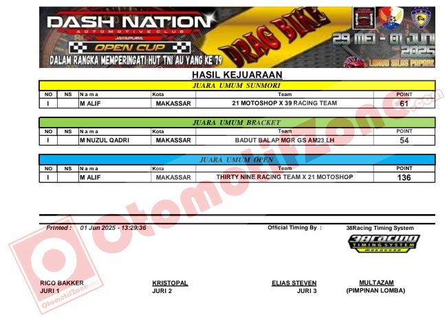 Otomotifzone.com – Jayapura. Kejuaraan Open Cup Drag Race & Drag Bike memperingati HUT TNI-AU Ke 79 tahun yang telah tergelar oleh komunitas roda empat Dash Nation Chapter Jayapura. sukses terlaksana pada akhir pekan ini, di Sirkuit Non Permanen (NP) Lanud Silas Papare, Sentani, Kabupaten Jayapura.