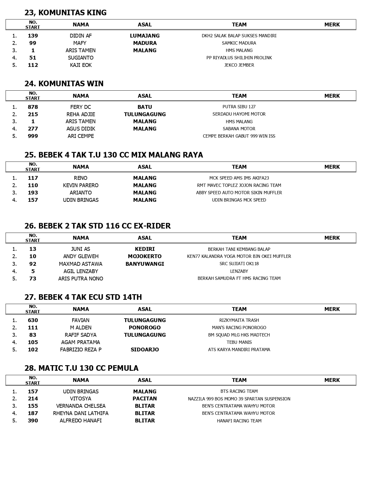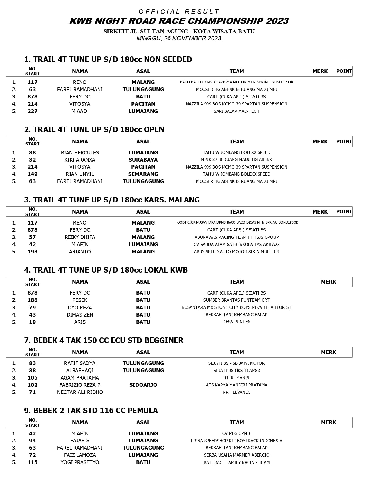 OtomotifZone.com – Batu. Berikut hasil juara KWB Night Road Race Championship 2023 yang berlangsung di sirkuit non-permanen jalan Sultan Agung Kota Wisata Batu (26/11).