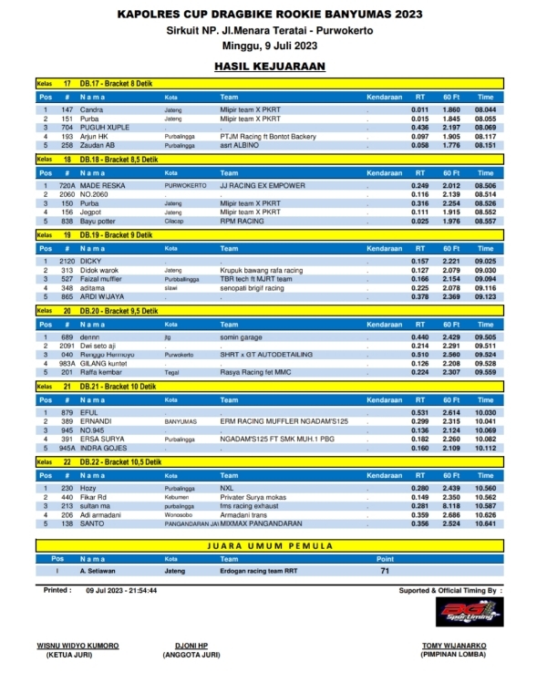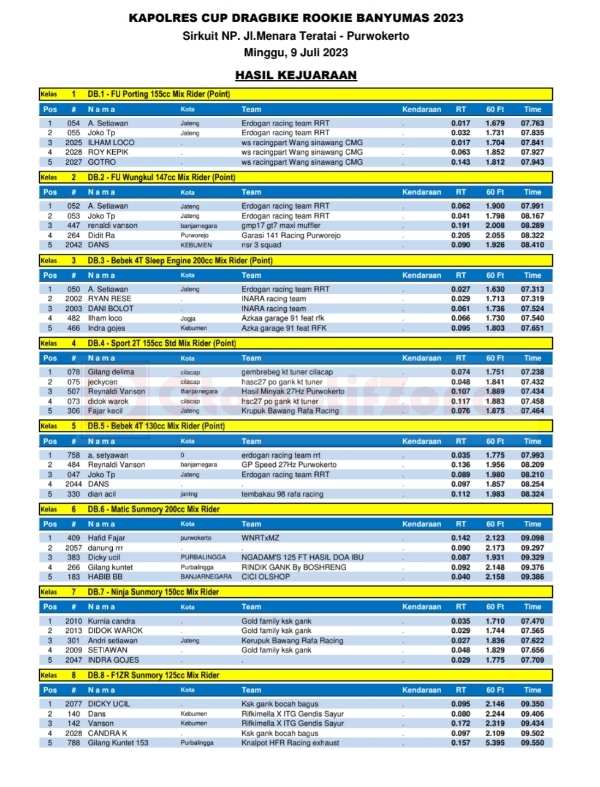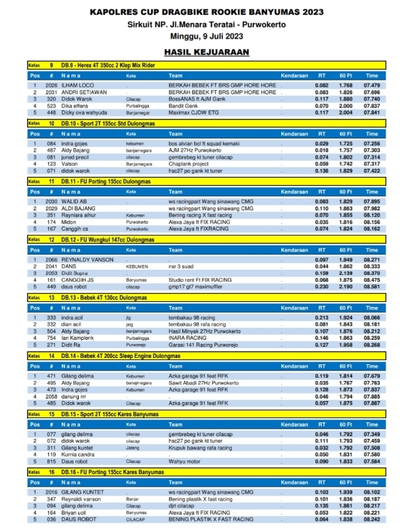 Racing Roda 2Drag BikeRace Results Hasil Kapolres Cup Dragbike Rookie Banyumas 2023 Penulis Hafid Hapid - 10 Juli 2023 0 307 FacebookXPinterestWhatsApp OtomotifZone.com-Purwokerto. Berikut hasil Kapolres Cup Dragbike Rookie Banyumas di Sirkuit NP. Jl.Menara Teratai – Purwokerto Minggu, 9 Juli 2023. Penulis : Hafid | Foto : Hafid