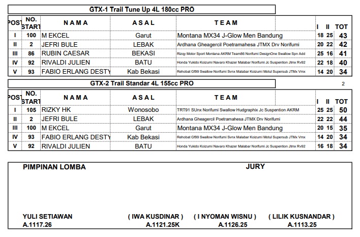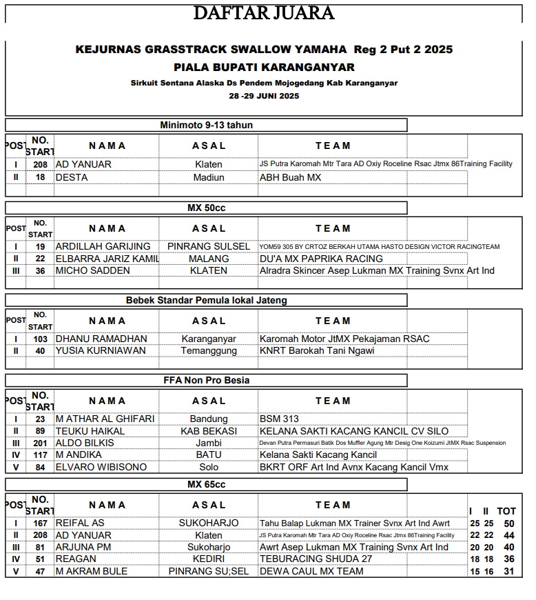 Racing Roda 2GrasstrackRace Results Hasil Kejurnas Grasstrack 2025 Reg. 2 Karanganyar Penulis Hafid Hapid - 29 Juni 2025 0 1507 FacebookXPinterestWhatsApp OtomotifZone.com – Karanganyar. Berikut hasil Seri 2 Kejurnas Grasstrack Reg. 2 sirkuit Sentana Alaska, Pendem, Mojogedang, Karanganyar 28 – 29 Juni 2025.