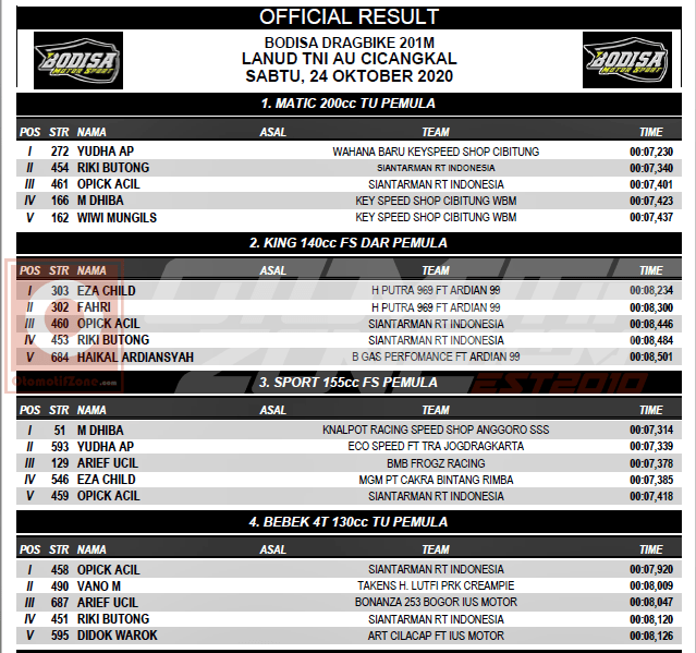 Otomotifzone.com – Tangerang Selatan. Usai sudah balapan seri 2 dari pagelaran drag bike 201 meter milik Bodisa Motor Sport yang dilaksanakan pada (24-25/10/2020) di Sirkuit Non Permanen TNI-AU Cicangkal, Rumpin, Bogor, Jawa Barat. Dilaksanakan 2 hari untuk tidak menimbulkan kerumunan berlebih saat pandemic sekarang ini, balapan berjalan sesuai rencana walau pada hari akhir diguyur hujan. Berikut hasil keseluruhan yang dapat Penulis rangkum.