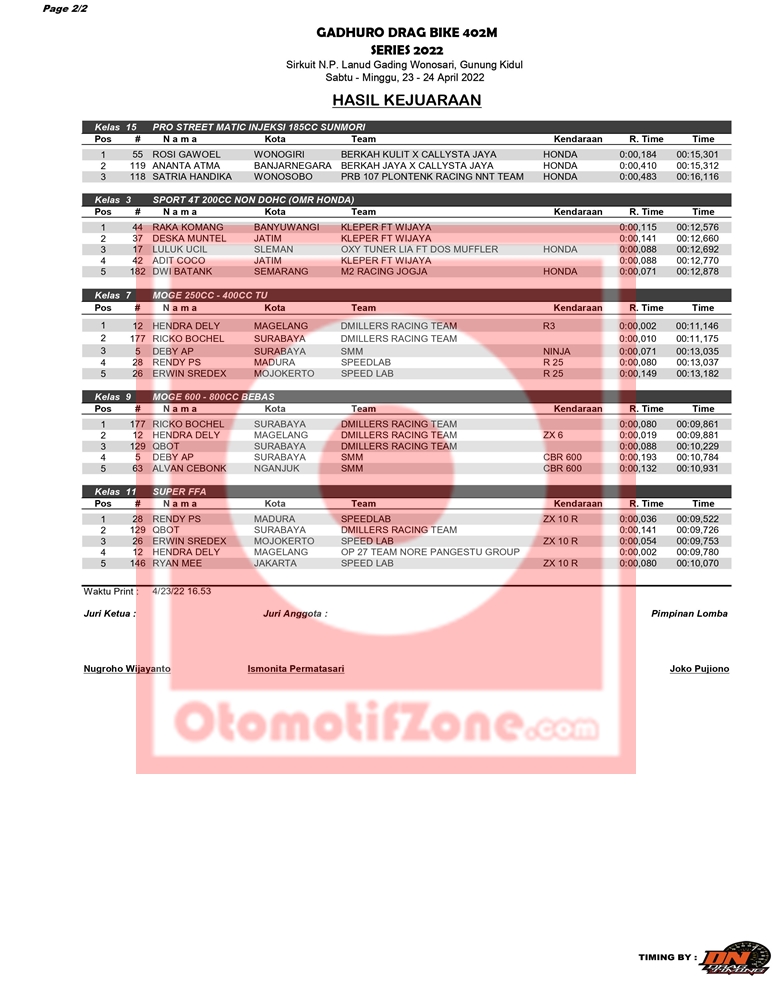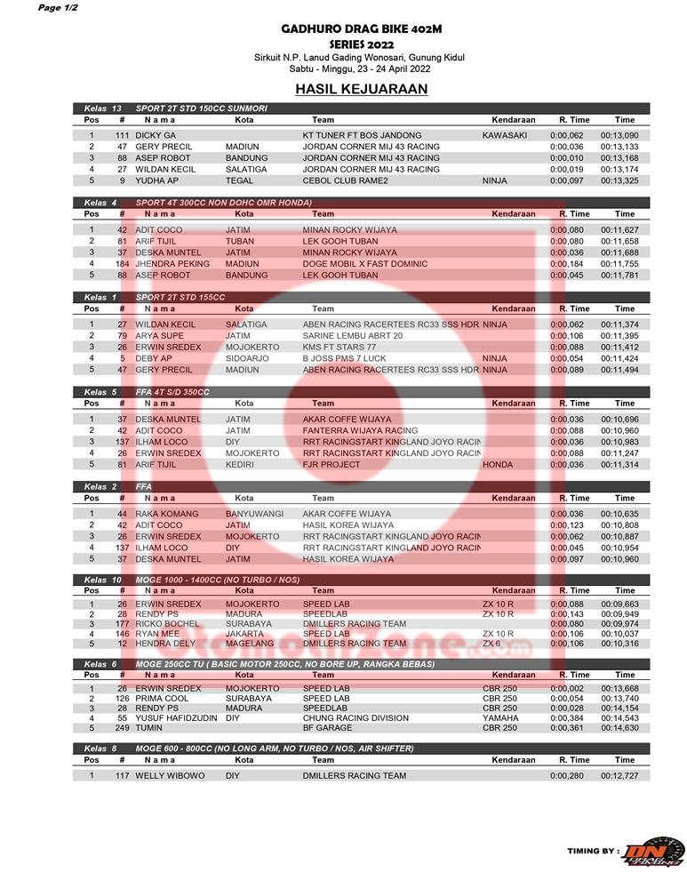 Simak selengkapnya di hasil keseluruhan Drag Bike Gadhuro Seri 1, hari Sabtu (23/4/2022) yang berhasil Penulis rangkum di bawah ini.