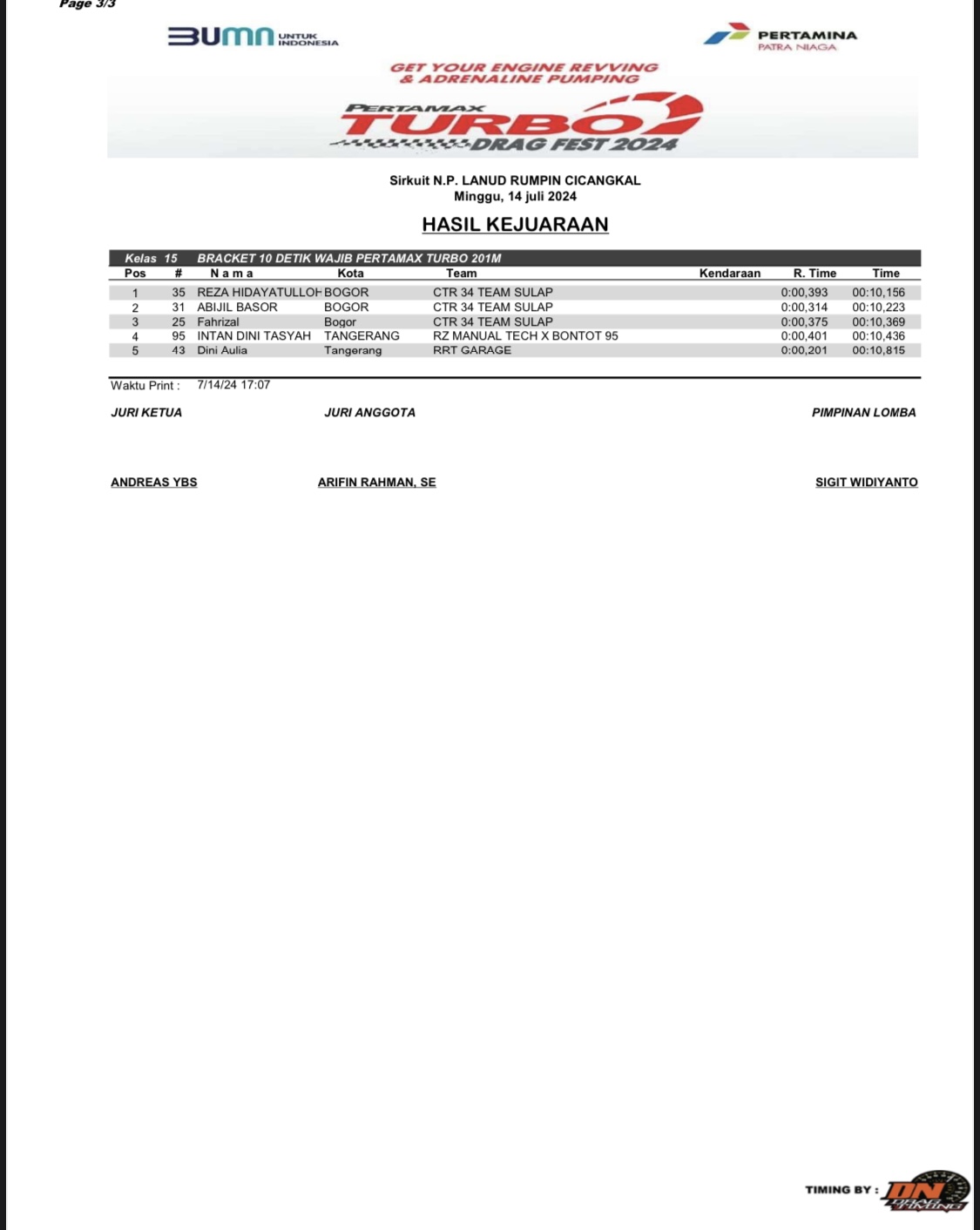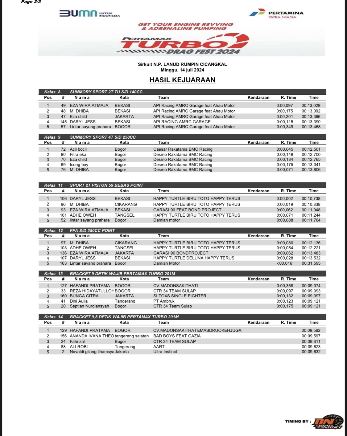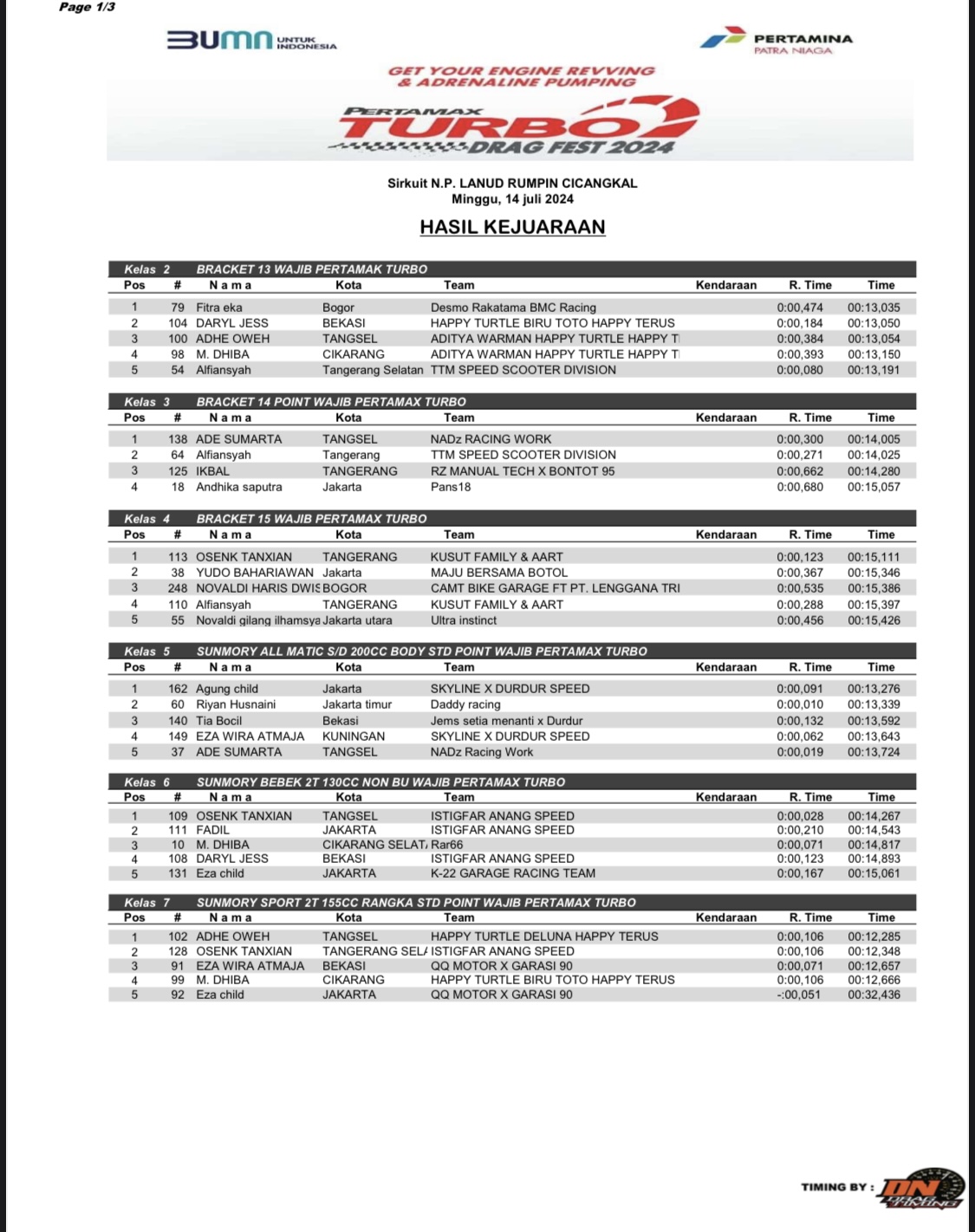 Berikut hasil keseluruhan Drag Bike Pertamax Turbo Drag Fest 2024 Seri 1, yang dapat dirangkum oleh Redaksi Otomotif Zone;