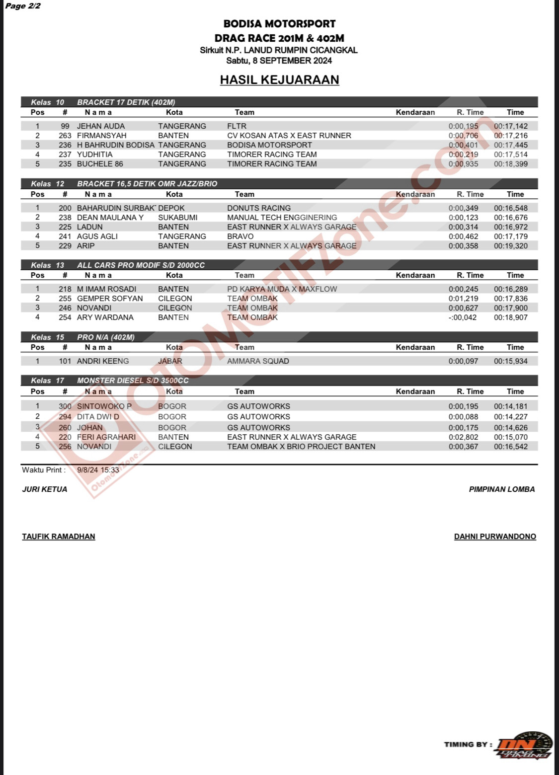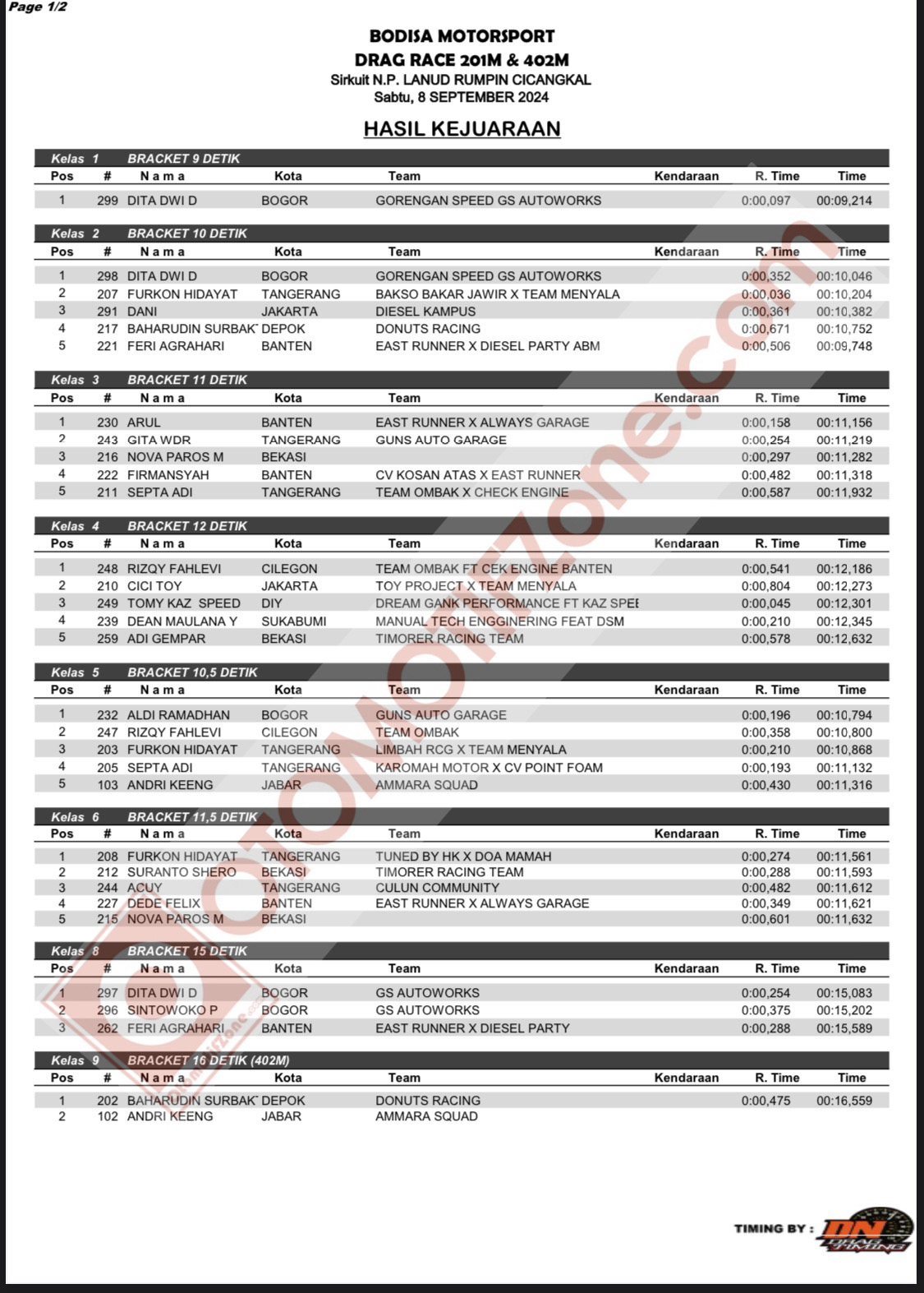 Berikut hasil keseluruhan dari Drag Race Bodisa 201 Meter — 402 Meter 2024, yang berlangsung di Cicangkal, Rumpin, Bogor — Jawa Barat, akhir Minggu ini.