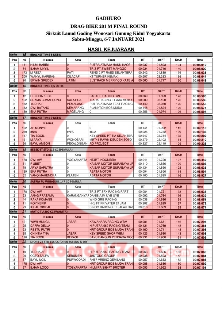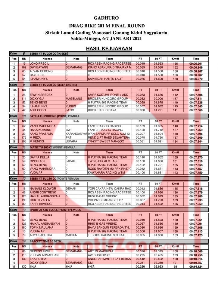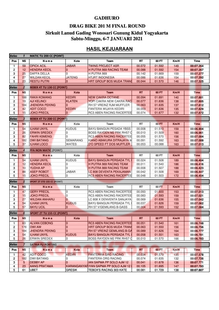 Pembalap ternama Indonesia, bersama timnya saling sikut menyikut, dan salip menyalip dalam torehan waktu sepanjang sirkuit 201 meter. Berikut hasil keseluruhan yang dapat Penulis rangkum:
