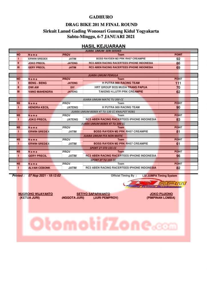 Otomotifzone.com – Tangerang Selatan. Selesai sudah perjalanan yang panjang dari gelaran drag bike Gadhuro Sport Club, di mana seri terakhir telah usai pada akhir pekan kemarin (6-7/11/2021). Pagelaran akbar yang bergengsi ini dilaksanakan pada Sirkuit NP Lanud, Gading Wonosari, Gunung Kidul, Yogyakarta, Jawa Tengah.