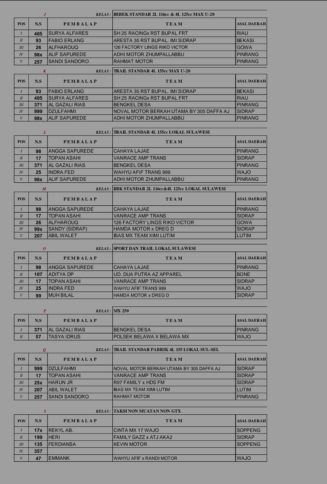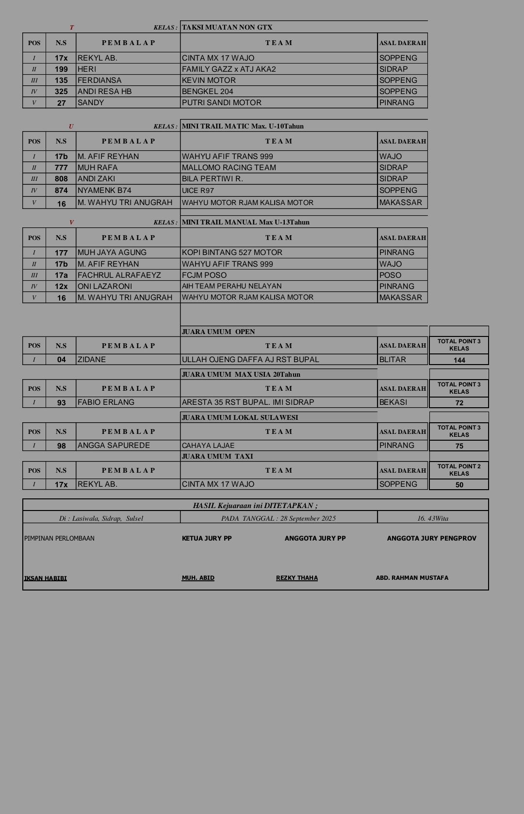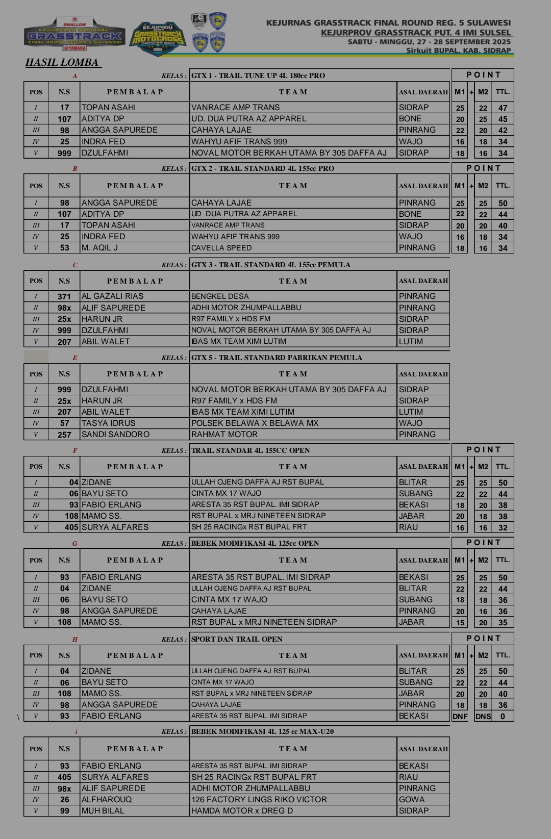 Racing Roda 2GrasstrackRace Results Hasil Keseluruhan Final Kejurnas Grasstrack Region Sulawesi Penulis Sigit Prayogi - 28 September 2025 0 401 FacebookXPinterestWhatsApp OtomotifZone.com – Sidrap. Berikut adalah hasil resmi Kejuaraan Nasional Grasstrack Final Region Sulawesi 2025 sirkuit RST BUPAL Kabupaten Sidrap Sulawesi Selatan.