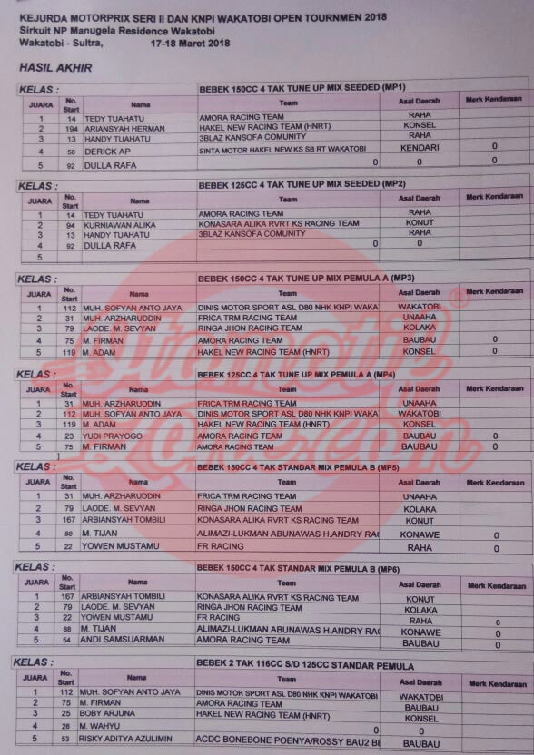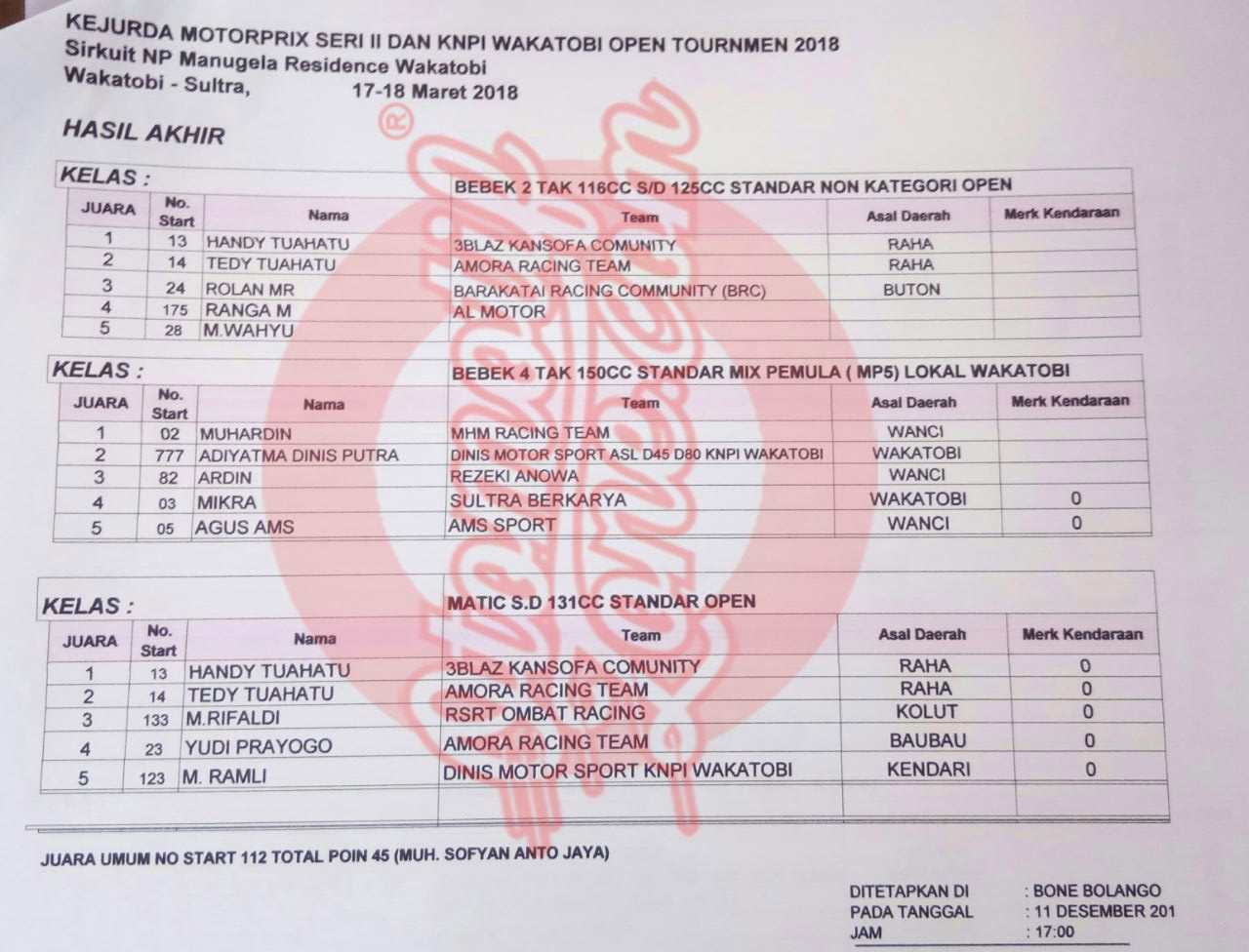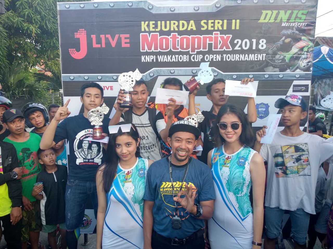 Otomotifzone.com – Wakatobi. Berikut ini adalah hasil Keseluruhan Kejurda Balap Motor KNPI Wakatobi Cup Open IMI Sulawesi Tenggara 2018 Seri 2 yang berlangsung di sirkuit Wakatobi, Sulawesi Tenggara, Minggu (18/3). Dimana prmabalap Dinis Motorpsort D45 D80 Knpi Wakatobi Racing team, Muh. sofyan Anto jaya Meraih Juara umum di kategori Pemula.