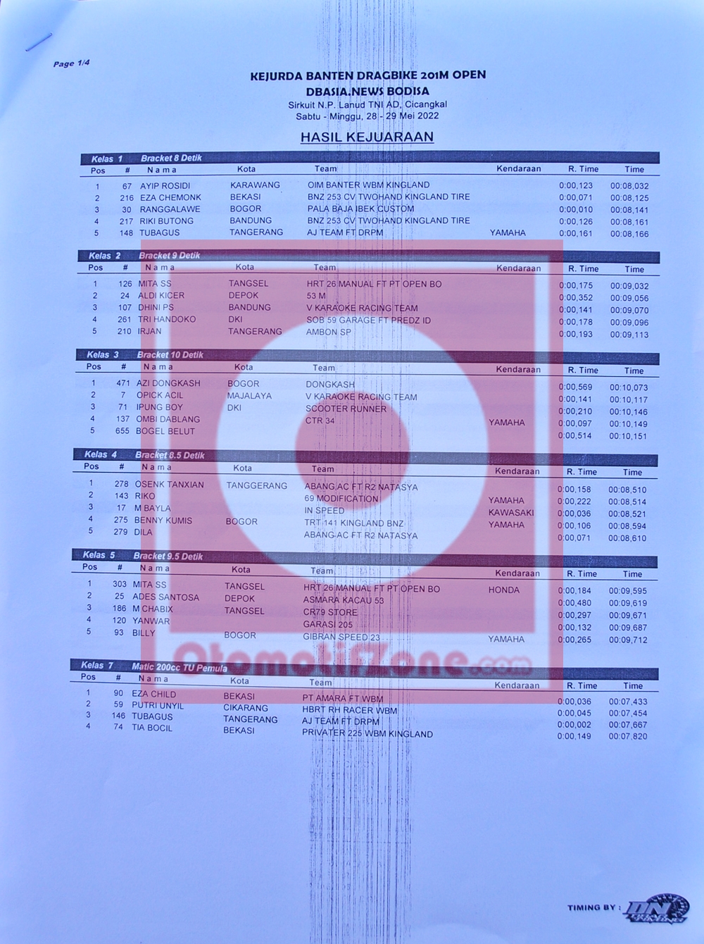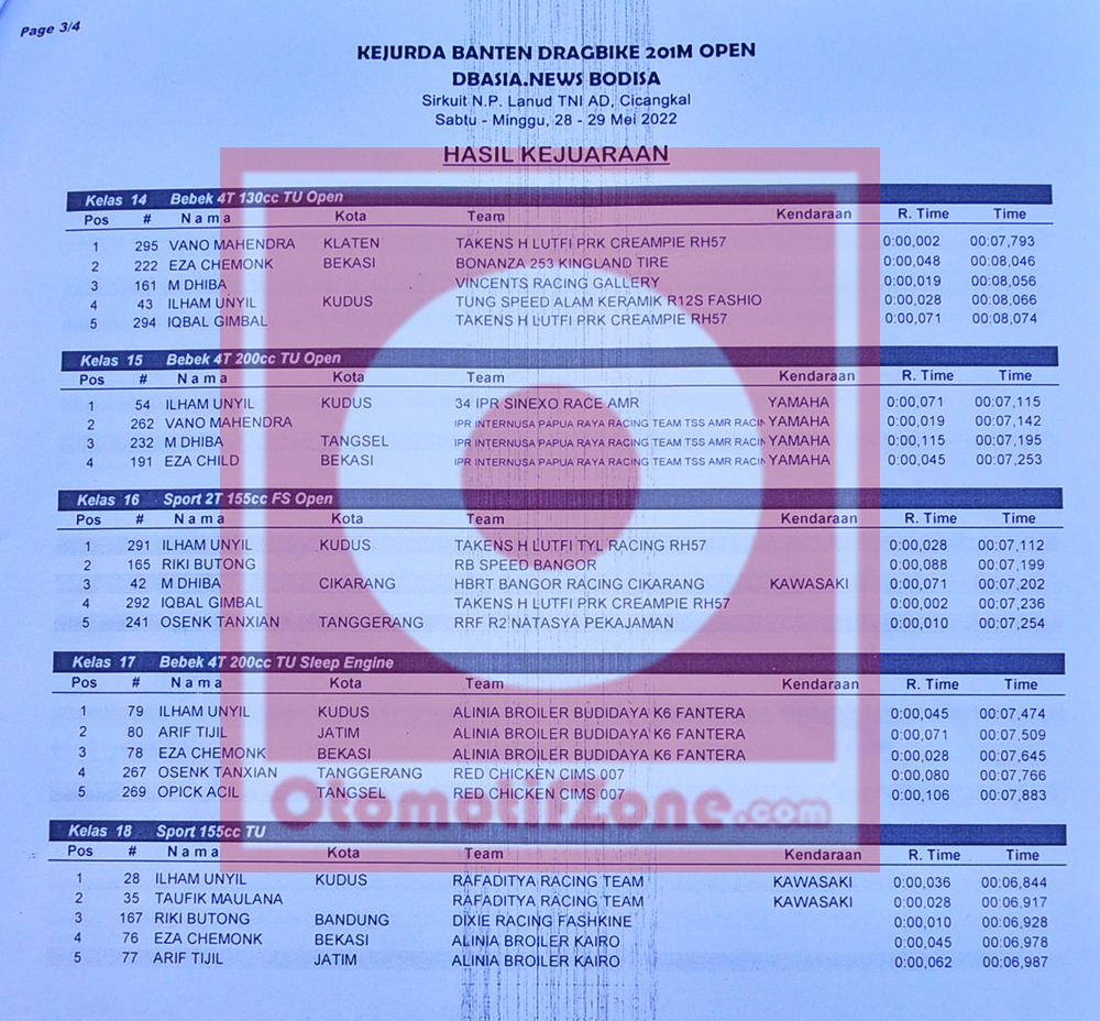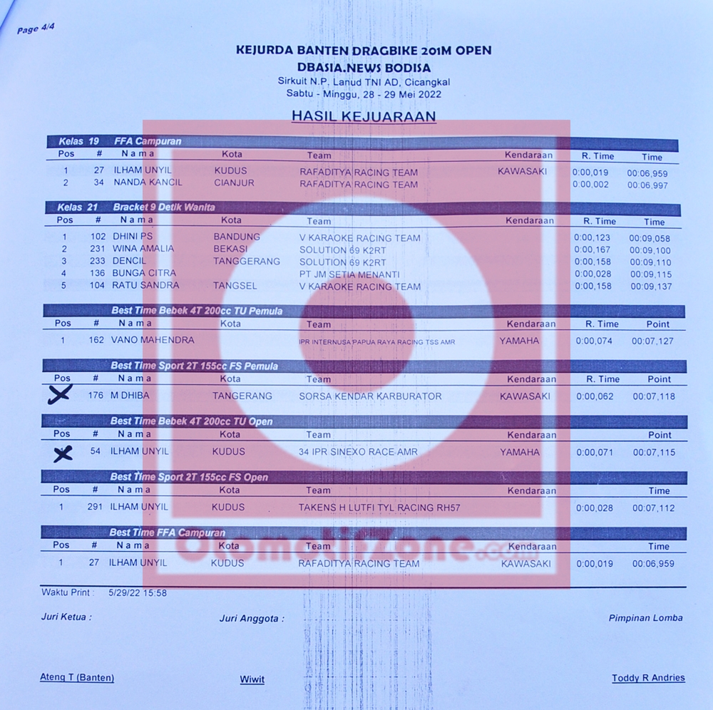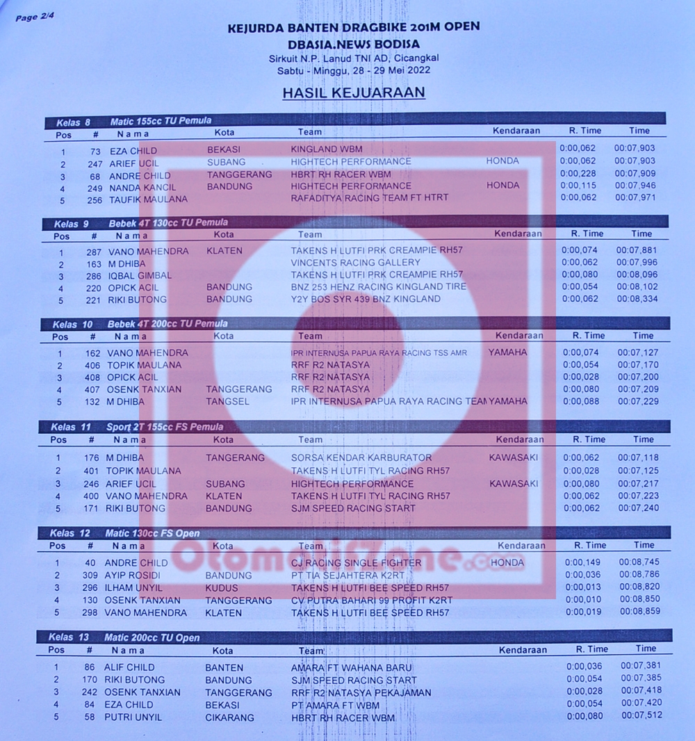 Berikut hasil keseluruhan dari gelaran Kejurda Banten Drag Bike 201 Meter Open DB Asia News Bodisa, yang berhasil Penulis rangkum.