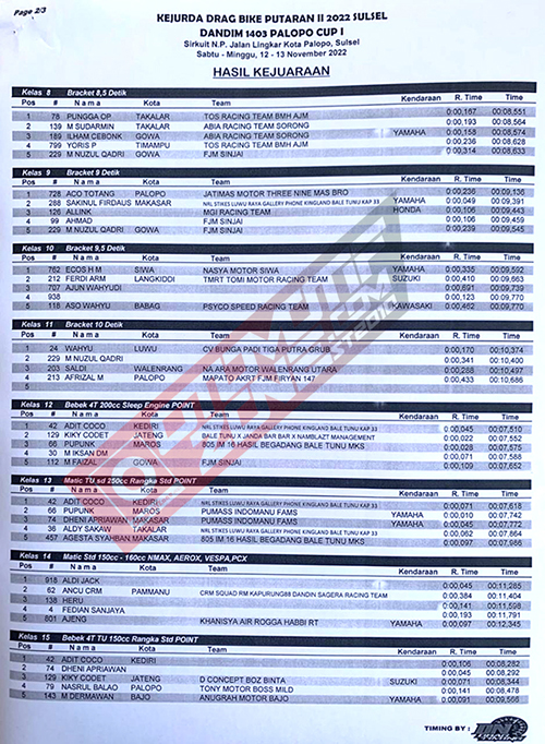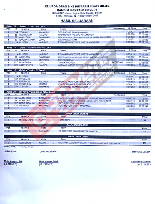 OtomotifZone.com – Palopo. Usai sudah gelaran Kejuaraan Kejurda Dragbike Putaran II IMI Sulsel 2022 memperebutkan Piala Dandim 1403 Palopo Cup I yang berlangsung di Sirkuit NP Jl. Lingkar Kota Palopo, Sulawesi Selatan (13/11). Dari banyak pembalap yang hadir dalam perebutan podium dalam adu skill joki dan mekanik, berikut adalah hasil juaranya.