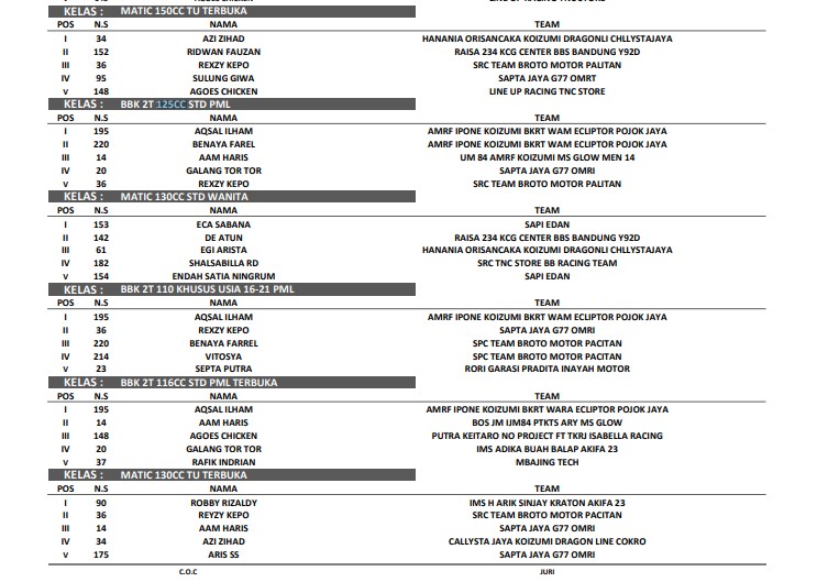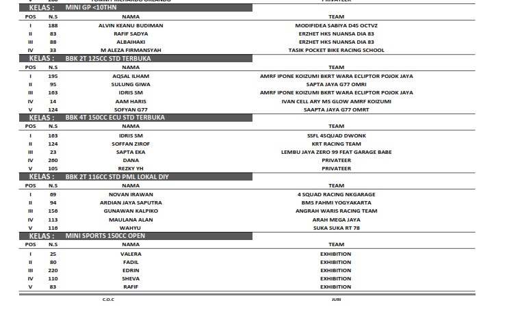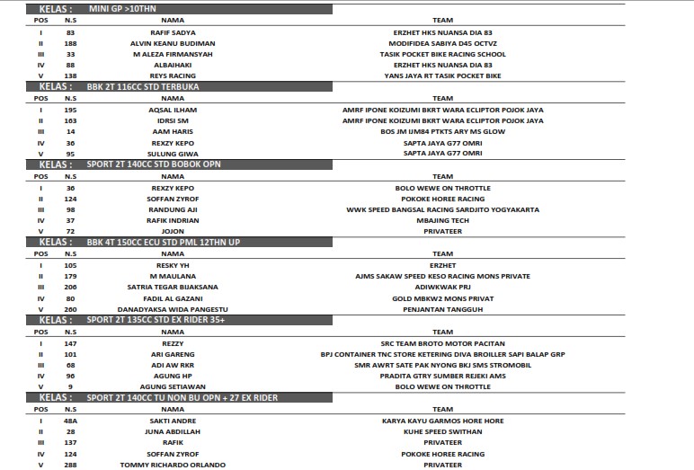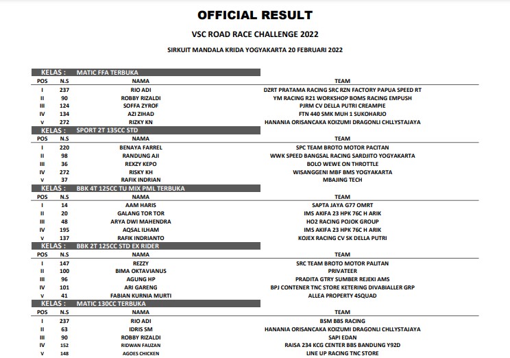 Berikut adalah hasil keseluruhan VSC Road Race Challenge 2022 yang berlangsung di sirkuit Mandala Krida :