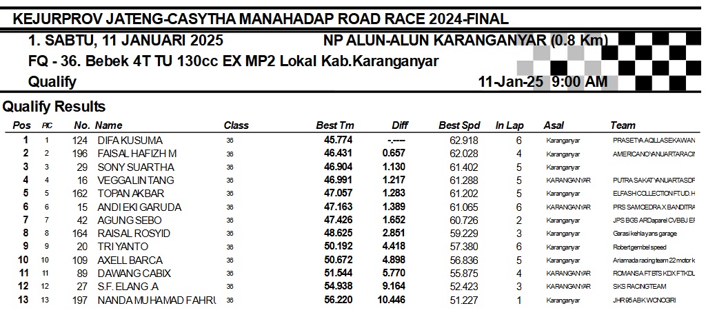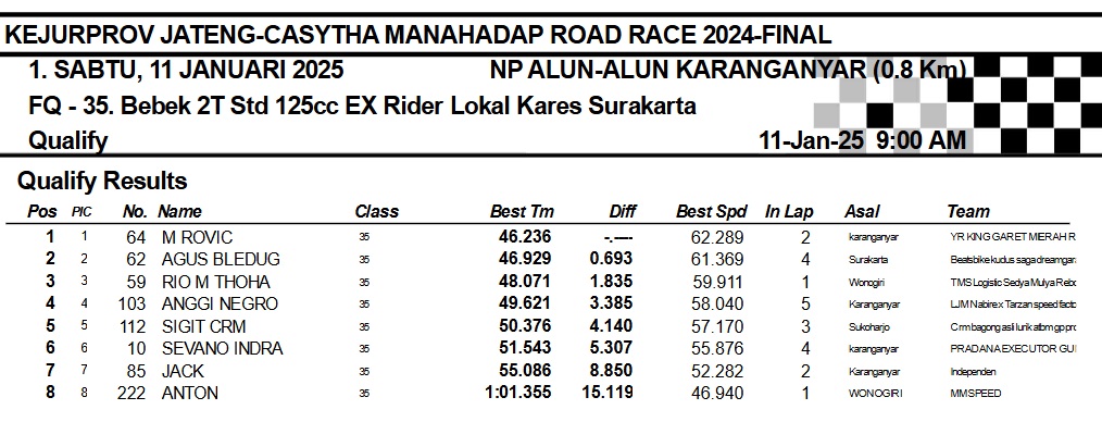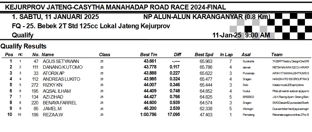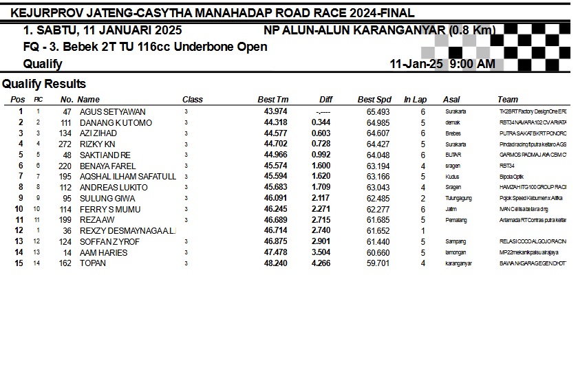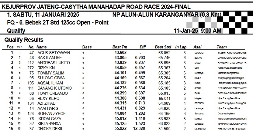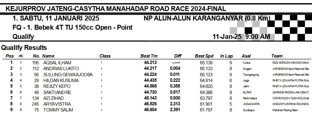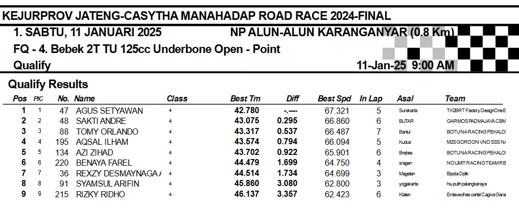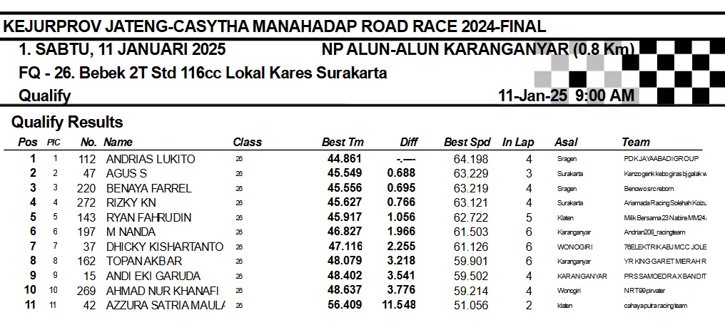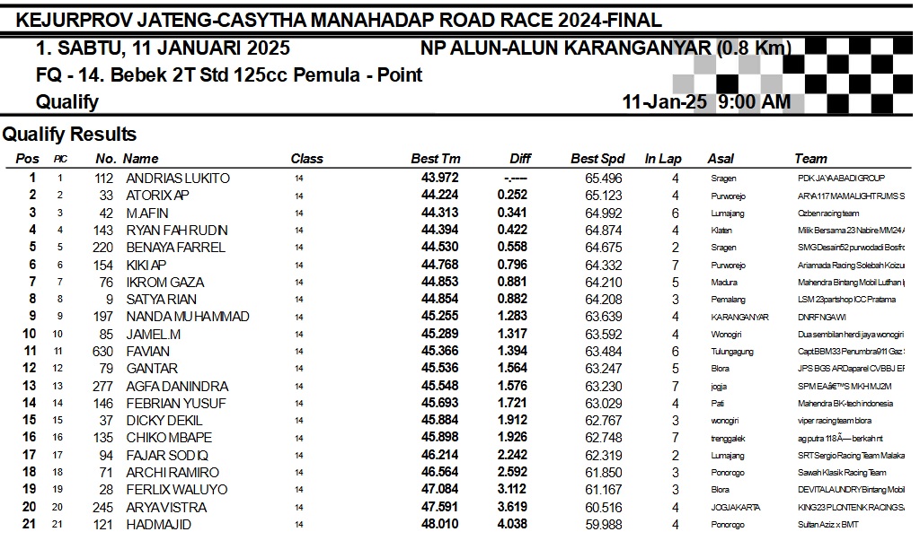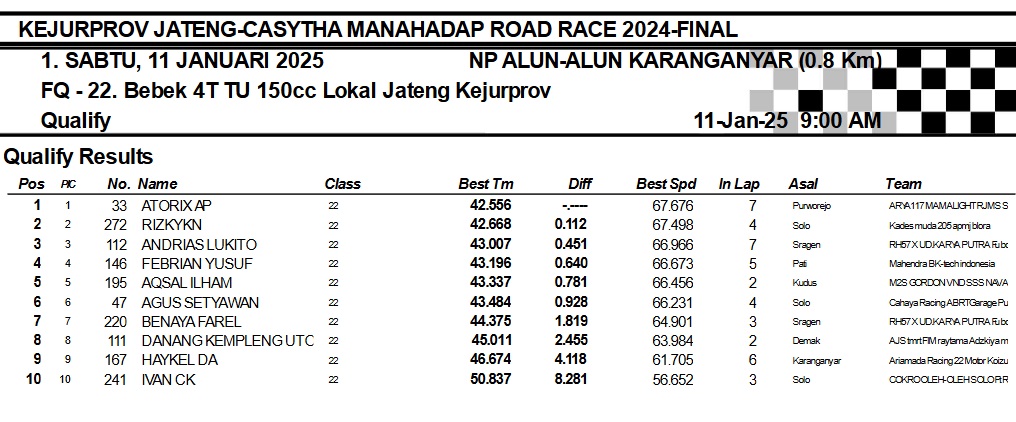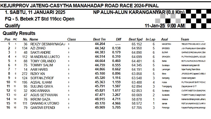 OtomotifZone.com-Karanganyar. Banyak kelas yang tersaji membuat sabtu kemarin full day untuk sesi kualifikasi. Berikut hasil yang sudah kami himpun pada babak Kualifikasi Casytha Manahadap Road Race Championship 2024 sirkuit Alun-Alun Karanganyar, Jawa Tengah 11 Januari 2025.