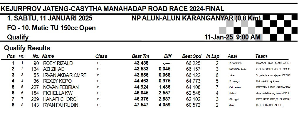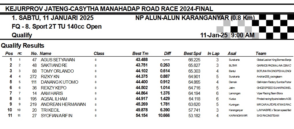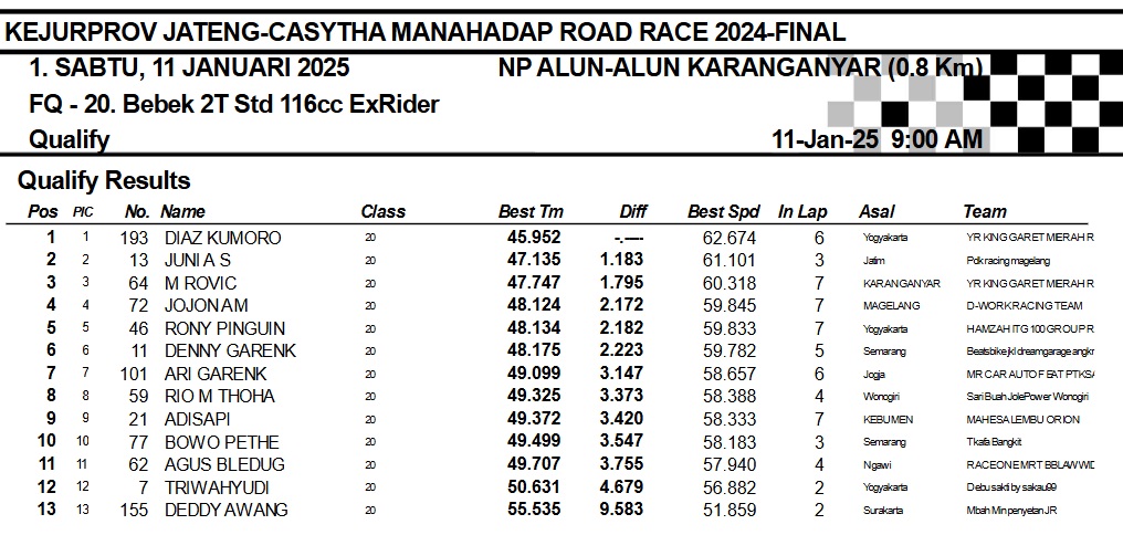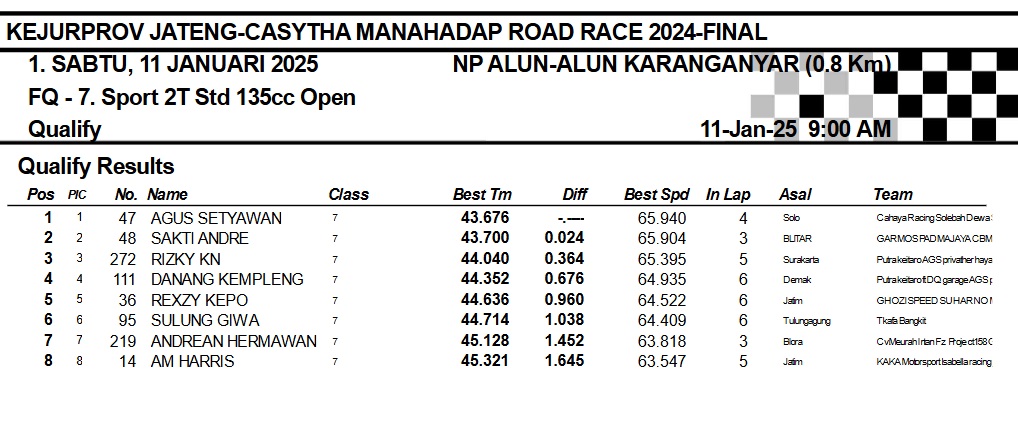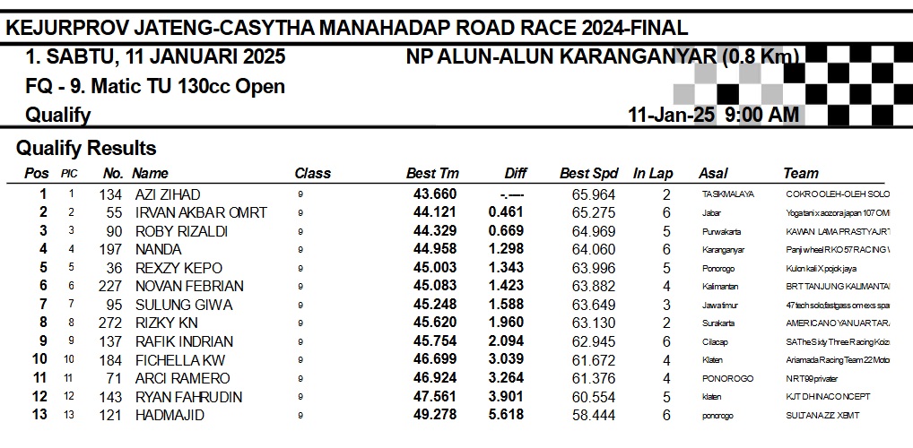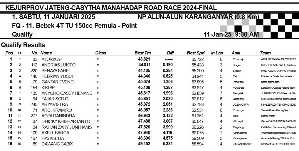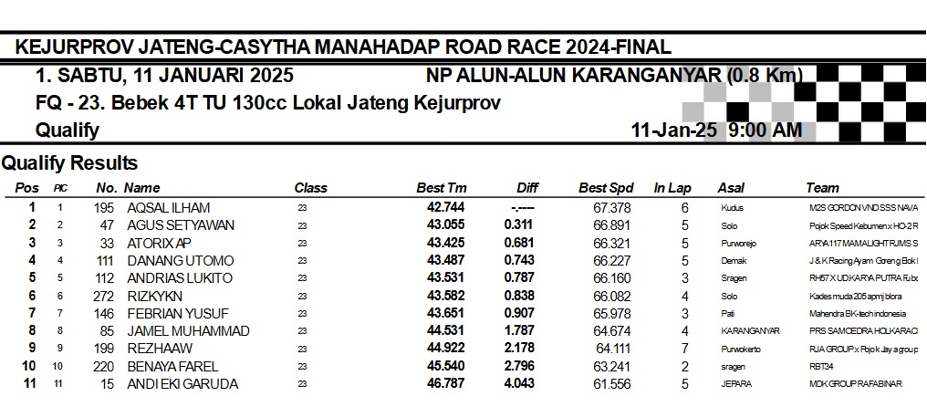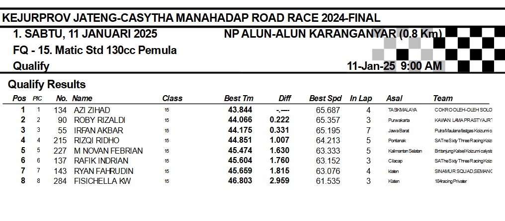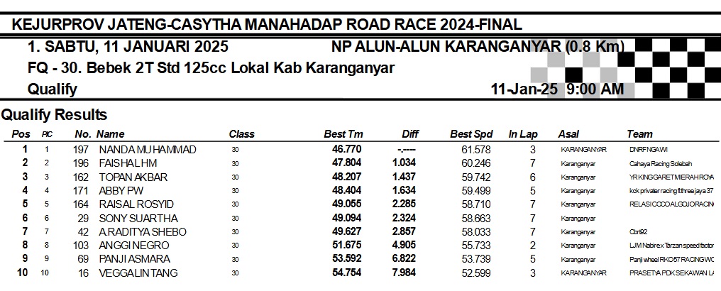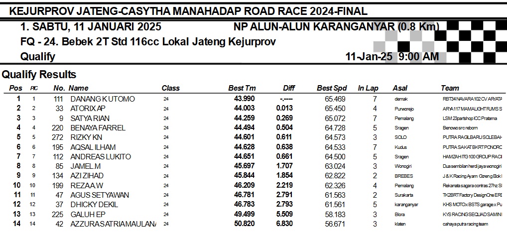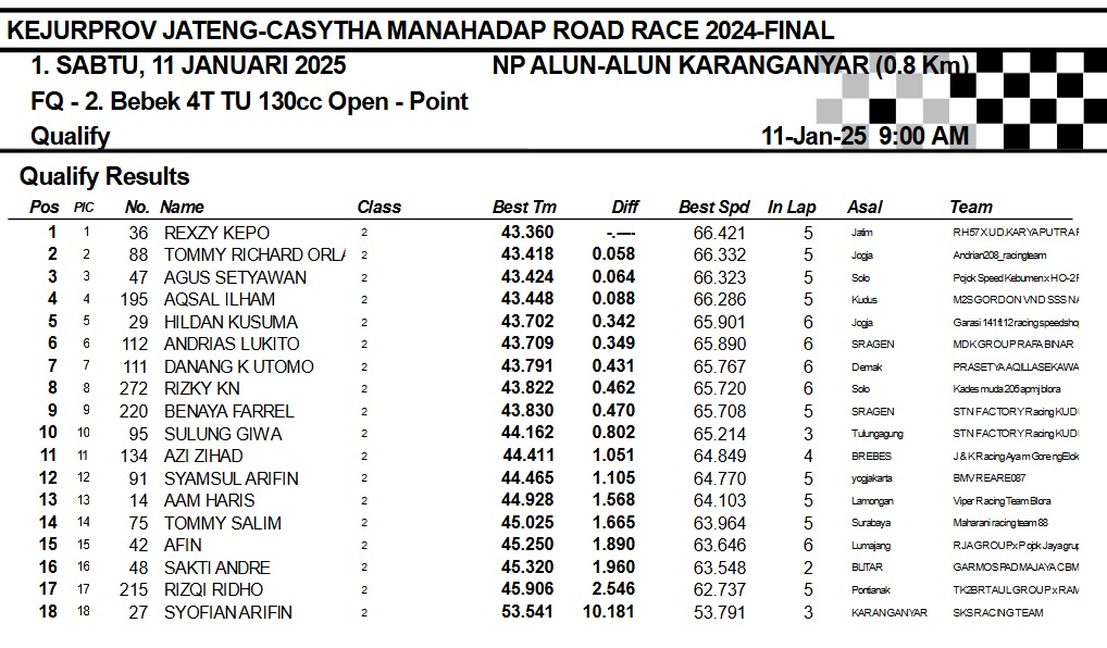 OtomotifZone.com-Karanganyar. Banyak kelas yang tersaji membuat sabtu kemarin full day untuk sesi kualifikasi. Berikut hasil yang sudah kami himpun pada babak Kualifikasi Casytha Manahadap Road Race Championship 2024 sirkuit Alun-Alun Karanganyar, Jawa Tengah 11 Januari 2025.