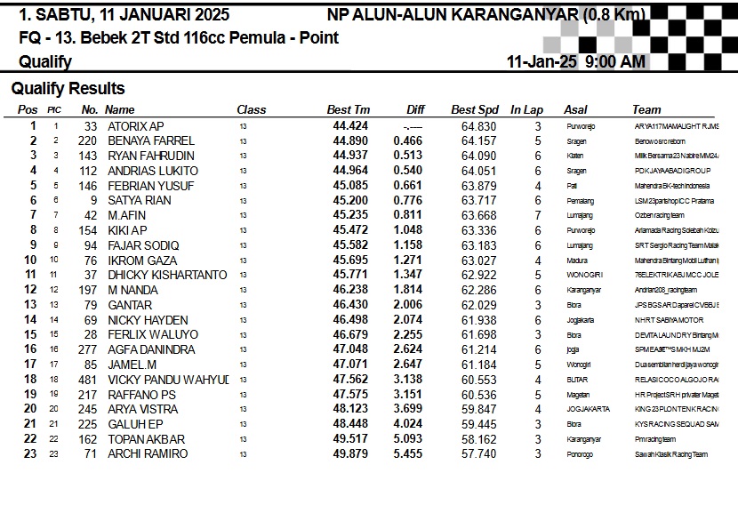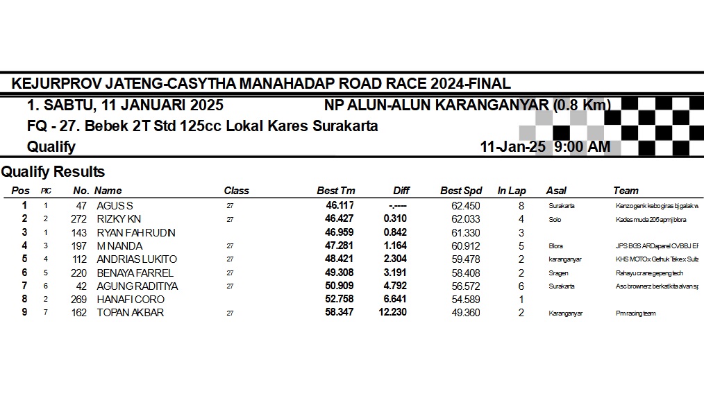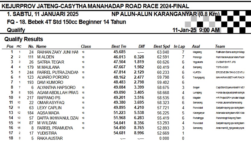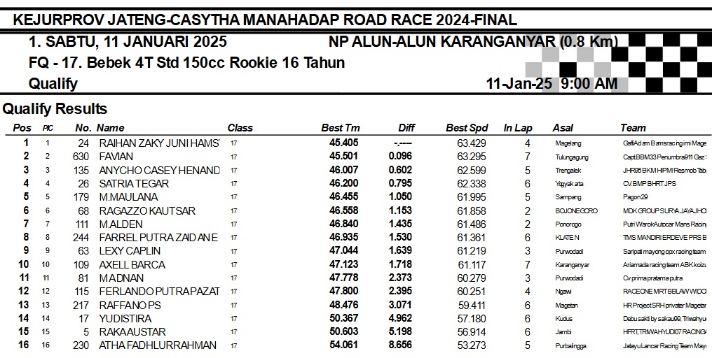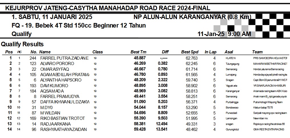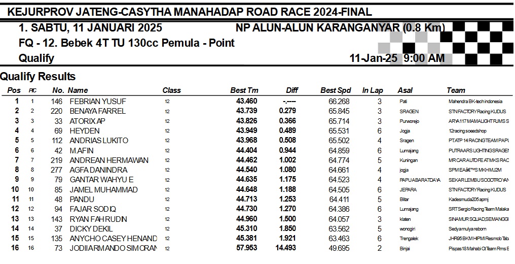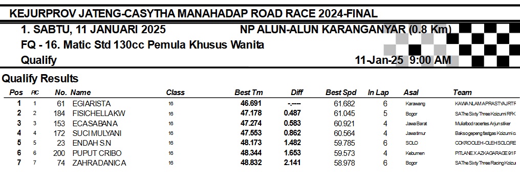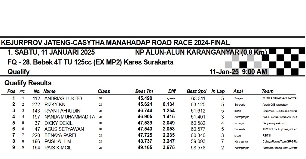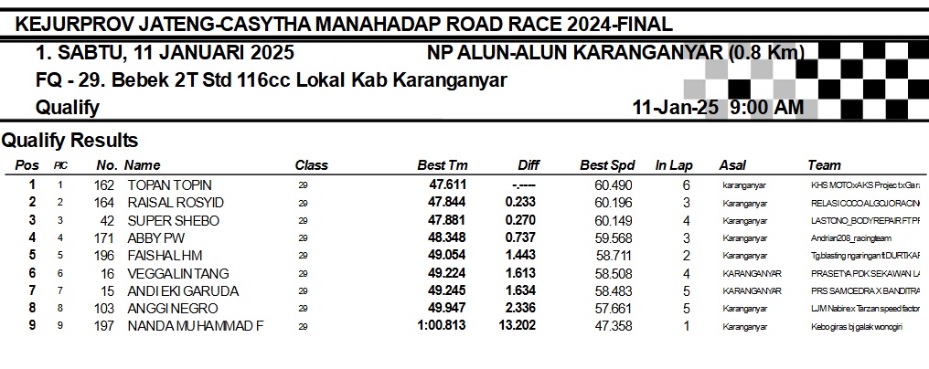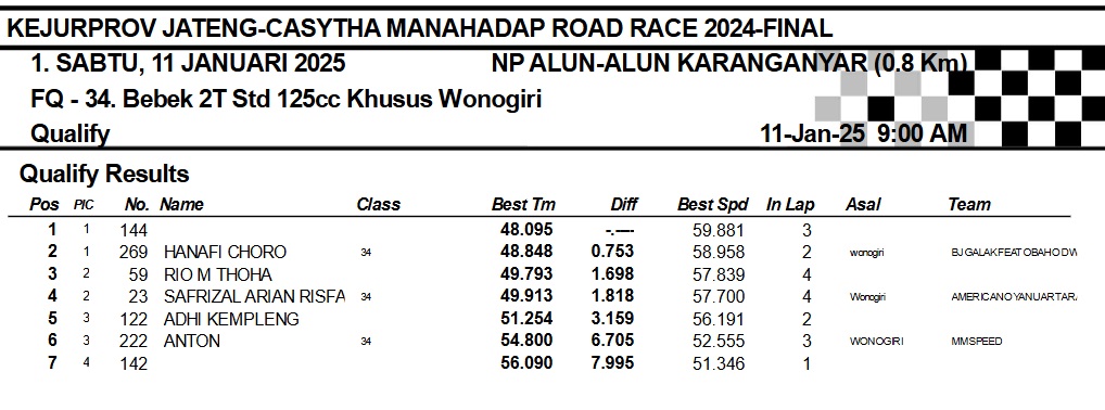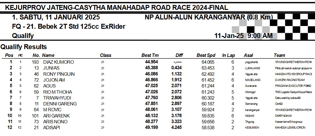 OtomotifZone.com-Karanganyar. Banyak kelas yang tersaji membuat sabtu kemarin full day untuk sesi kualifikasi. Berikut hasil yang sudah kami himpun pada babak Kualifikasi Casytha Manahadap Road Race Championship 2024 sirkuit Alun-Alun Karanganyar, Jawa Tengah 11 Januari 2025.