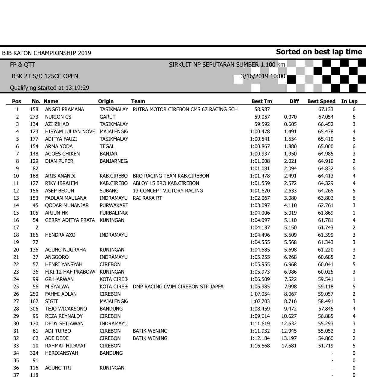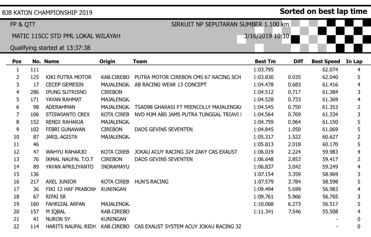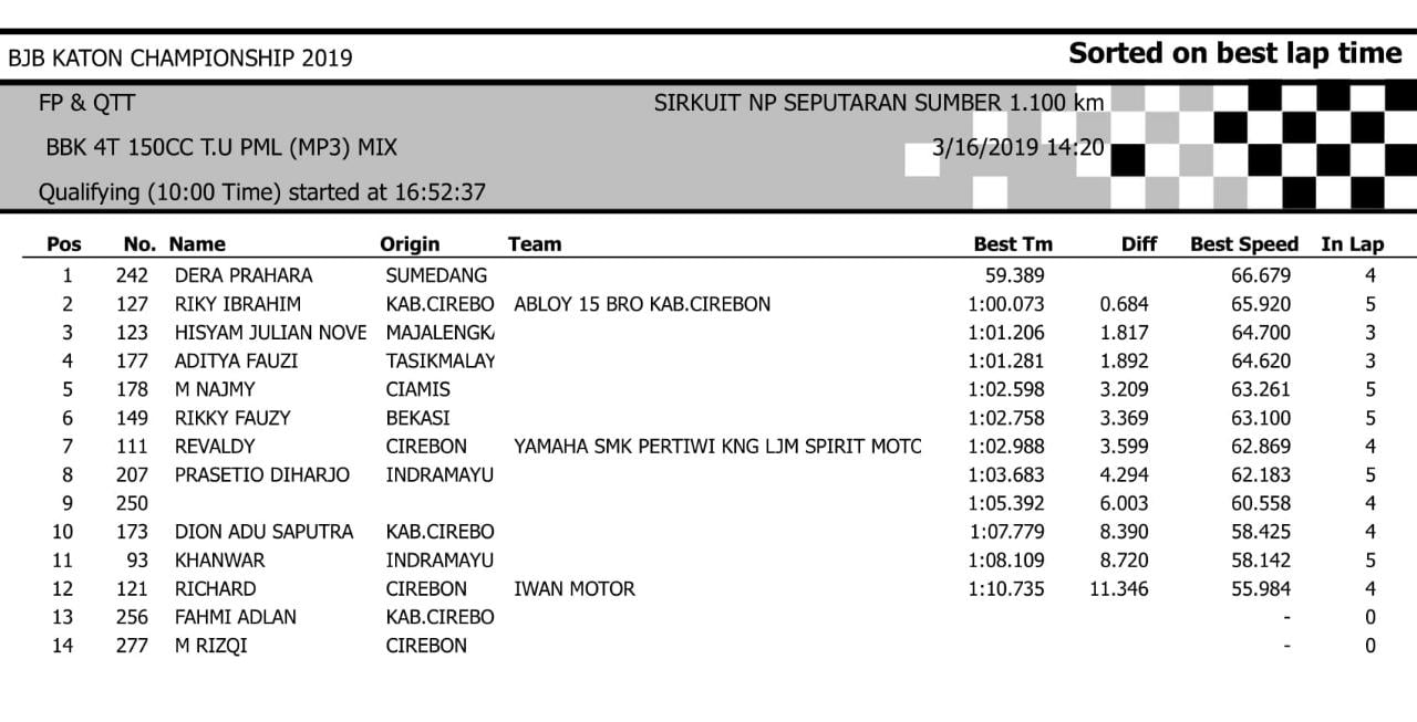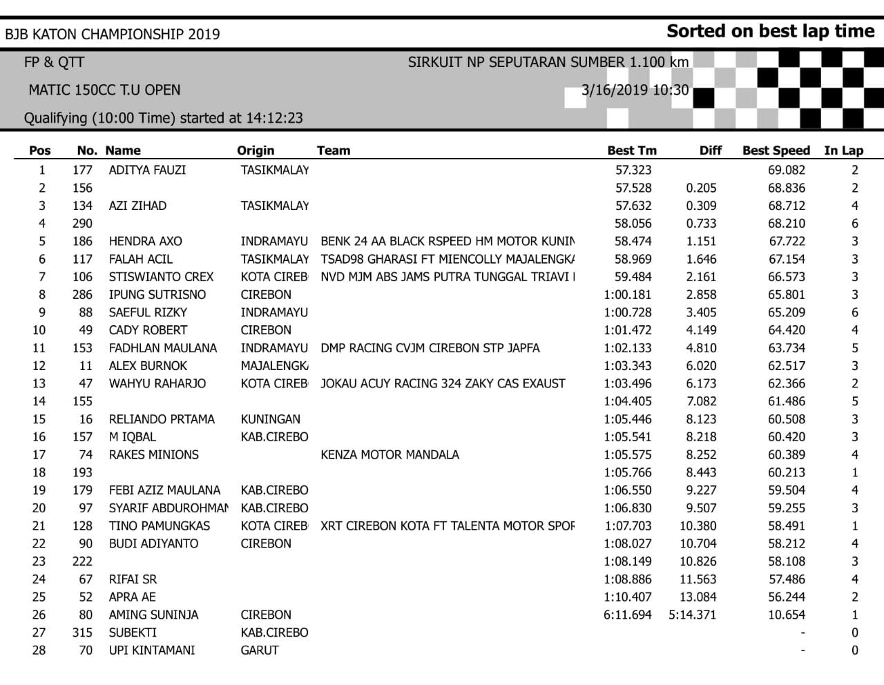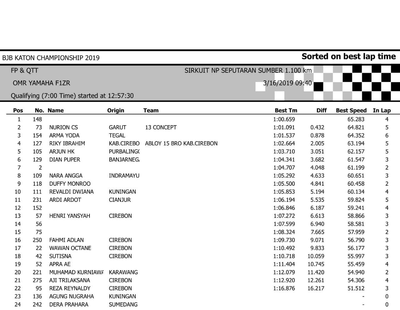 Race ResultsRacing Roda 2Road Race Hasil Kualifikasi Gelaran Cirebon Katon Championship 2019 Penulis OtomotifZone.com - 16 Maret 2019 0 3132 FacebookXPinterestWhatsApp OtomotifZone.com – Cirebon. Berikut adalah hasil kualifikasi gelaran Cirebon Katon Championship 2019 yang berlangsung di sirkuit Seputaran Pemda Kabupaten Cirebon, (16/3).