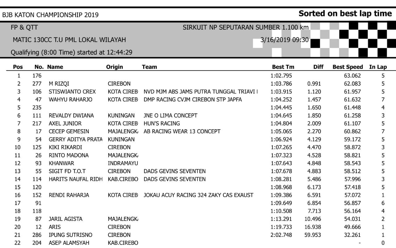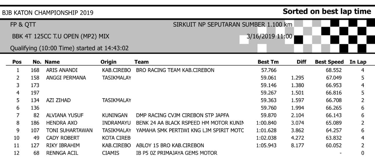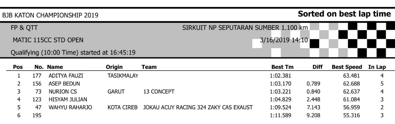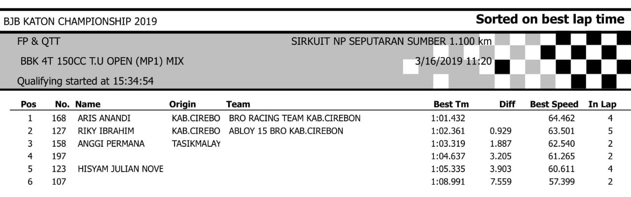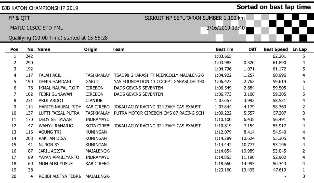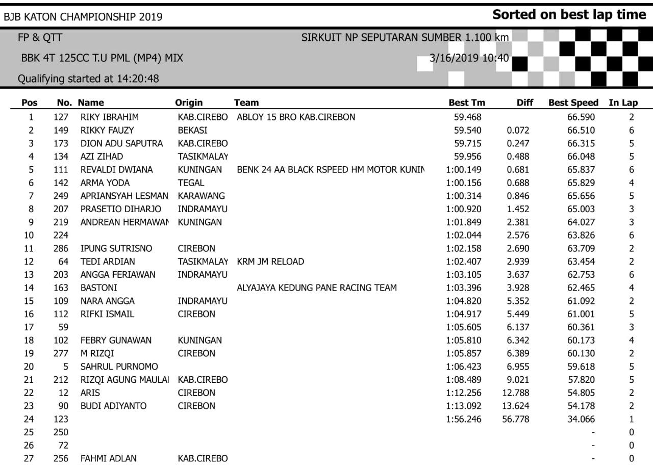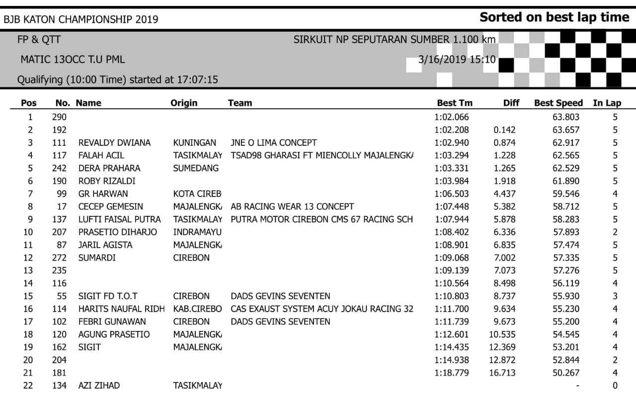 Race ResultsRacing Roda 2Road Race Hasil Kualifikasi Gelaran Cirebon Katon Championship 2019 Penulis OtomotifZone.com - 16 Maret 2019 0 3132 FacebookXPinterestWhatsApp OtomotifZone.com – Cirebon. Berikut adalah hasil kualifikasi gelaran Cirebon Katon Championship 2019 yang berlangsung di sirkuit Seputaran Pemda Kabupaten Cirebon, (16/3).
