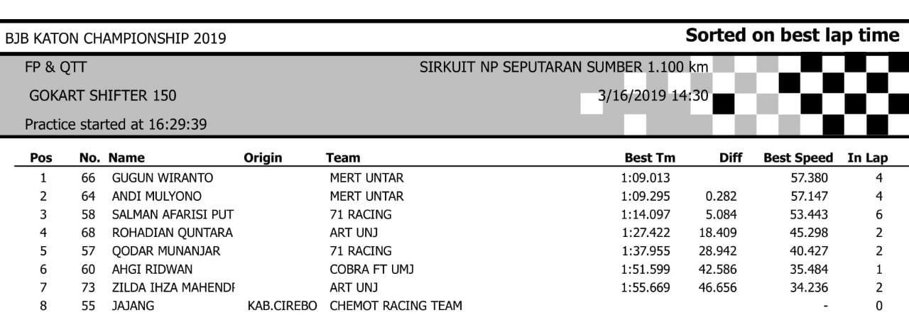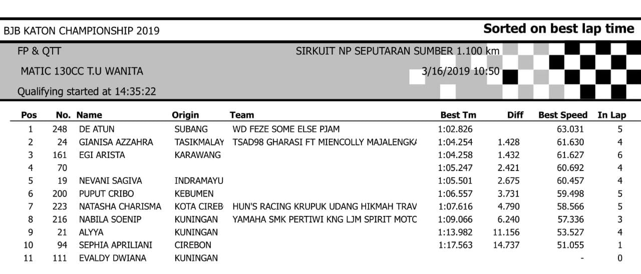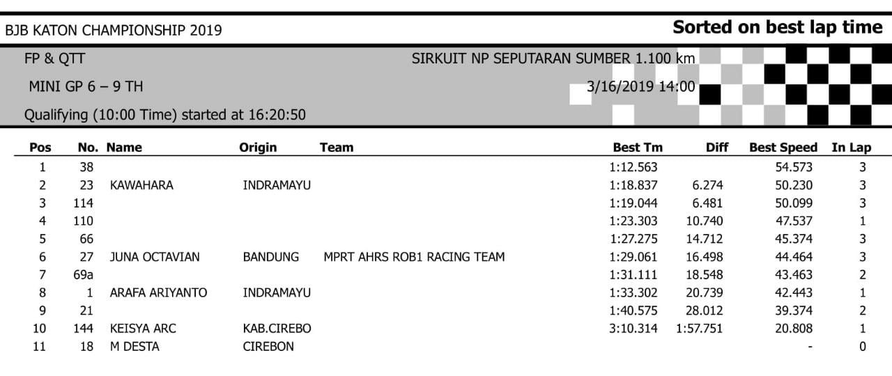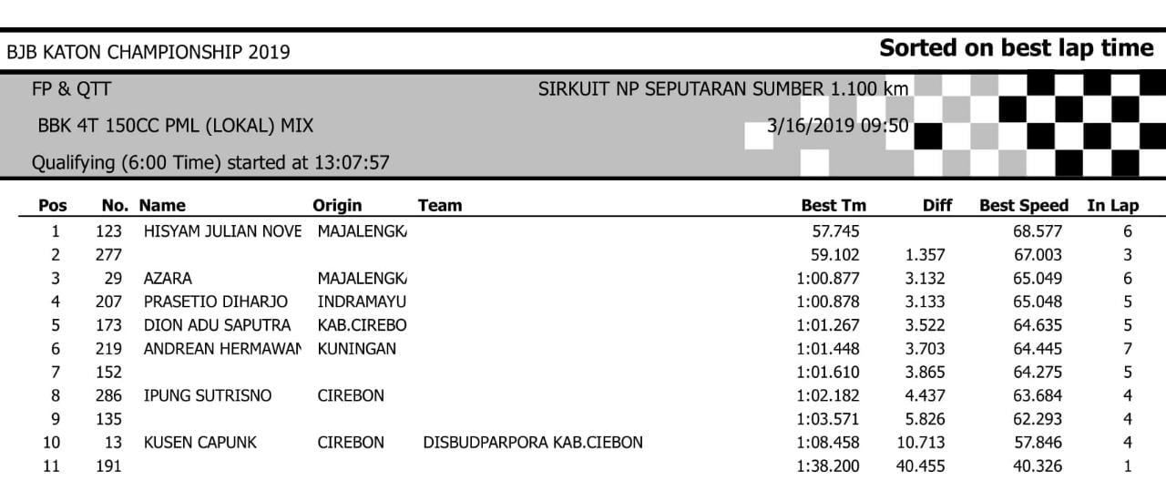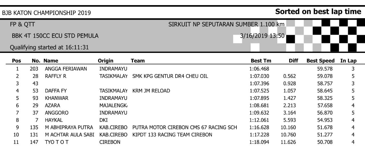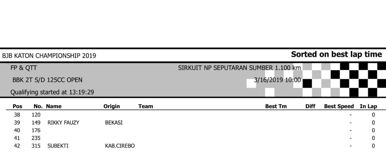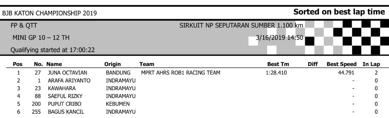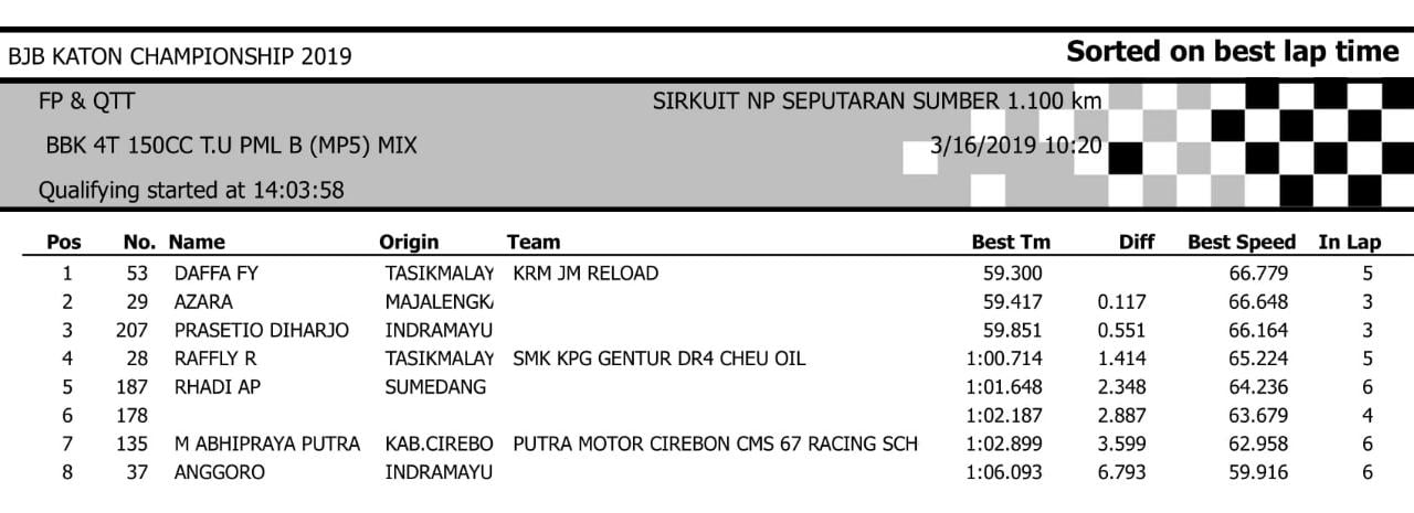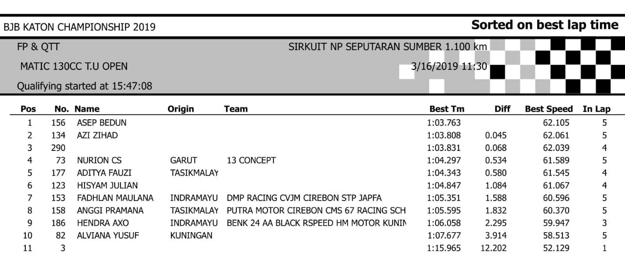 Race ResultsRacing Roda 2Road Race Hasil Kualifikasi Gelaran Cirebon Katon Championship 2019 Penulis OtomotifZone.com - 16 Maret 2019 0 3132 FacebookXPinterestWhatsApp OtomotifZone.com – Cirebon. Berikut adalah hasil kualifikasi gelaran Cirebon Katon Championship 2019 yang berlangsung di sirkuit Seputaran Pemda Kabupaten Cirebon, (16/3).