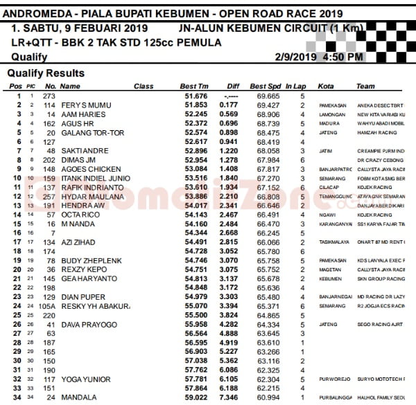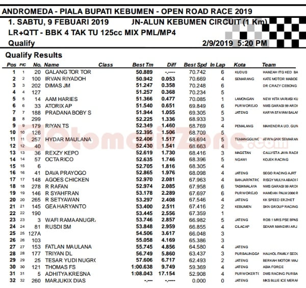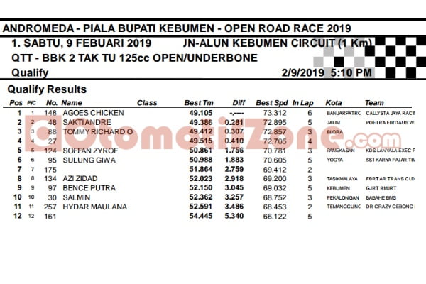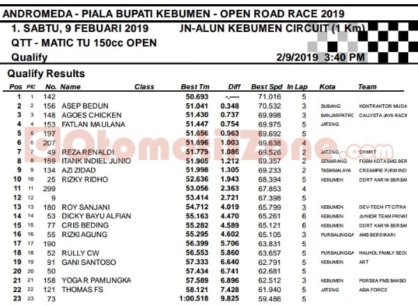 Race ResultsRacing Roda 2Road Race Hasil Kualifikasi Road Race Piala Wakil Bupati Kebumen 9-10 Februari 2019 Penulis Hafid Hapid - 9 Februari 2019 0 3715 FacebookXPinterestWhatsApp OtomotifZone.com-Kebumen. Berikut hasil kualifikasi Road Race Piala Wakil Bupati Kebumen 9-10 Februari 2019 di sirkuit Alun-alun kota Kebumen. Penulis : Hafid | Foto : Hafid
