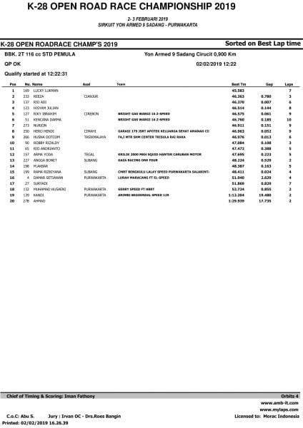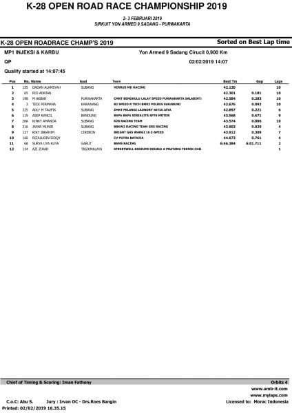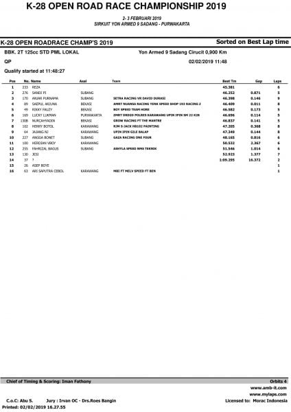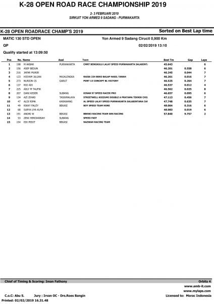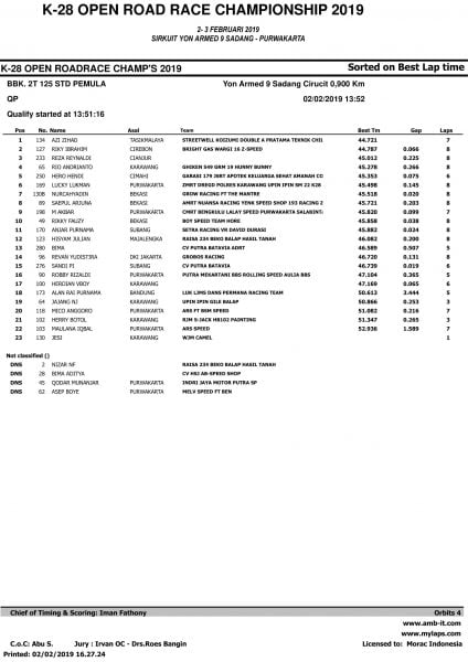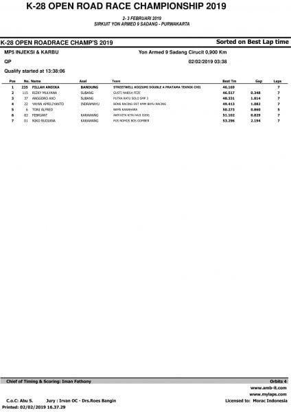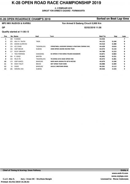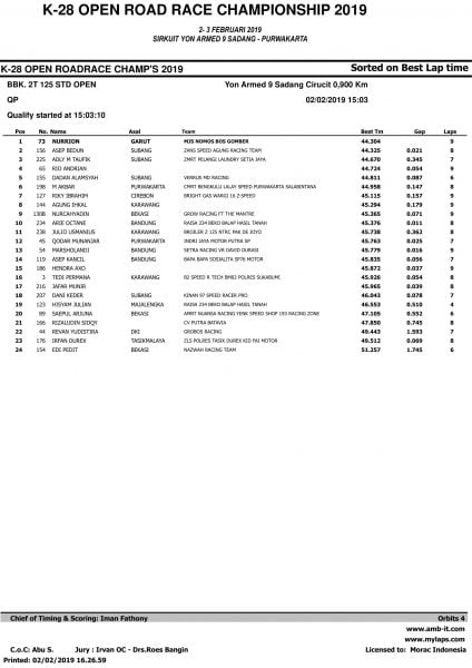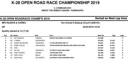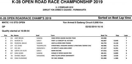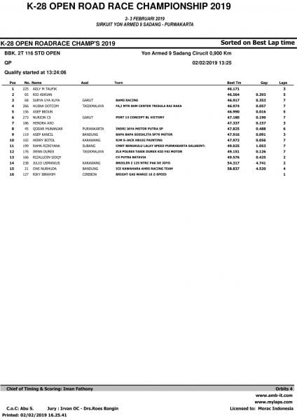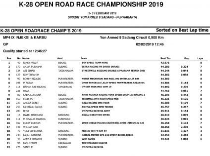 Race ResultsRacing Roda 2Road Race Hasil Kualifikasi Road Race Purwakarta 2019 Penulis OtomotifZone.com - 2 Februari 2019 0 5485 FacebookXPinterestWhatsApp OtomotifZone.com – Purwakarta. Berikut ini adalah hasil kualifikasi Road Race Purwakarta 2019 yang berlangsung di sirkuit Yon Armed 9 Sadang, Purwakarta, Sabtu (2/2).
