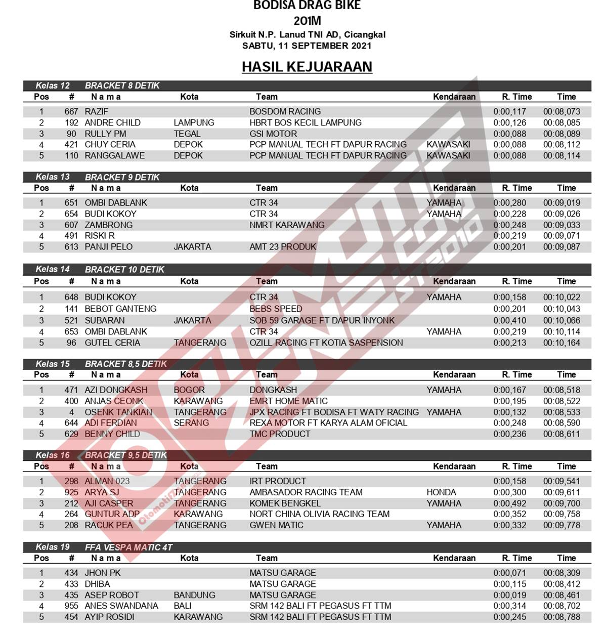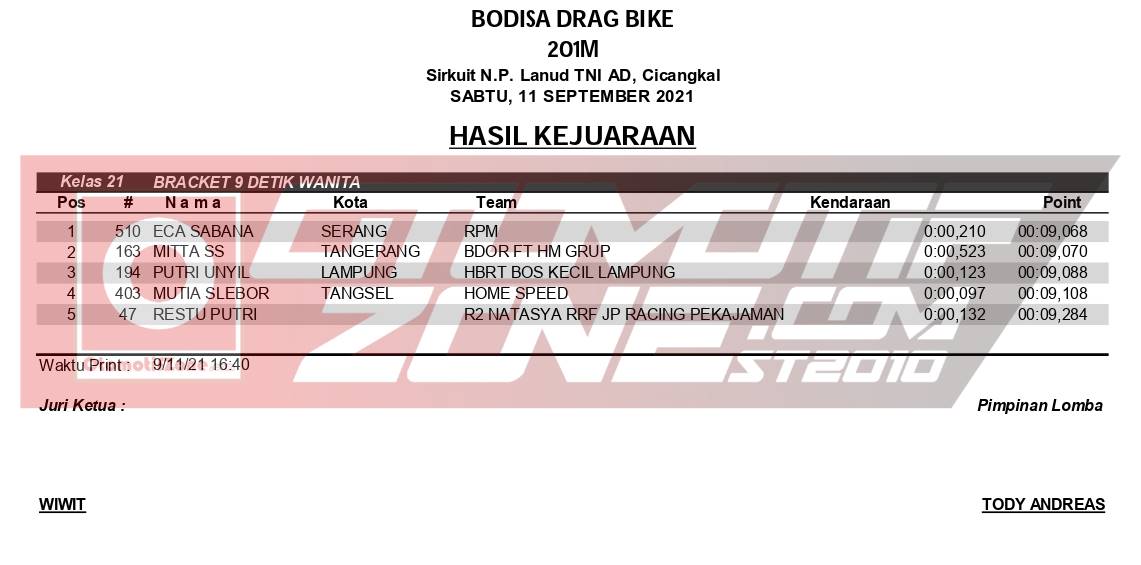 OtomotifZone.com – Tangerang. Akhir pekan ini Drag Bike Bodisa diselenggarakan (12/9/21) di Sirkuit Lanud TNI AU Cicangkal. Dan ajang balap yang digarap oleh H. Bahrudin diselenggarakan dengan baik. Semua acara berjalan dengan mulus dengan mematuhi Prokes. Namun event ini sangat tercium aroma persaingan panas.