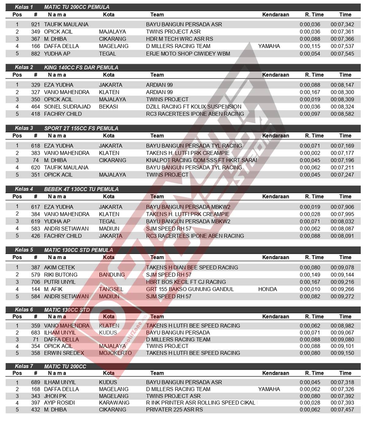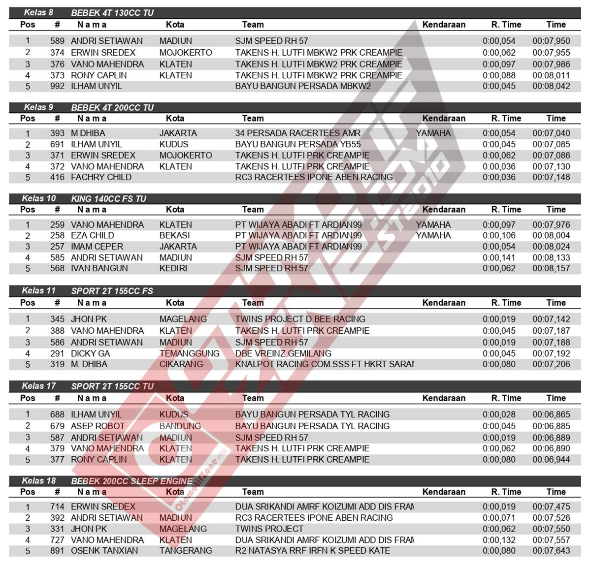 Kenapa tidak, para tim dan pebalap papan atas ikut memanaskan persaingan. Mereka tidak ada yang mau kalah. Kemenangan diincar untuk menjadi yang terbaik. Gengsi memanas disetiap kelas yang dibuka. Pebalap terbaik keluar sebagai juara. Berikut daftar juara disetiap kelas Bodisa Drag Bike: