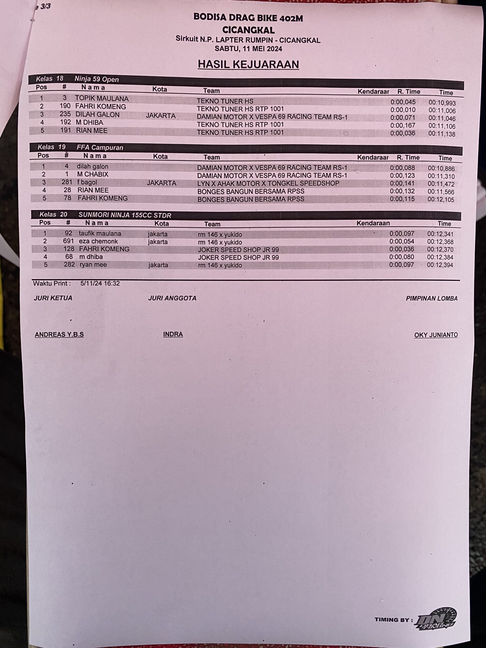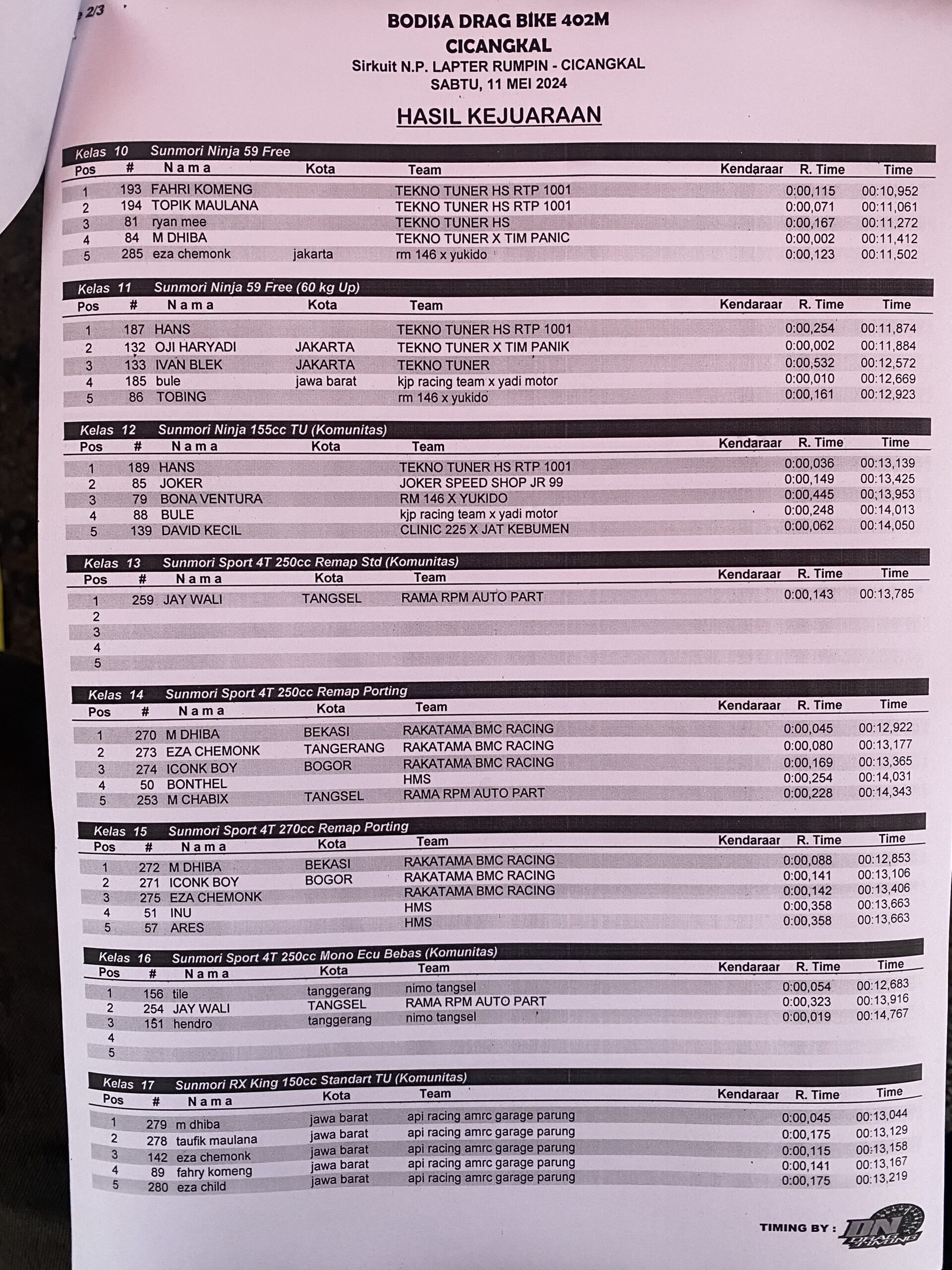 Berikut hasil lengkap dari Bodisa Drag Bike 402 Meter Mei 2024, yang berhasil Penulis rangkum.