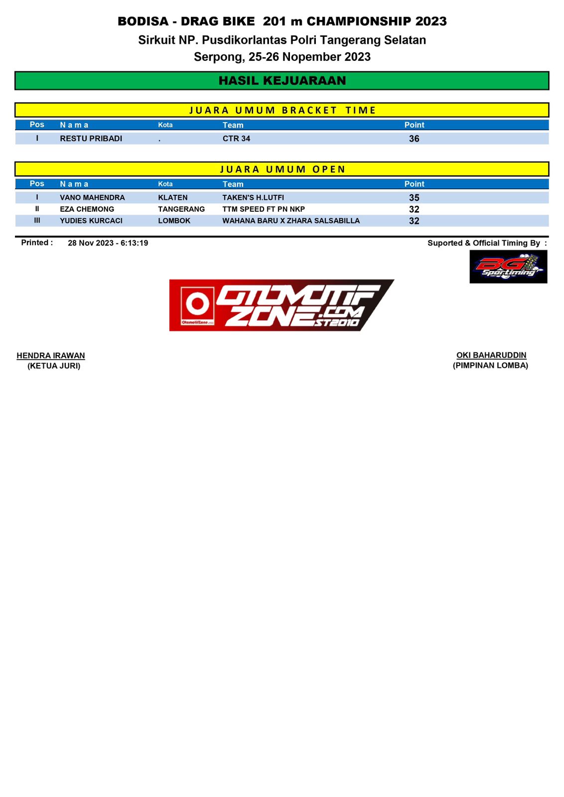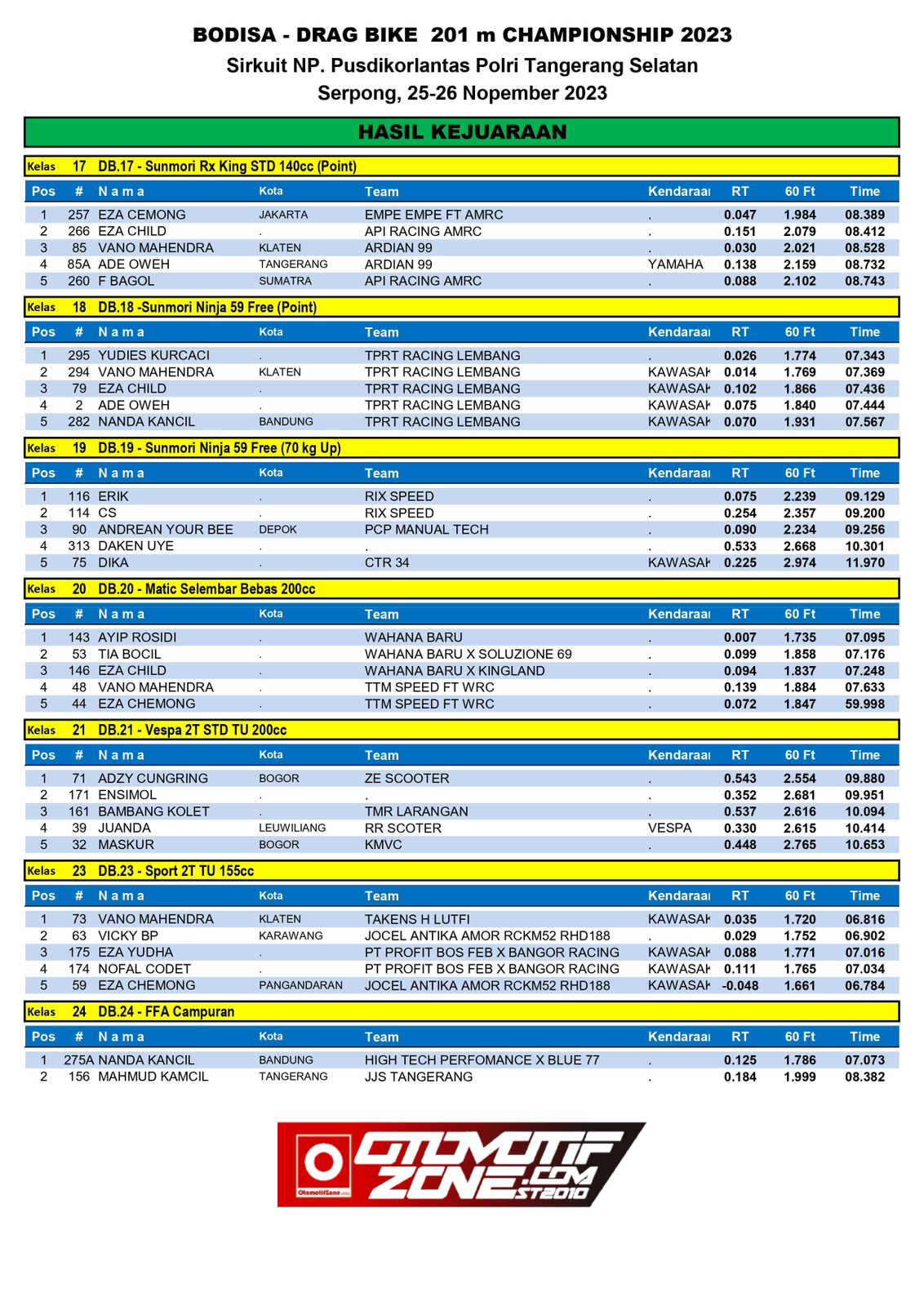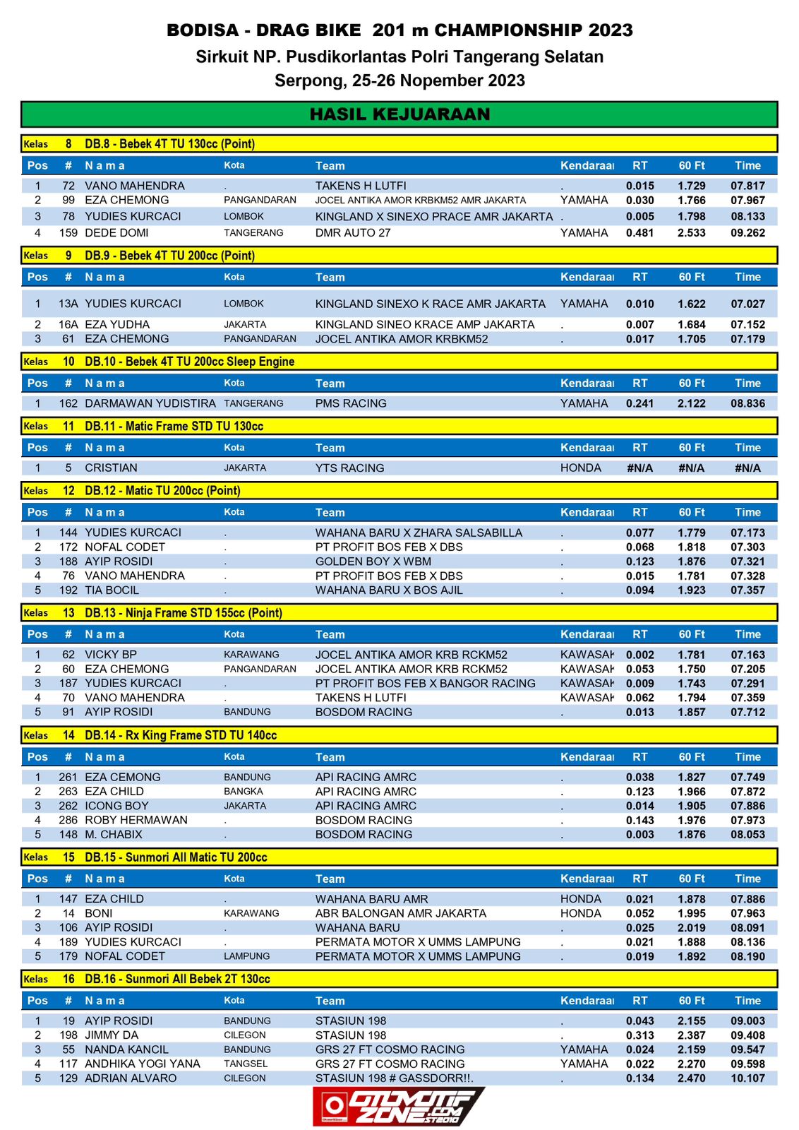 Berikut hasil lengkap dari Bodisa Drag Bike ISDC 2023, yang berhasil Penulis rangkum.