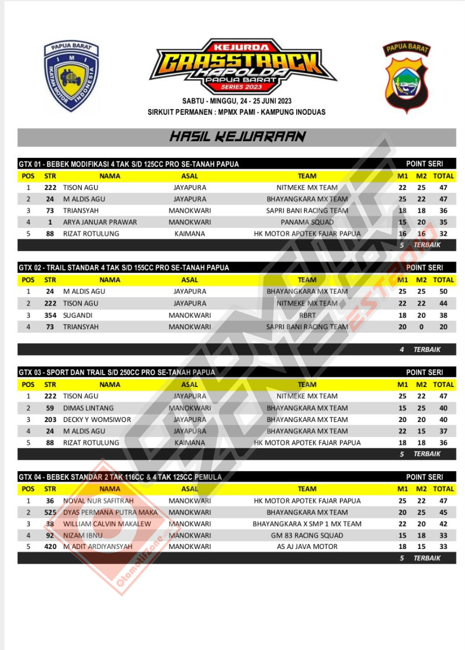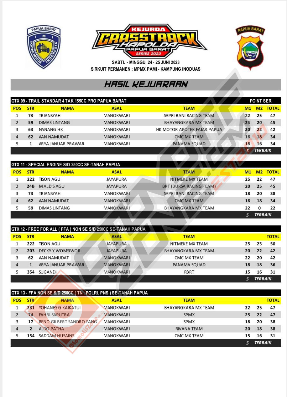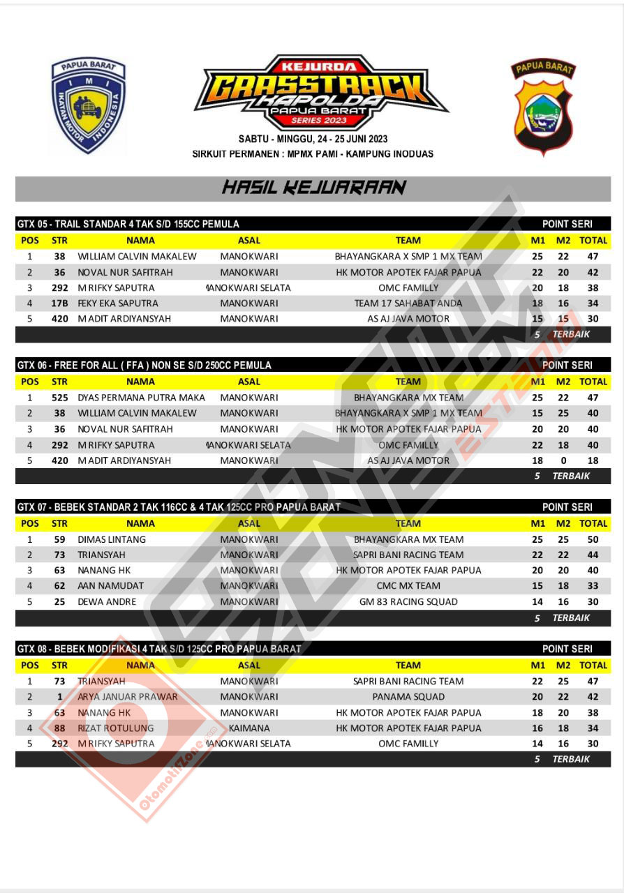 Balapan pada Kejurda grasstrack Kapolda Papua Barat Series 2023 tersebut juga menunjukan aksi yang luar biasa. Persaingan yang begitu ketat terlihat jelas untuk memperebutkan poin penuh pada final round tersebut guna mendapatkan tahta juara umum dan jawara setiap kelasnya.