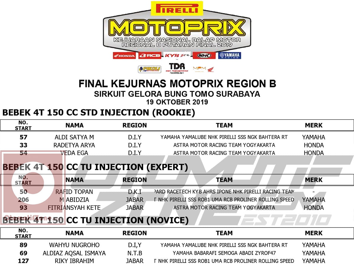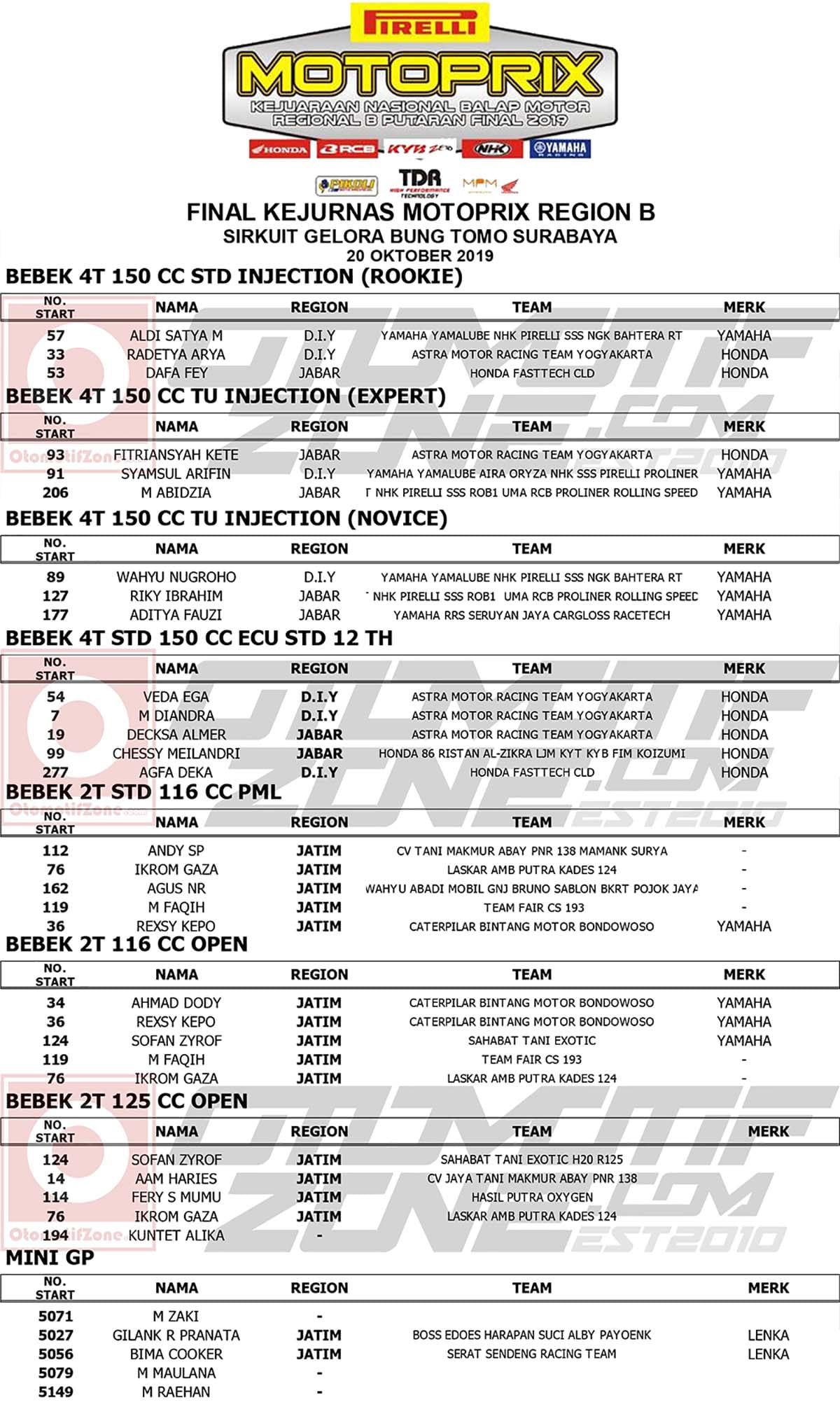 OtomotifZone.com – Surabaya. Berikut hasil lengkap Kejuaraan Nasional Motoprix putaran 4 Final Region B – 2019. Yang diselenggarakan di Sirkuit permanen Gelora Bung Tomo Surabaya. Hari Sabtu – Minggu , 19 – 20 Oktober 2019.