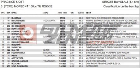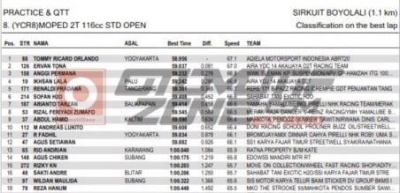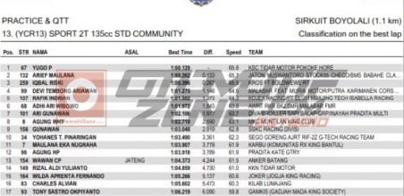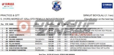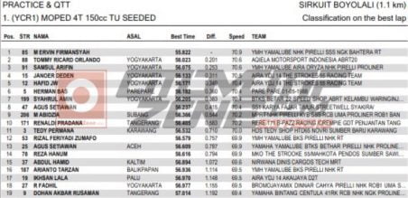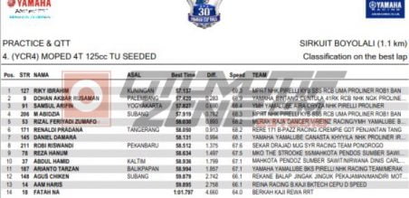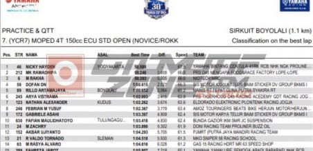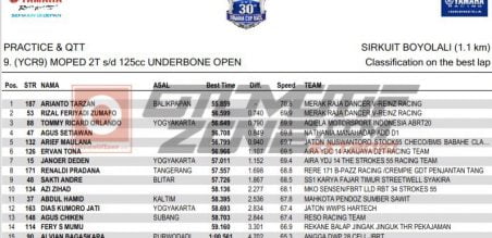 OtomotifZone.com – Boyolali. Berikut adalah hasil keseluruhan kualifikasi Yamaha Cup Race 2019 seri 1 yang berlangsung di sirkuit permanen Boyolali (27/4). Pertarungan sengit dari tim – tim garputala pada seri perdana ini tentunya sangat sengit, karena tidak hanya tim – tim yang berasal dari pulau Jawa saja yang hadir, tetapi tim – tim dari luar Jawa semisal tim dari Sumatra, tim dari Sulawesi juga turut meramaikan gelaran perdana Yamaha Cup Race 2019 seri perdana kali ini. Berikut adalah hasil lengkap kualifikasi Yamaha Cup Race 2019 seri 1 :