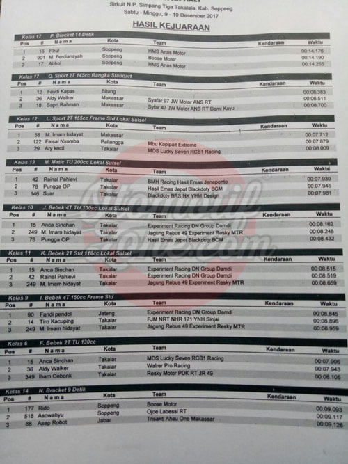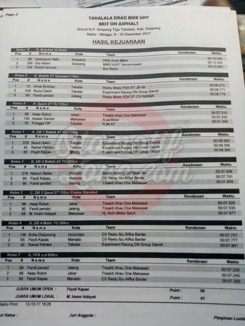 Race Results Hasil Lengkap Takalala Drag Bike 2017 Best On Asphalt Penulis otomotifzone - 10 Desember 2017 0 3612 FacebookXPinterestWhatsApp Otomotifzone.com – Soppeng. Berikut ini adalah hasil lengkap Takalala Drag Bike 2017 Best On Asphalt yang berlangsung di sirkuit Simpang Tiga Takalala, Sulawesi Selatan, Minggu (10/12) : Penulis : Aji Wawan