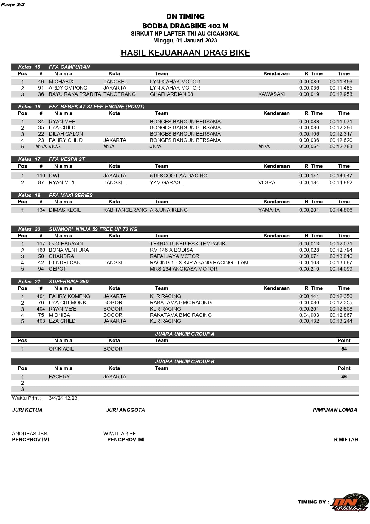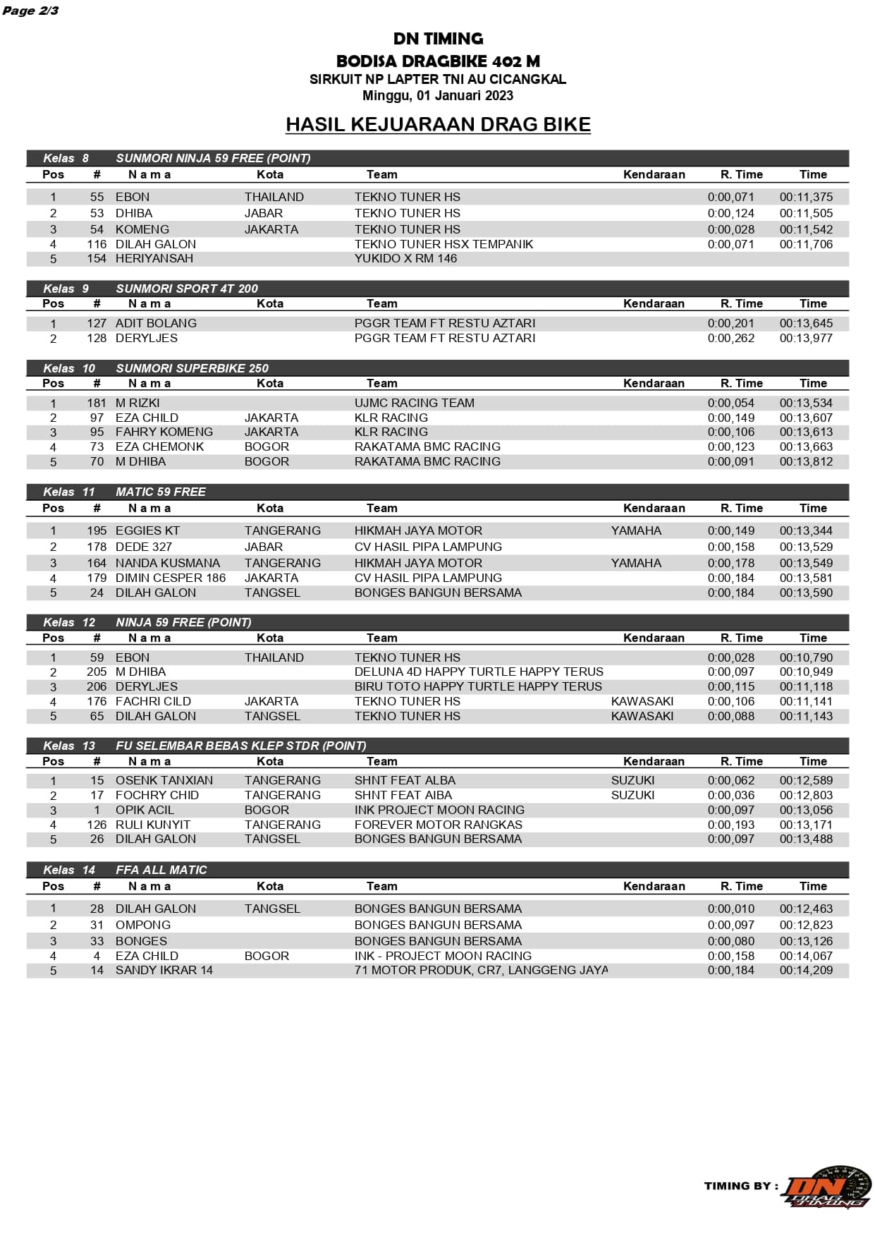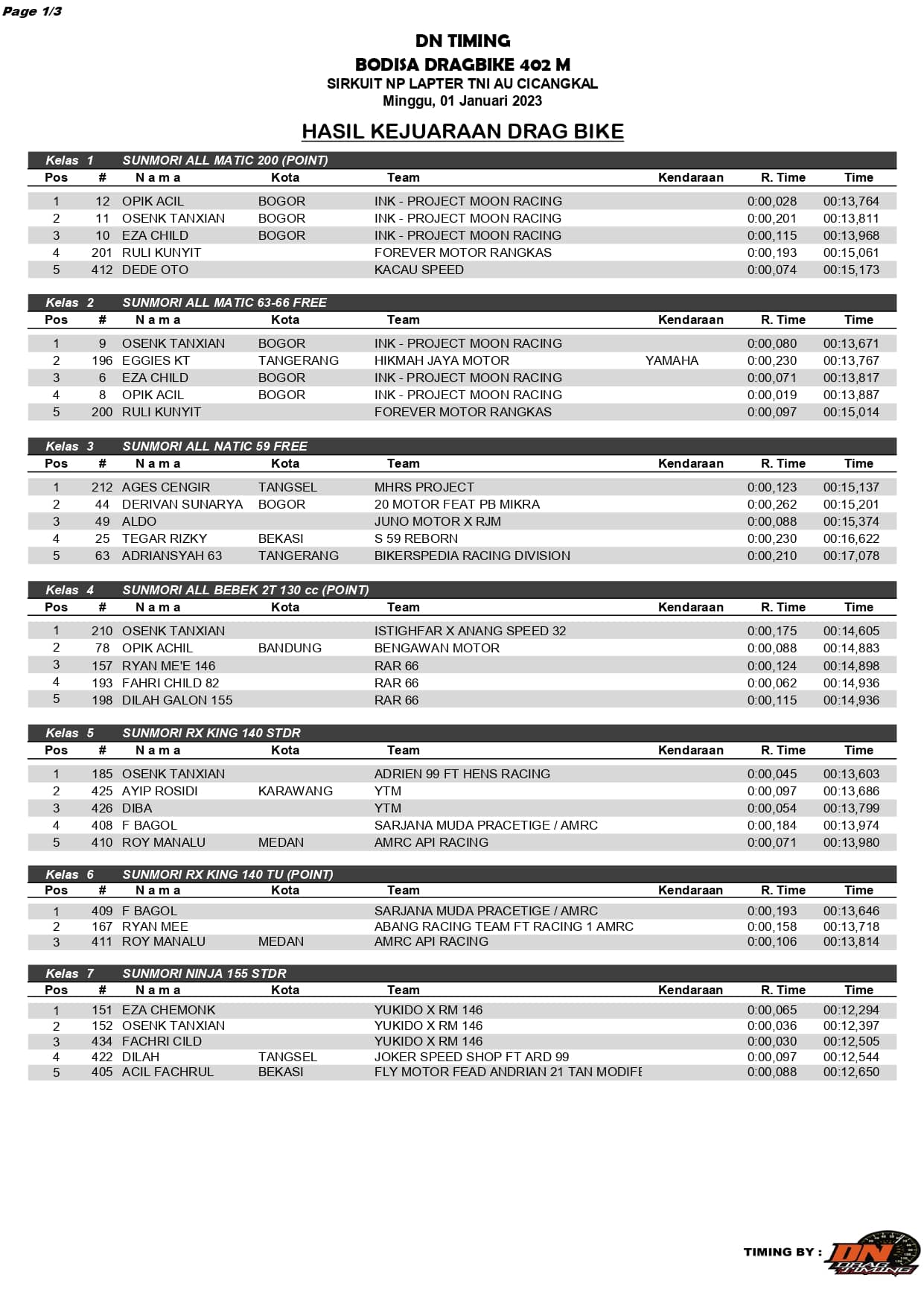 Berikut dari hasil lengkap lomba Bodisa Draf Bike 402 meter, di Sirkuit Non Permanen TNI-AU Cicangkal, Rumpin, Bogor – Jawa Barat yang berhasil Redaksi Otomotif Zone rangkum.
