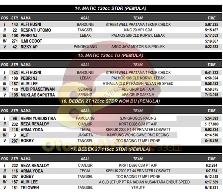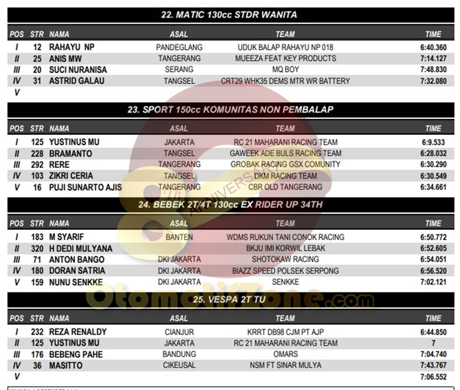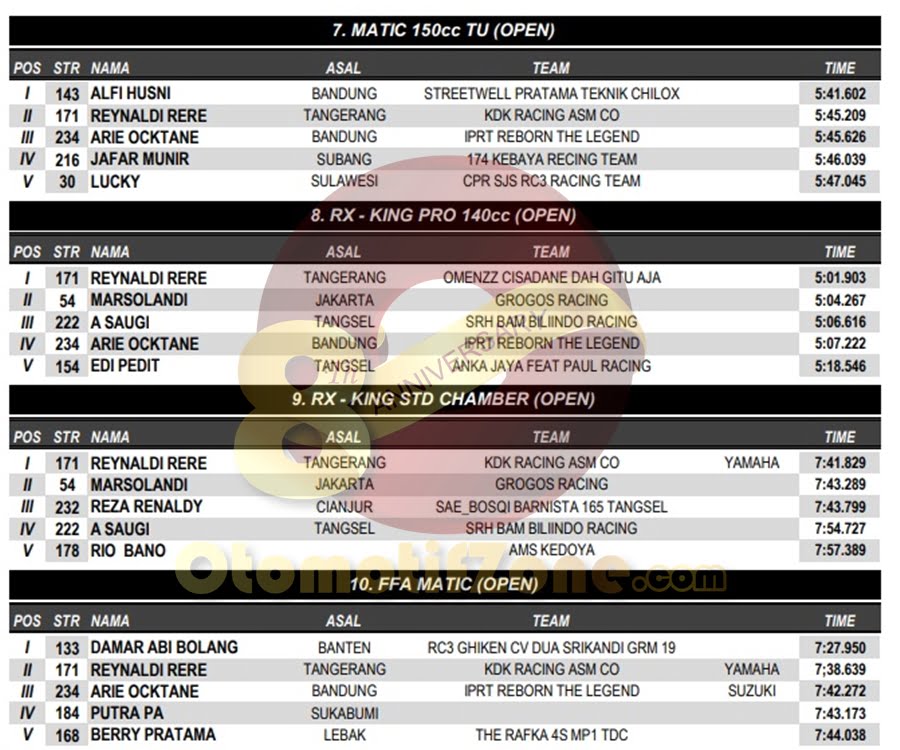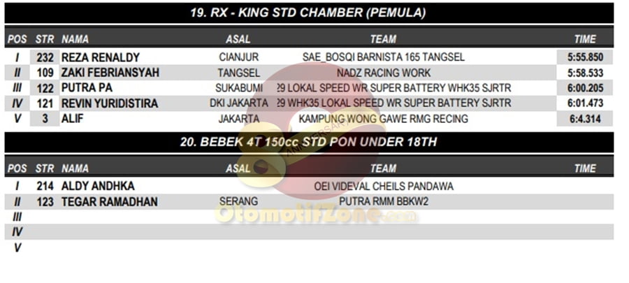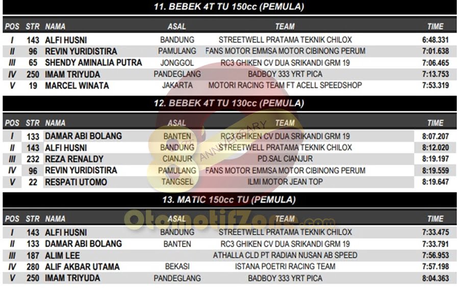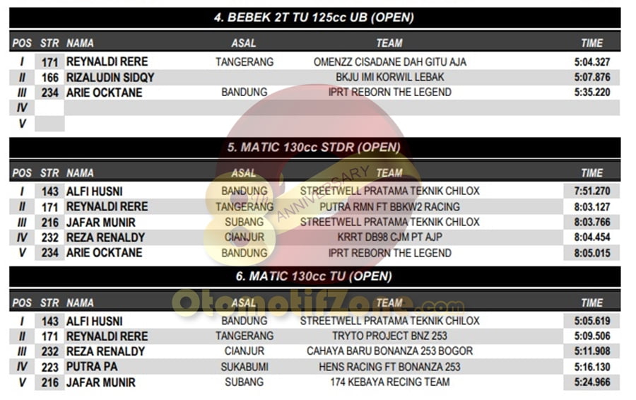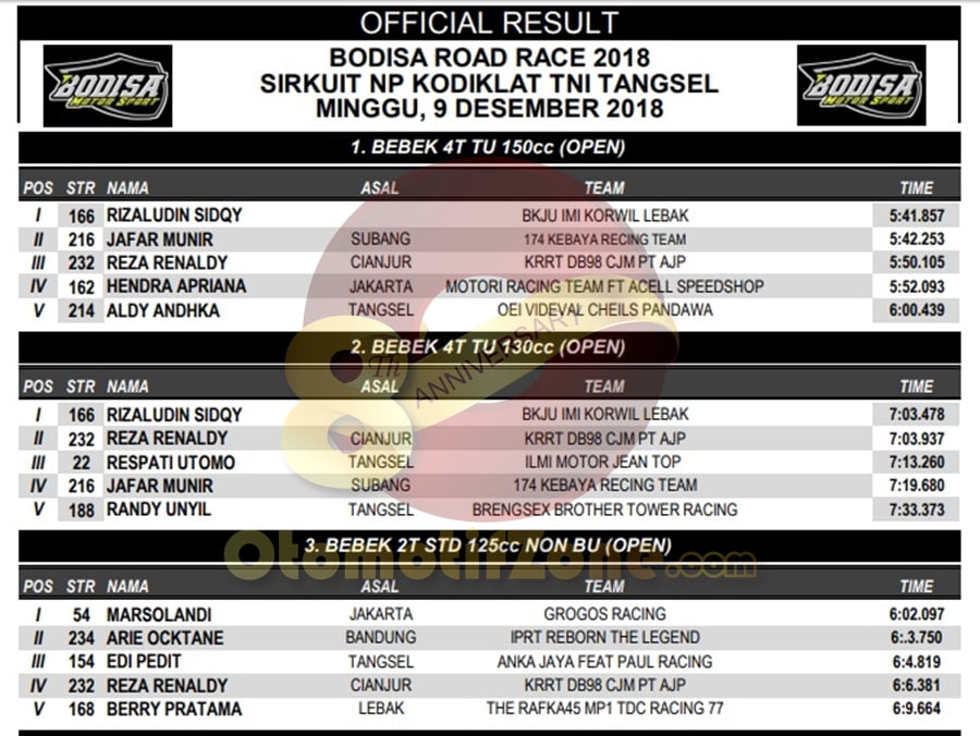 OtomotifZone.com – Banten. Usai sudah gelaran BODISA ROAD RACE 2018 yang diselenggarakan (9/12) di Sirkuit Kodiklat TNI, Tangerang Selatan. Peserta hadir dari segala penjuru daerah. Pembalap terbaik keluar sebagai juaranya. Berikut daftar juara di setiap kelasnya: