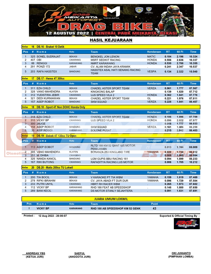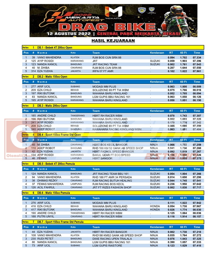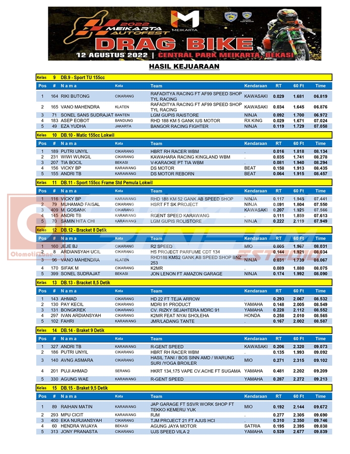 Penasaran dengan hasil lomba dari kegiatan balap motor roda dua tersebut? Yuk segera simak, hasil keseluruhan dari drag bike Meikarta Autofest 2022, yang berhasil Penulis rangkum.