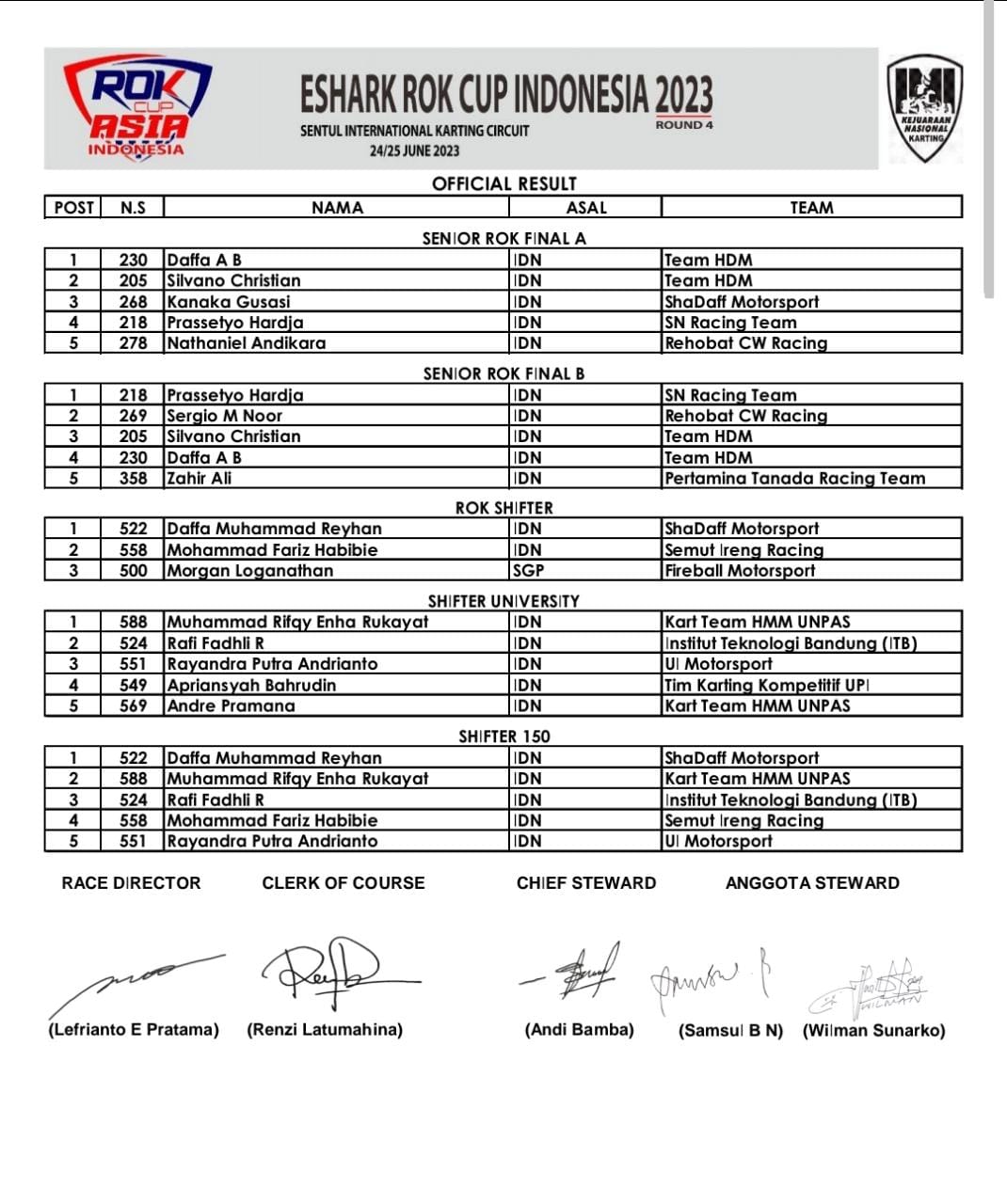 Sebut saja salah satunya Rafael Kamal yang mampu tampil Agresif. Lama tidak terlihat kali ini Rafa sapaan akrab pebalap cilik ini hadir dengan membawa bendera dari tim SN Racing. Ada juga muka muka lama yang hadir kembali di tahun 2023 ini. Lalu siapa saja yang menjadi juara? Berikut hasil lombanya: